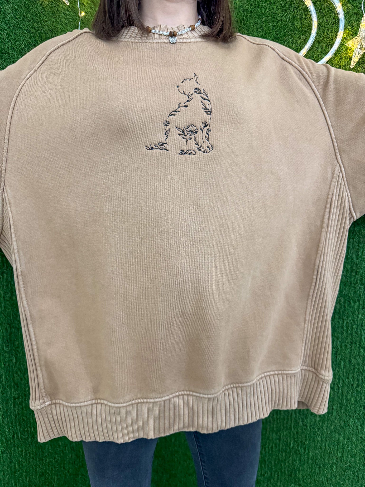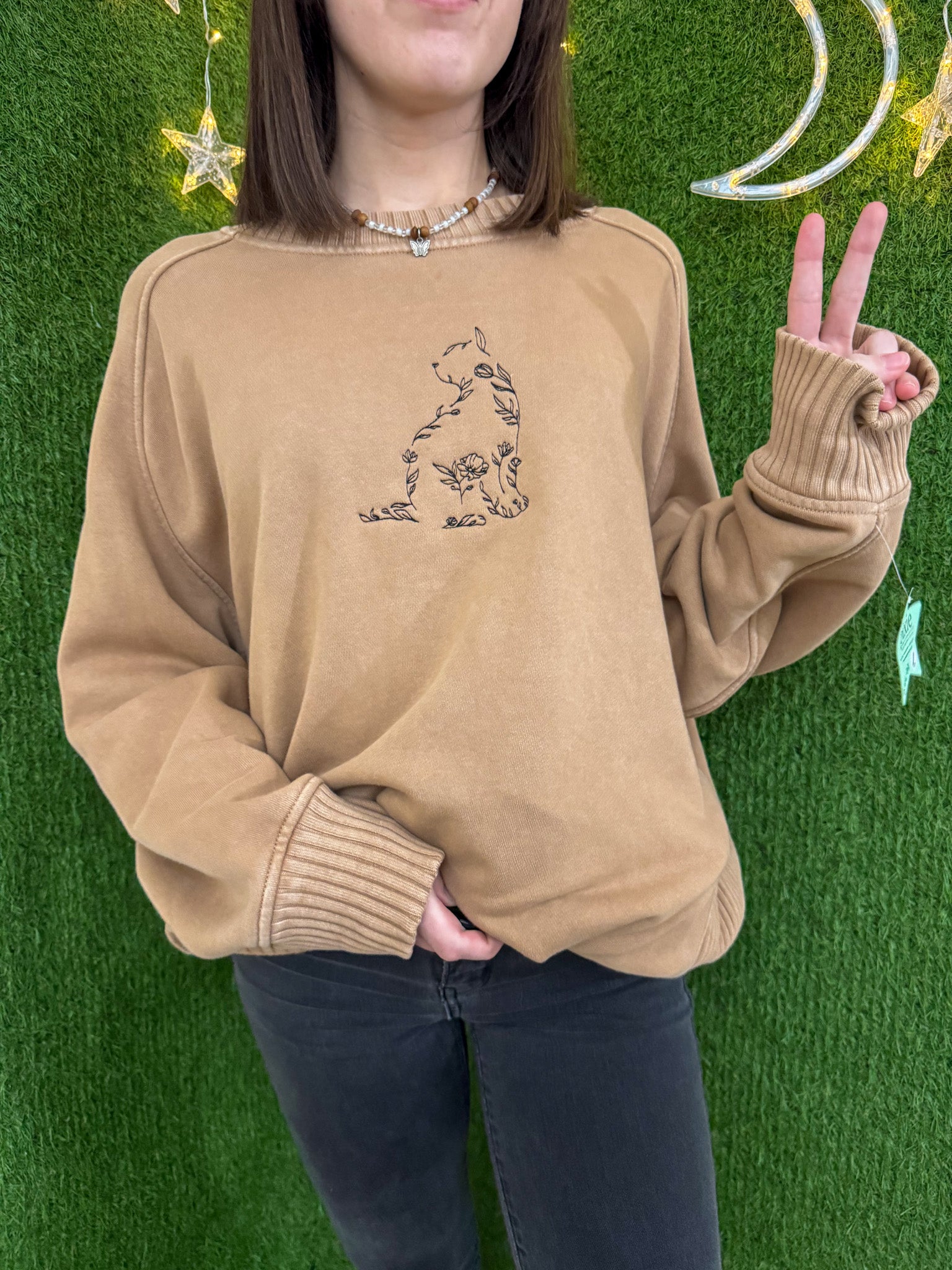 Purr-fect for the eco-conscious fashionista, our upcycled Floral Cat Brown Crewneck is both sustainable and stylish! Embroidered with love and support for our small biz, this slow fashion piece is a playful way to make a statement and reduce waste.
