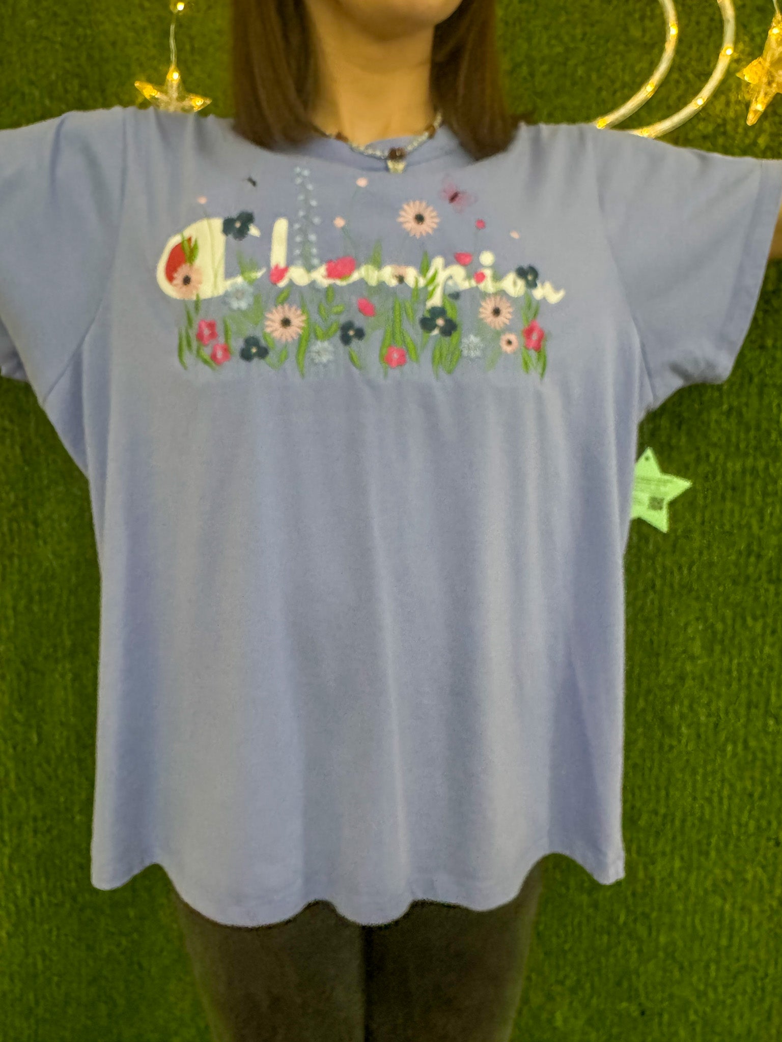 Look effortlessly cool in this Floral Champion Lilac T-Shirt. The embroidered design adds a fashionable twist, while supporting our small biz. Made from upcycled materials, this discarded secondhand garment is sustainable and embraces slow fashion. Join the movement and make a statement!