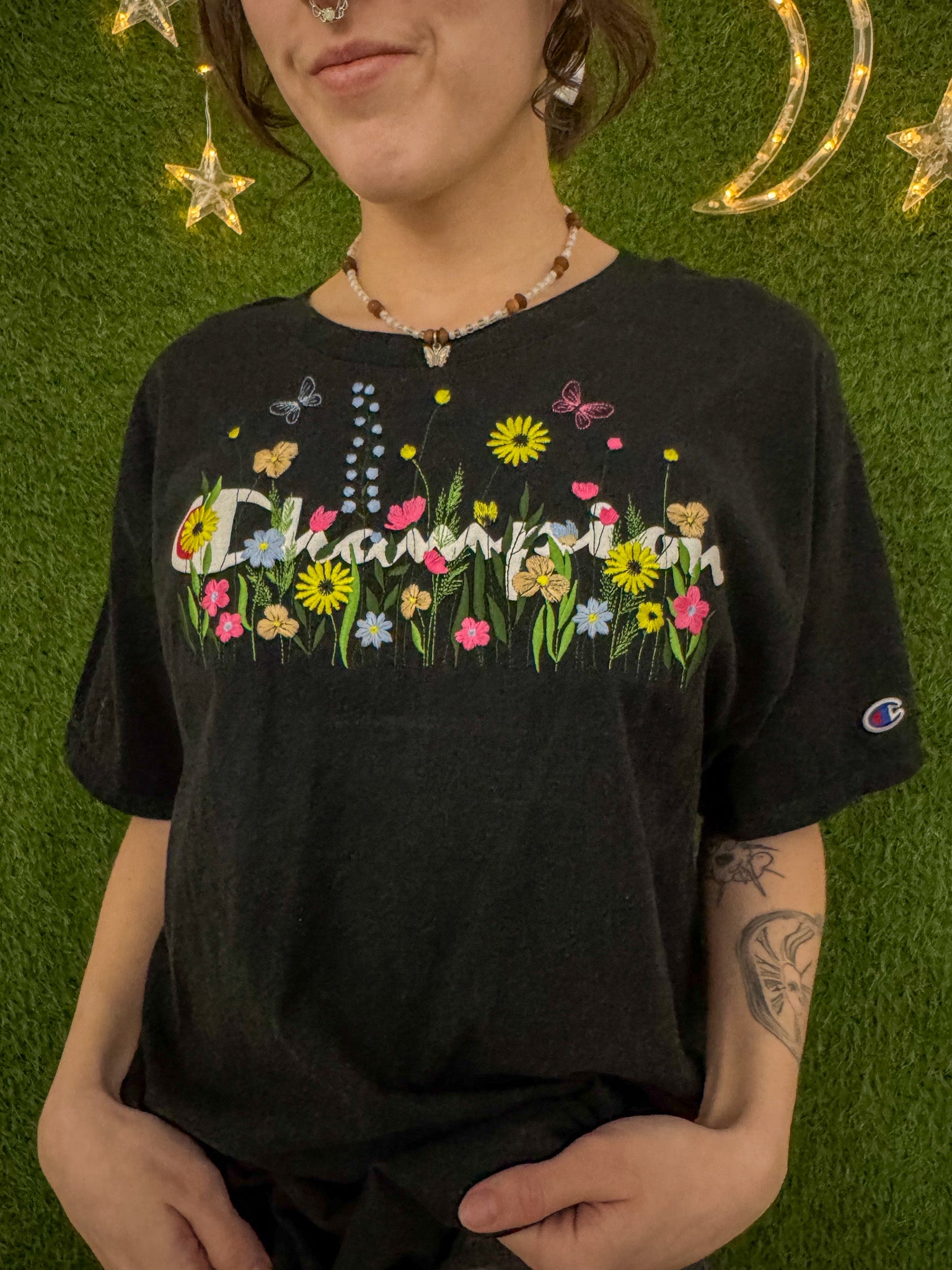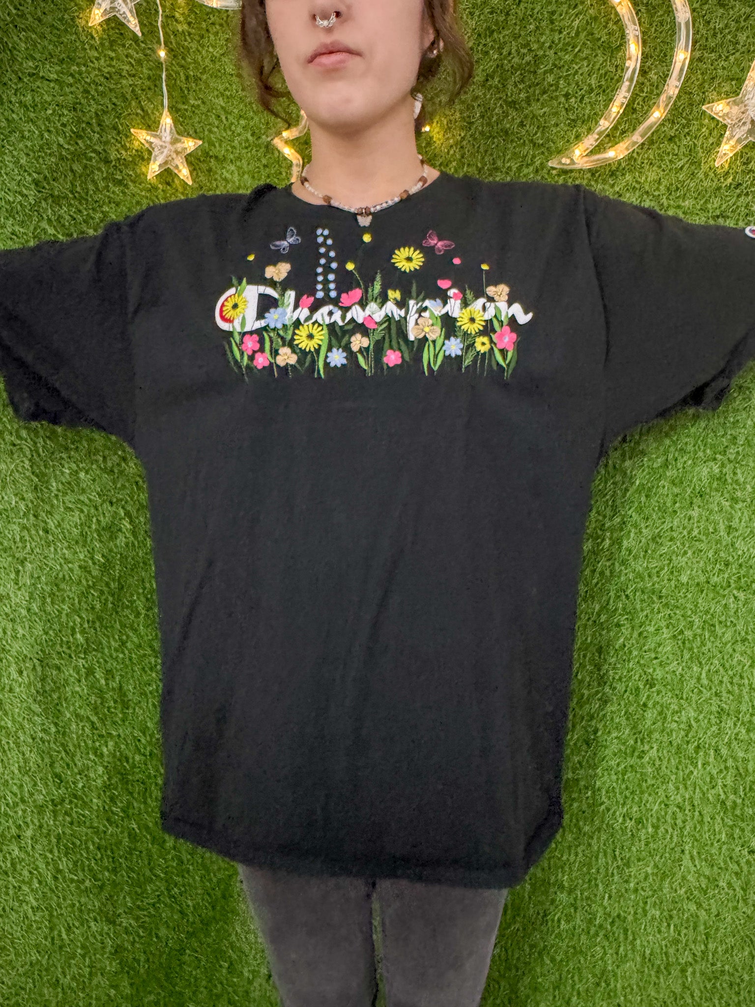 Join the sustainable fashion movement with our Floral Champion T-Shirt. This upcycled, secondhand garment features delicate embroidery, making it the perfect way to support small businesses while embracing slow fashion. Look good and feel good about your eco-friendly fashion choices!