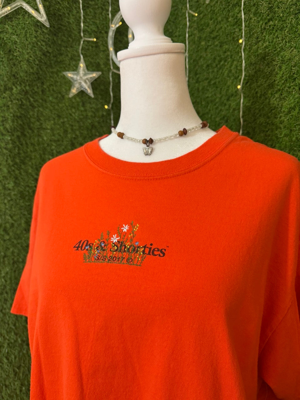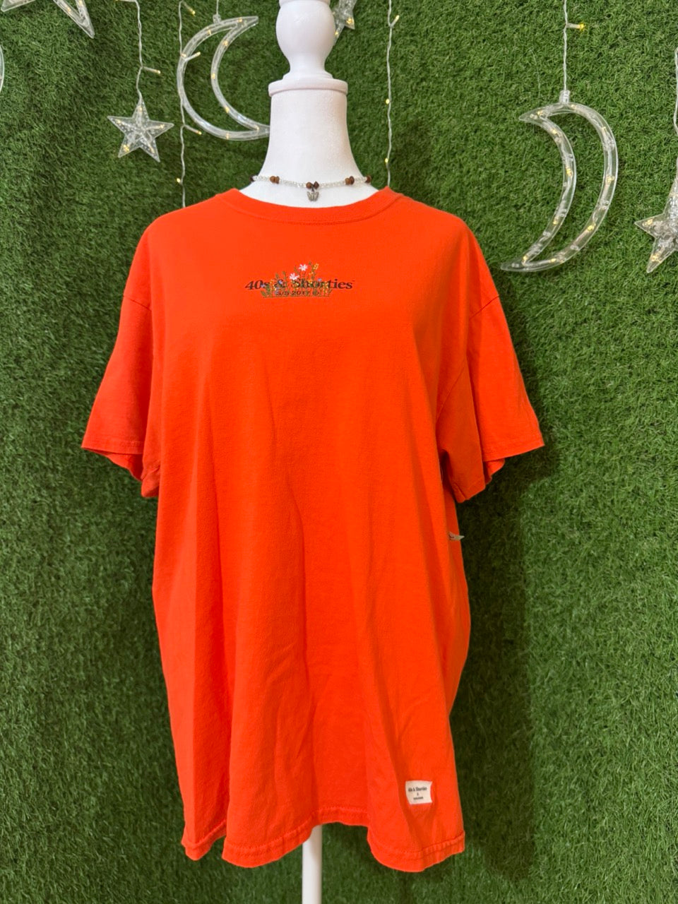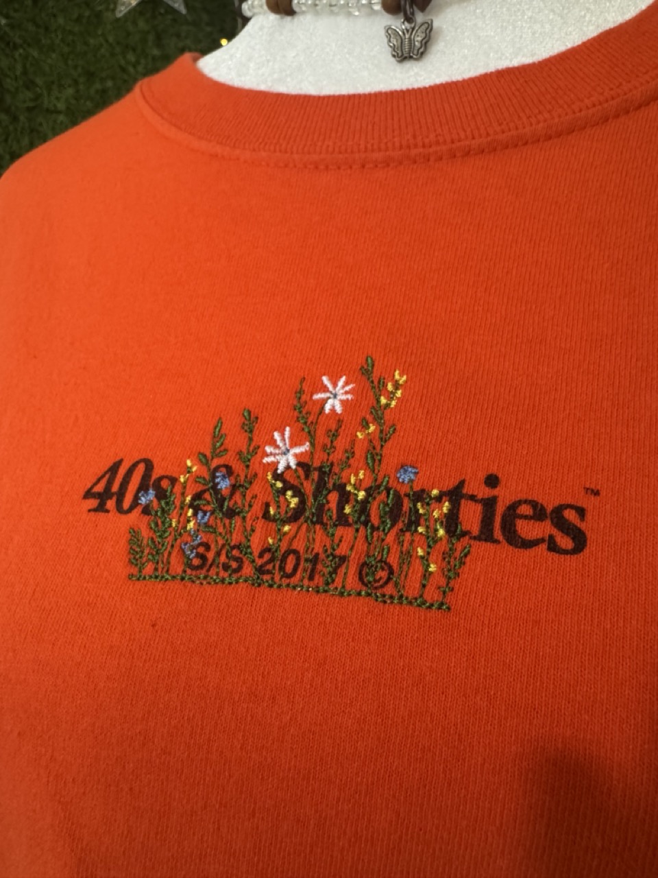 Step into sustainable style with this playful Floral Cover Up upcycled on a secondhand 40's & Shorties orange tee. Each embroidered detail adds charm while honoring slow fashion values, turning a secondhand gem into a fresh, vibrant statement piece perfect for those who love uniqueness with a conscience!