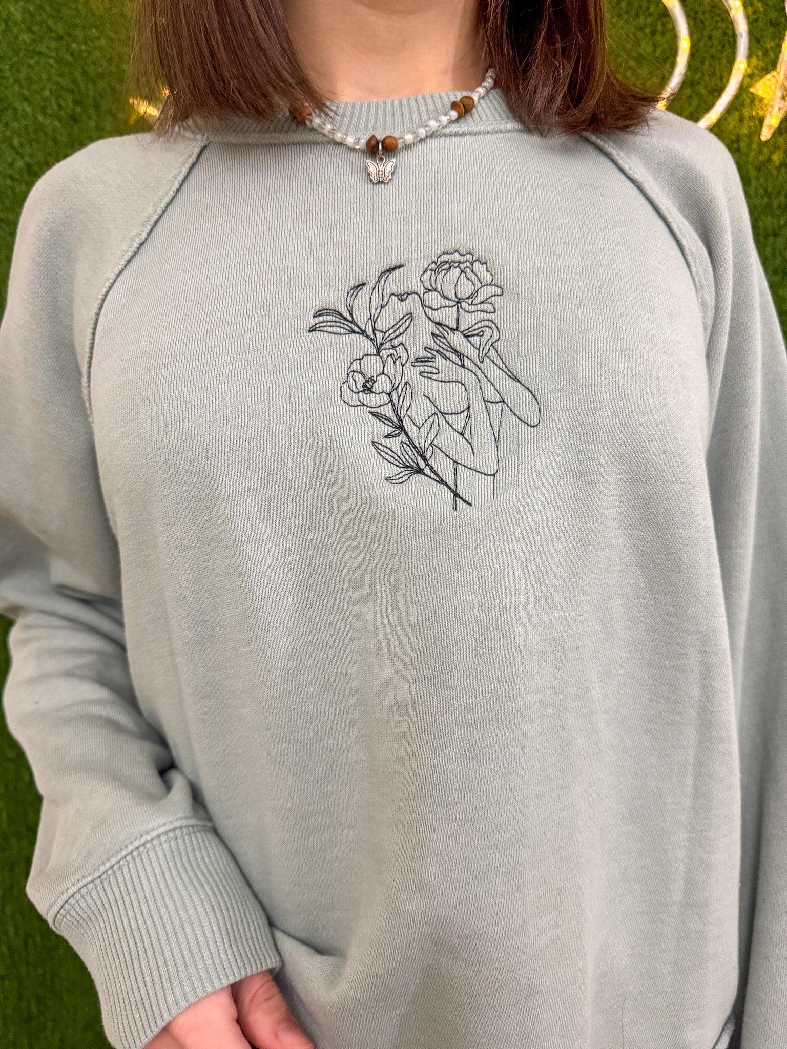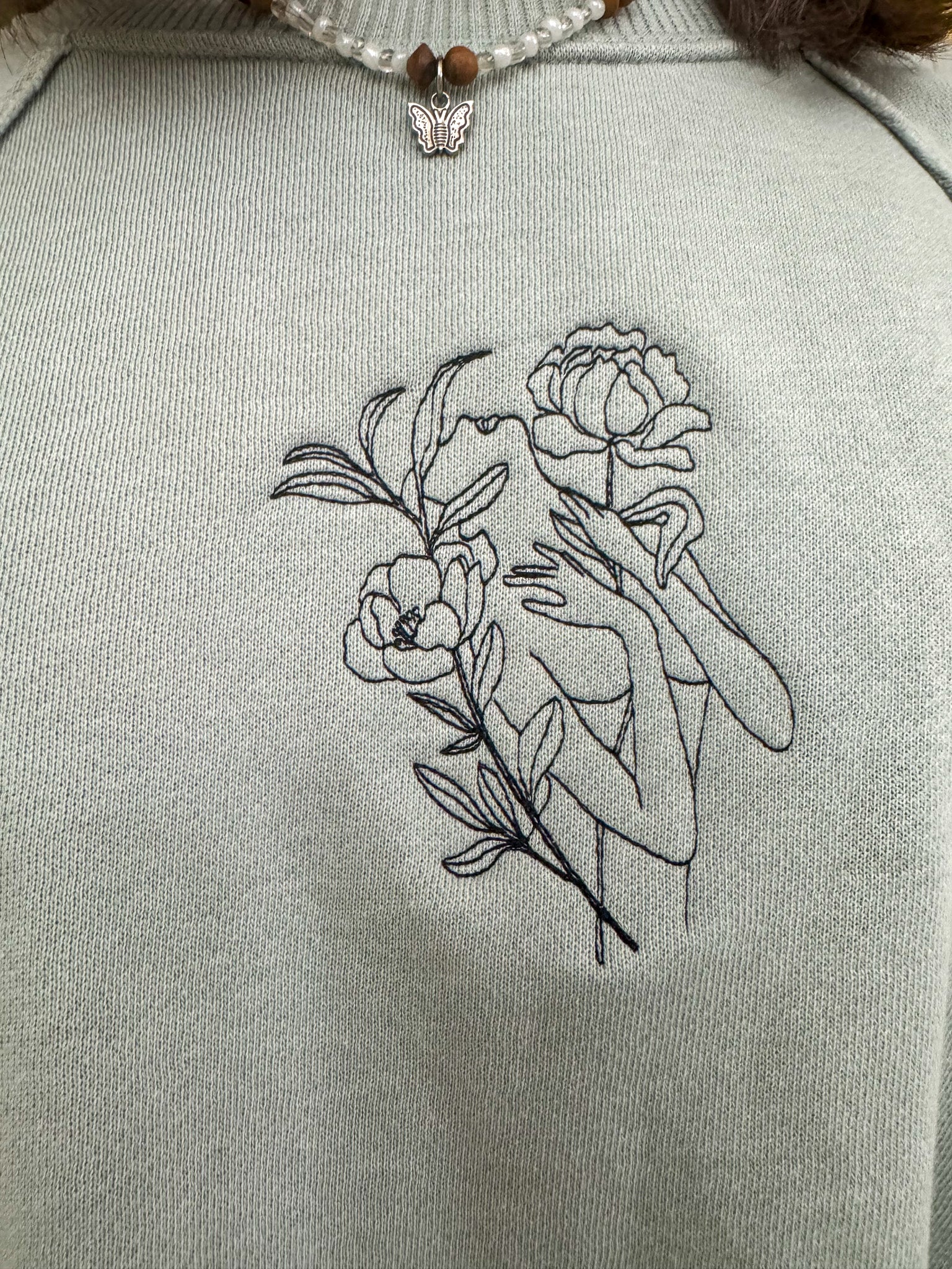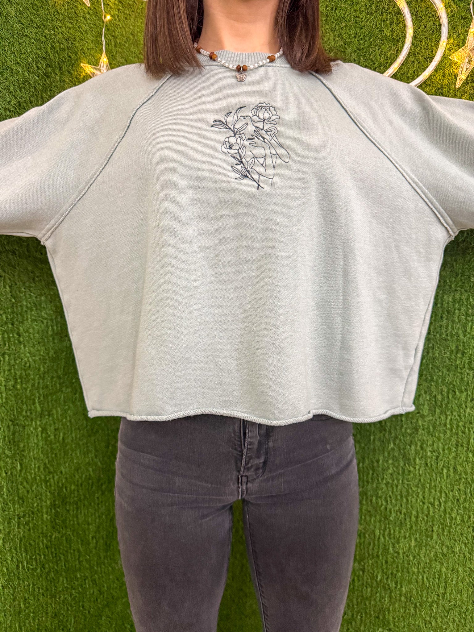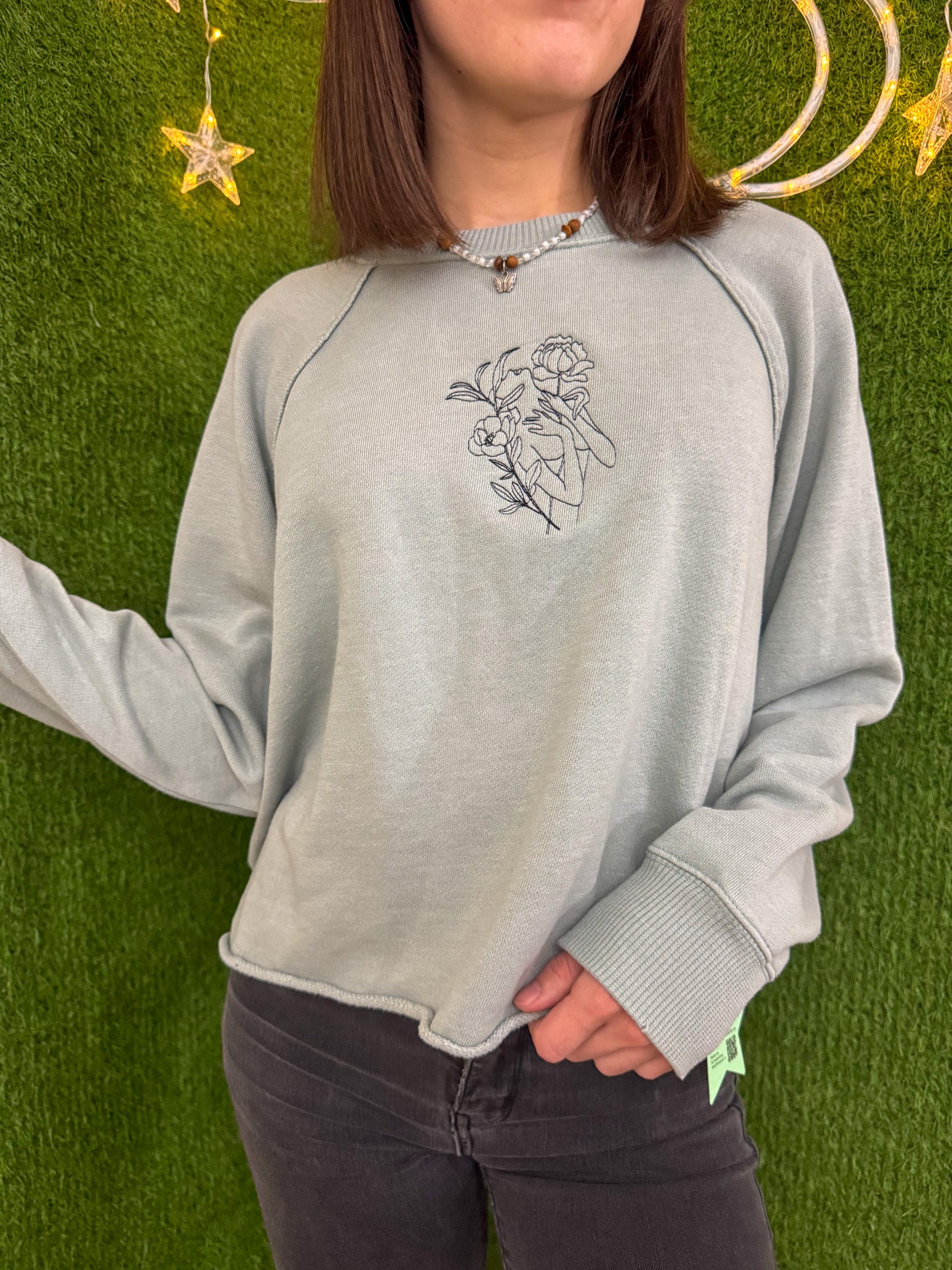 Upgrade your style with our Floral Woman Cropped Crew! This top is not only stylish but also supports small businesses and sustainable fashion. Its embroidered design adds a unique touch, while being upcycled and secondhand makes it an eco-friendly and slow fashion choice<3