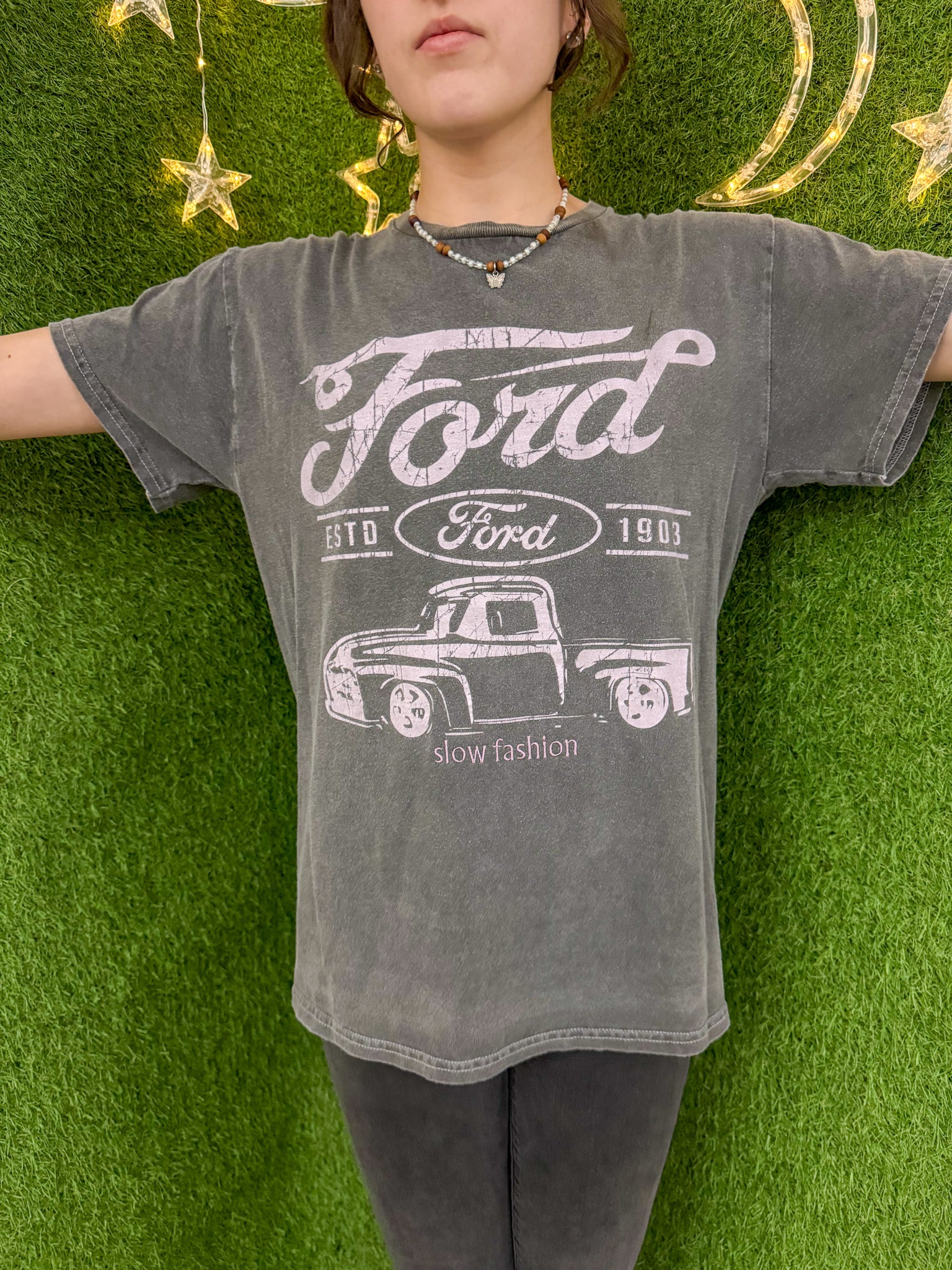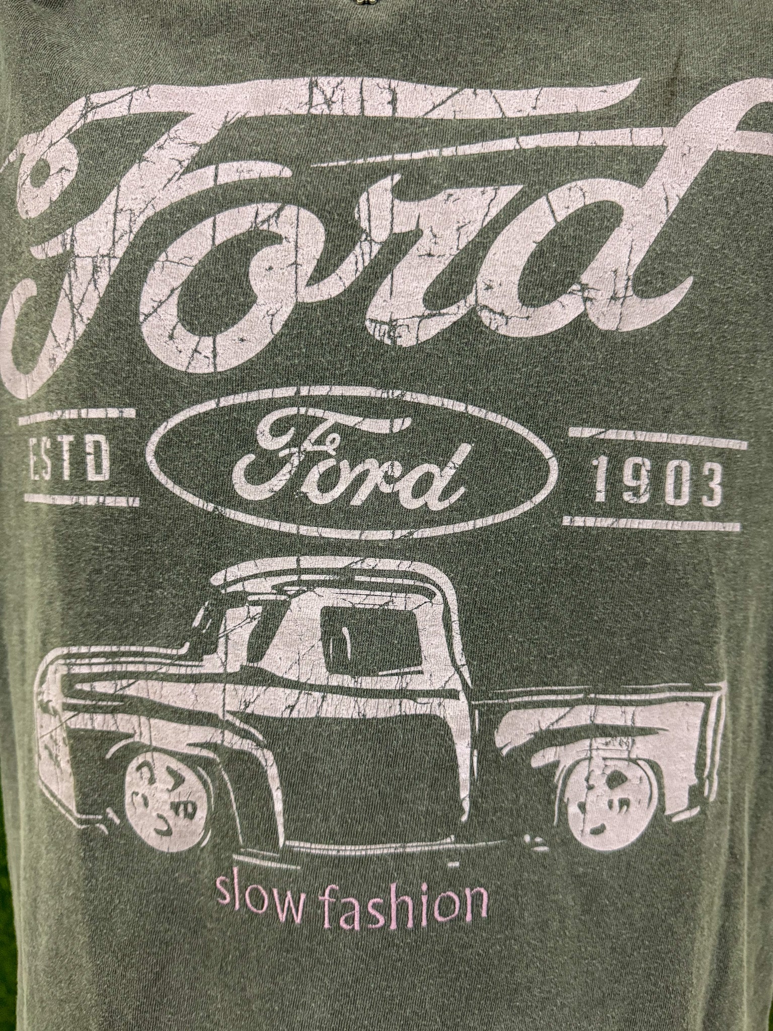 Support sustainable and slow fashion with our Ford embroidered Slow Fashion T-Shirt. Upcycled from a secondhand garment, this tee not only promotes a unique and stylish look, but also supports small businesses. Join the movement for a more eco-friendly and conscious way of dressing!