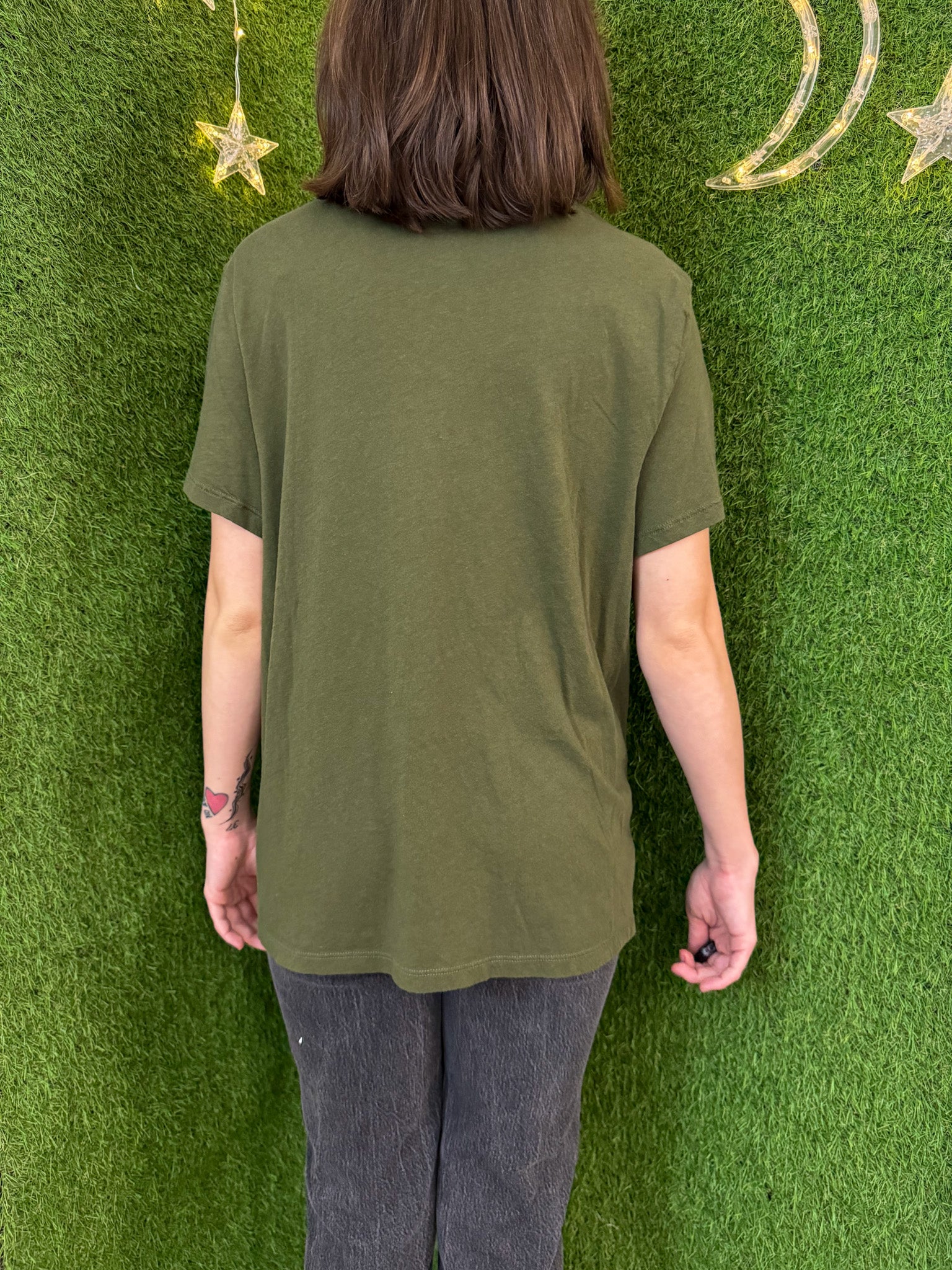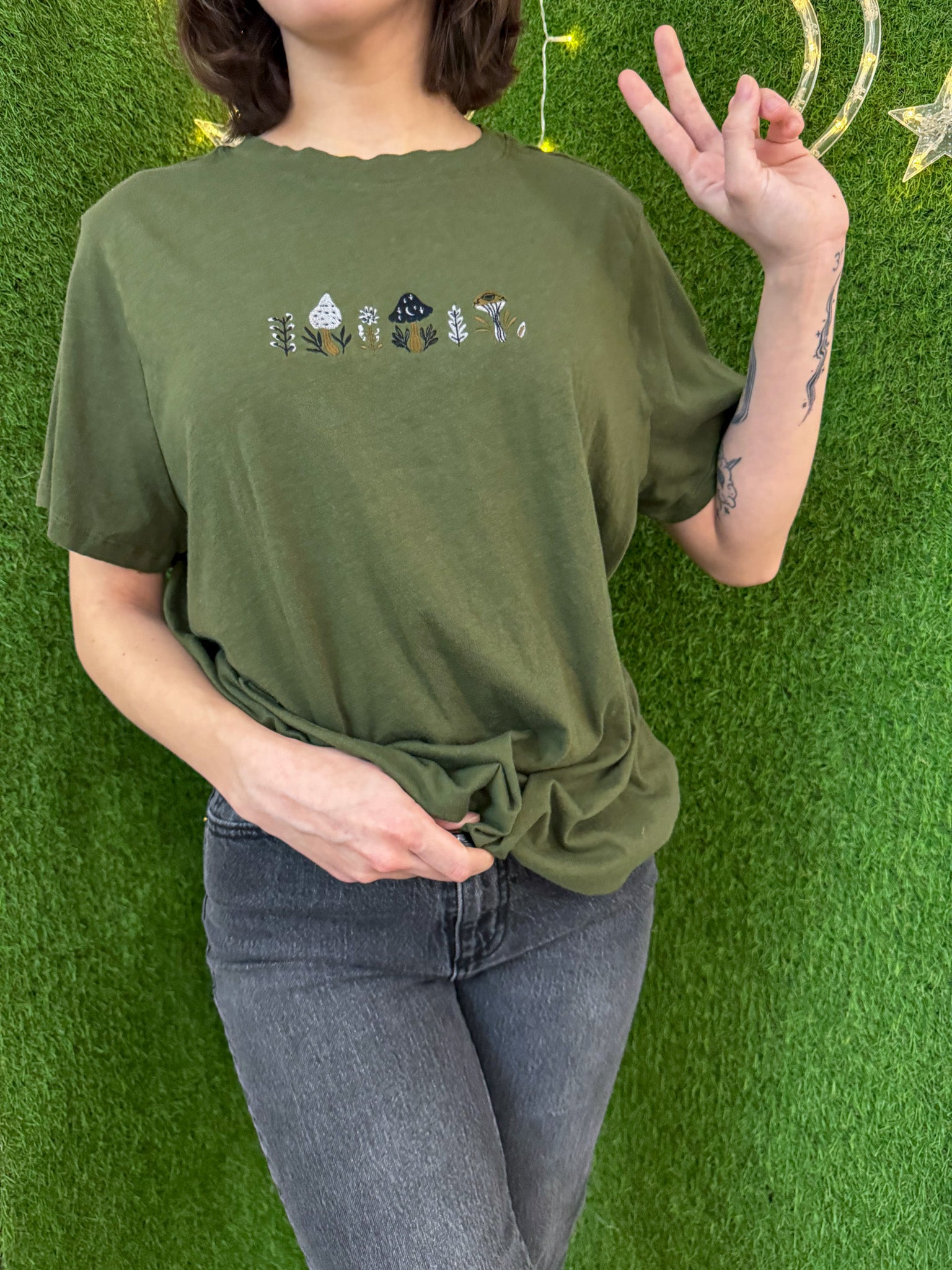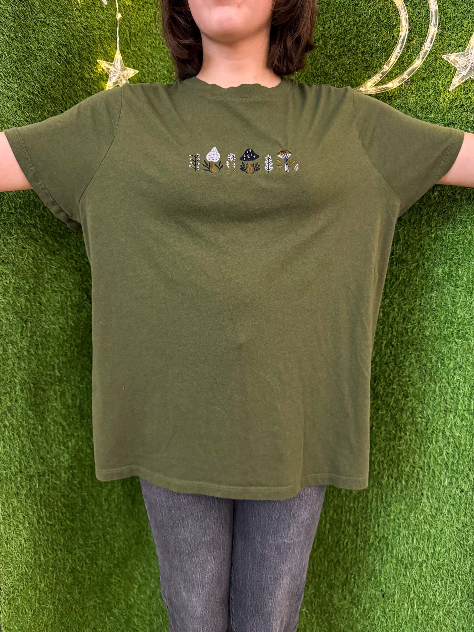 Add a pop of color to your wardrobe with our Funky Mushroom Green T-shirt! Upcycled on a secondhand garment, this sustainable and stylish top features an embroidered design. Show your support for small businesses while embracing slow fashion. Upgrade your look today!