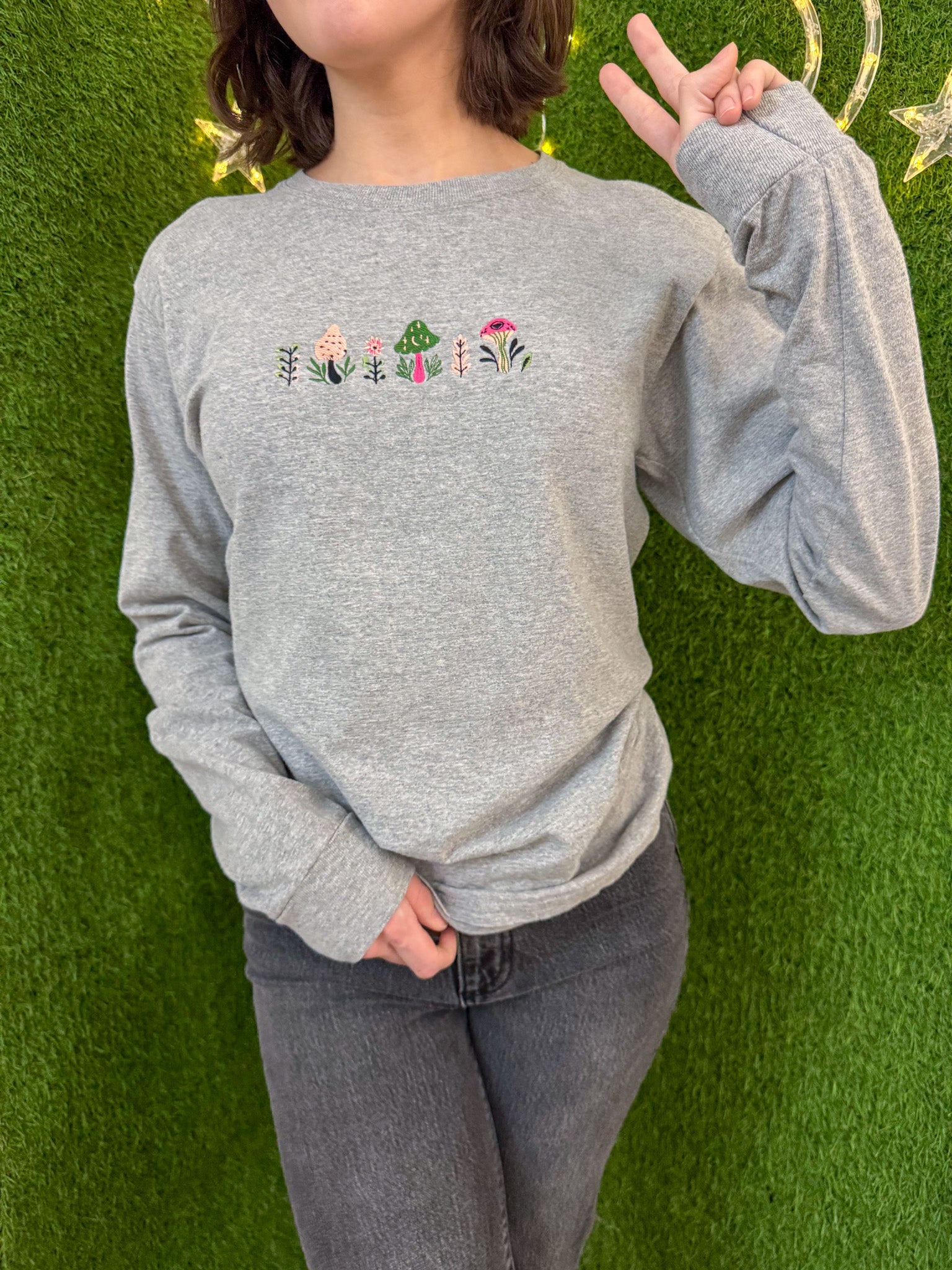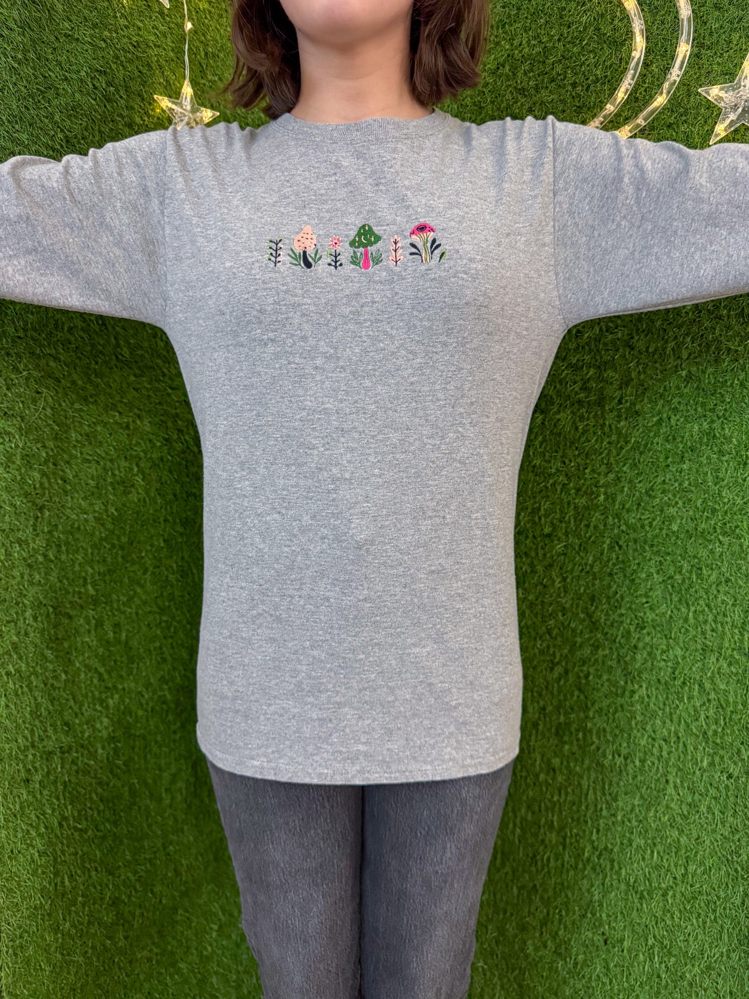 Elevate your style with our Funky Mushroom Grey Long Sleeve. Made with love, this embroidered top supports small businesses and sustainable fashion. Each piece is unique, upcycled from a secondhand garment, making it a statement of your commitment to slow fashion. Time to make a trendy, conscious choice!