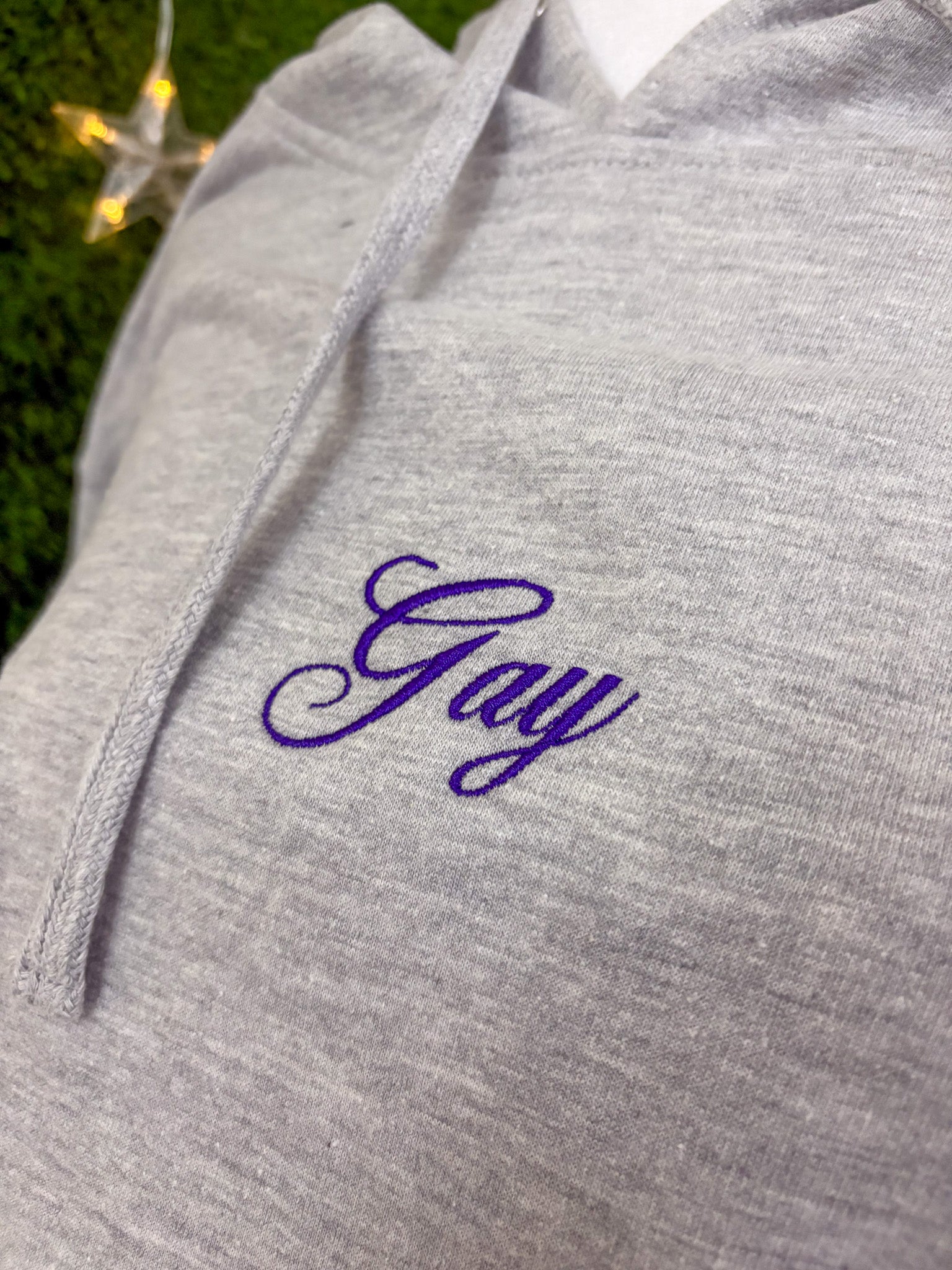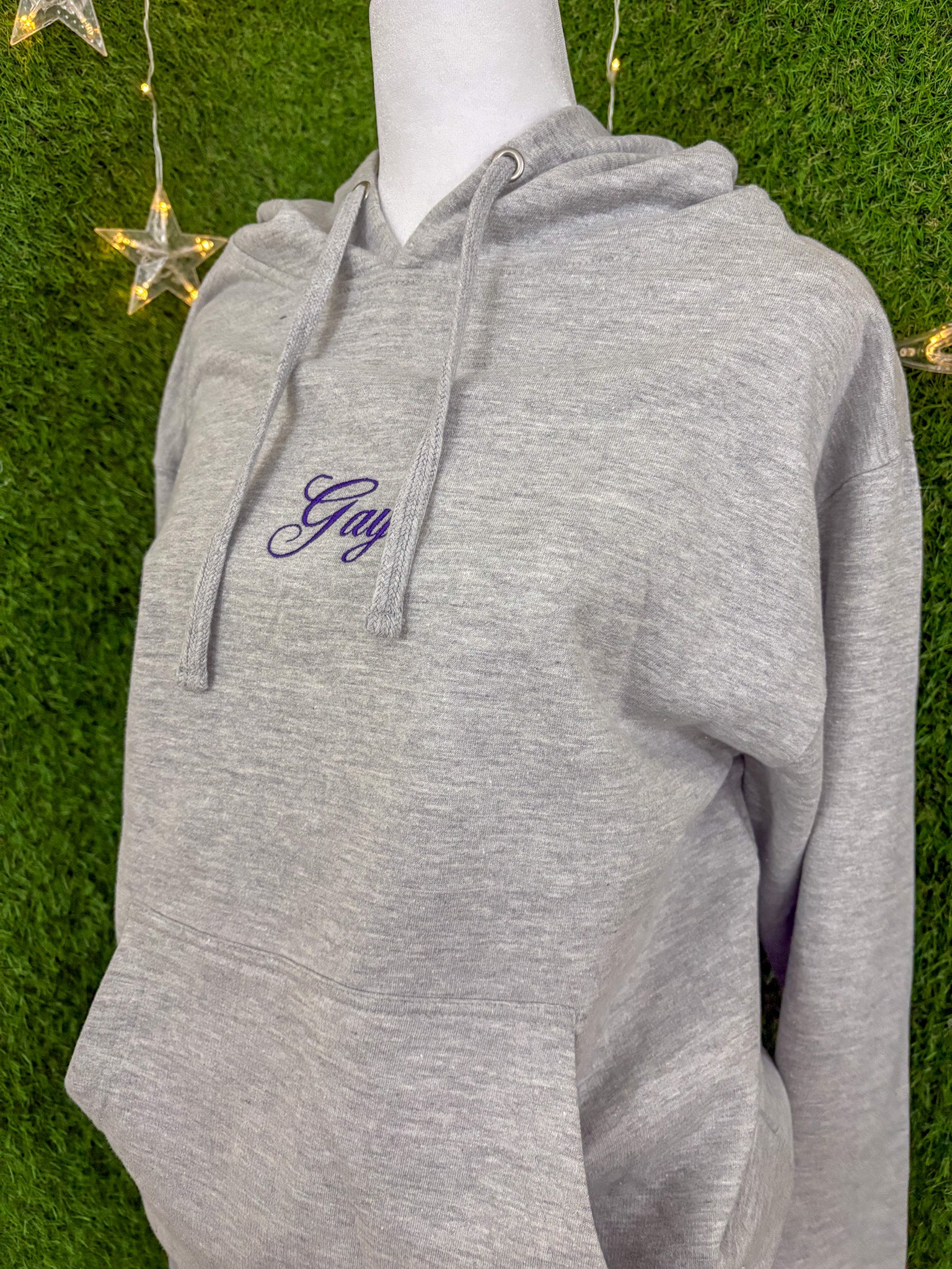 This Gay Grey Hoodie is an embroidered, upcycled piece made from secondhand fabric. Supporting small businesses, it embraces sustainable, slow fashion for a greener wardrobe<3