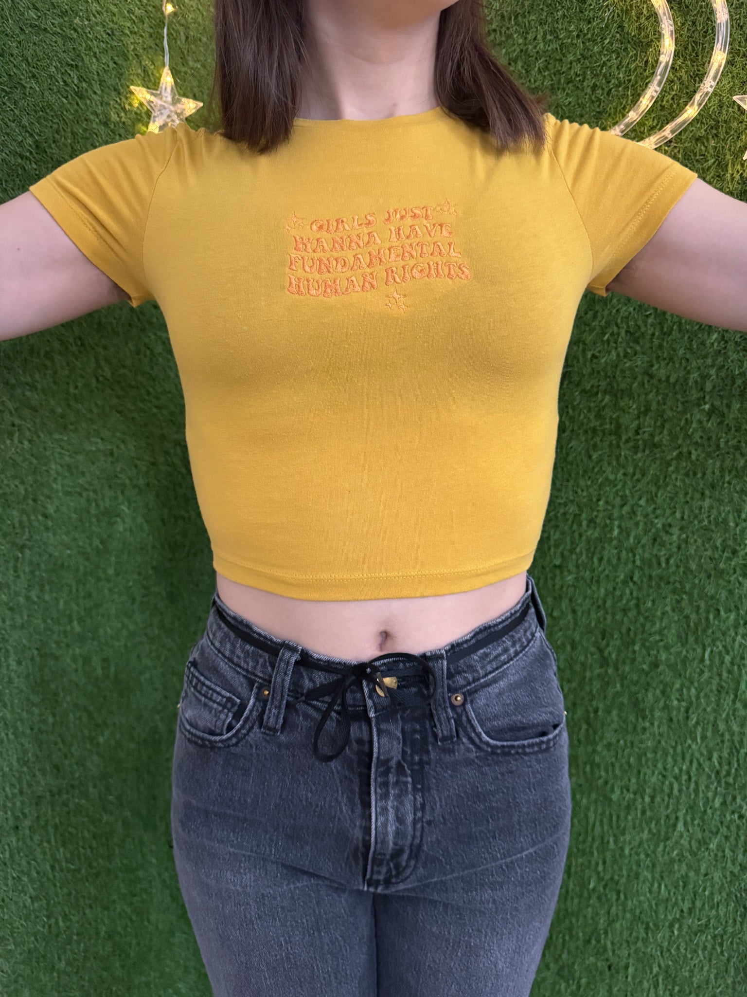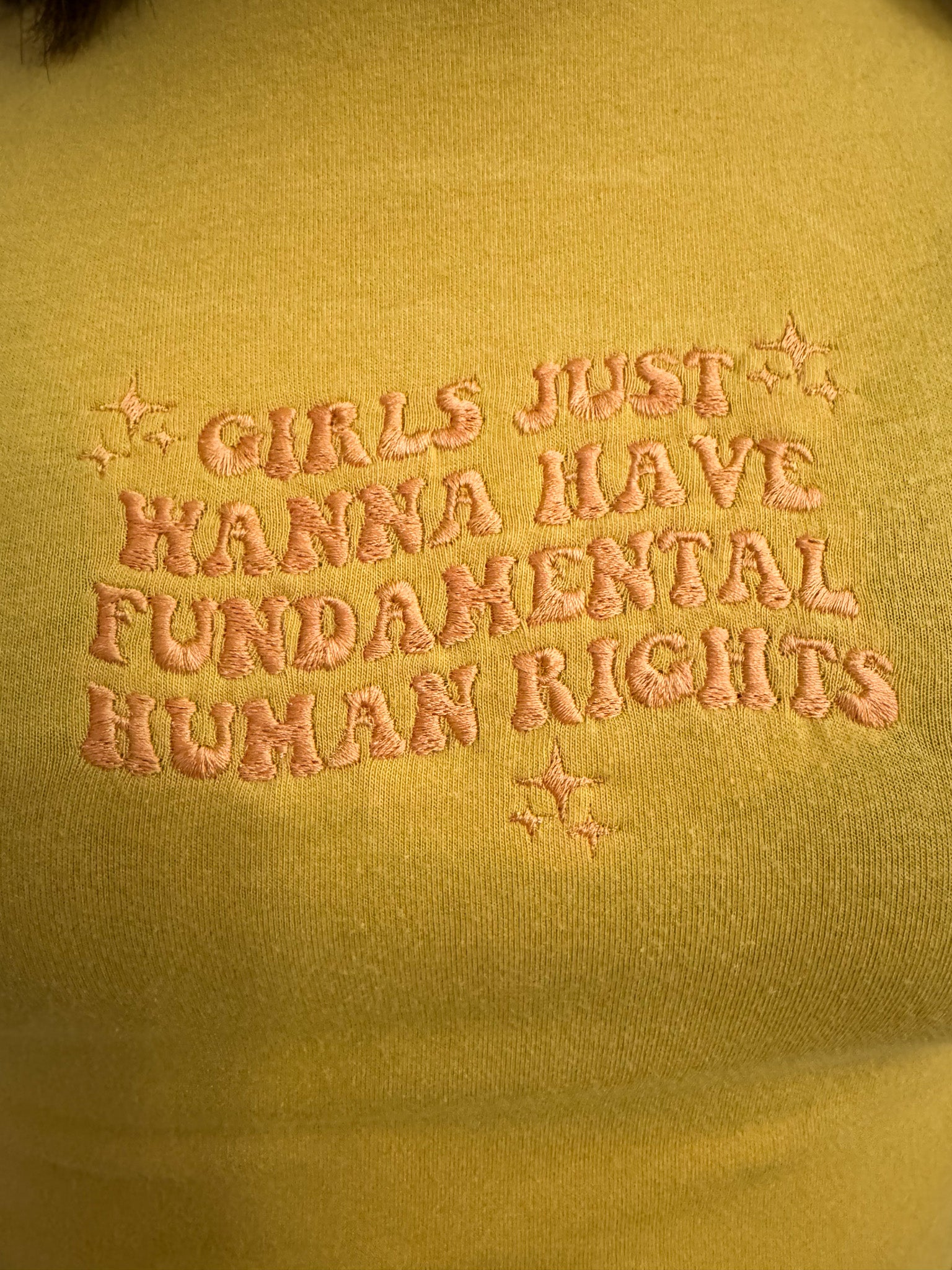 Rock your style while standing up for justice with our Girls Just Wanna Have Fundamental Human Rights Baby Tee. This embroidered shirt supports small businesses and is an upcycled secondhand garment for a sustainable and slow fashion statement!