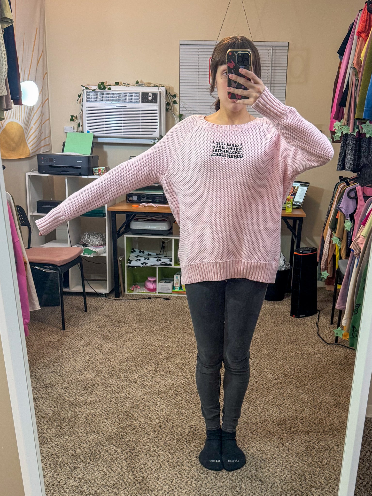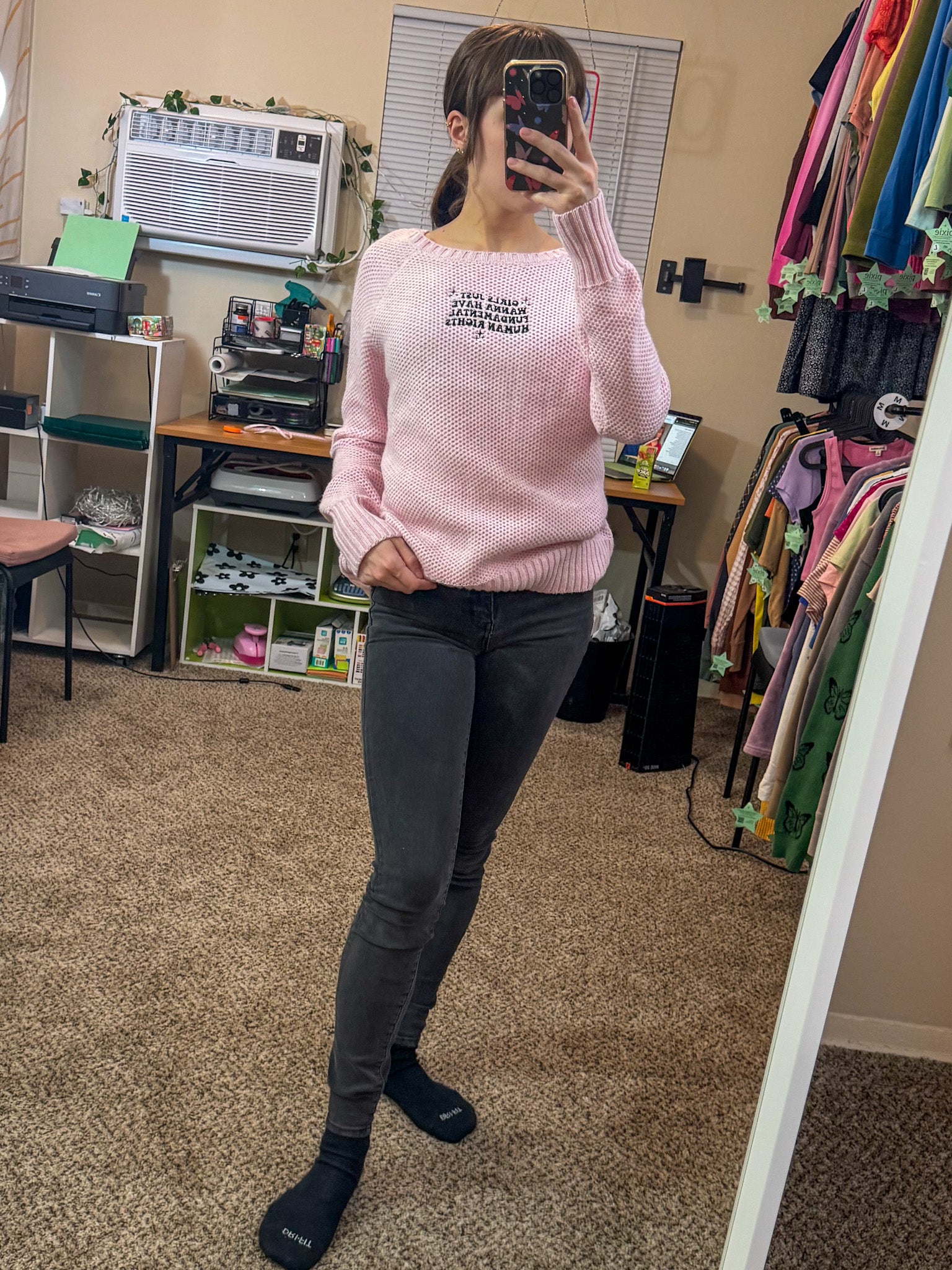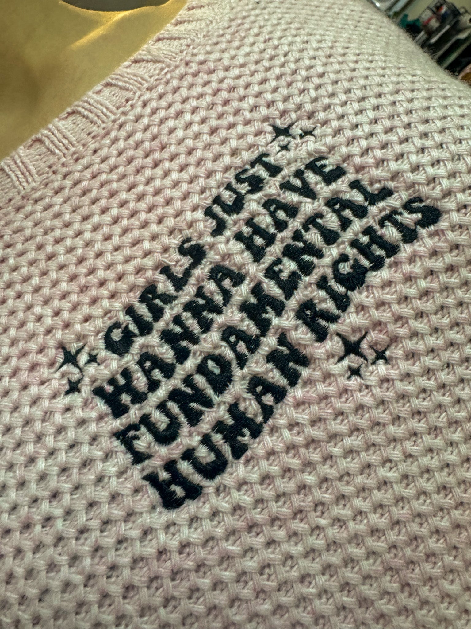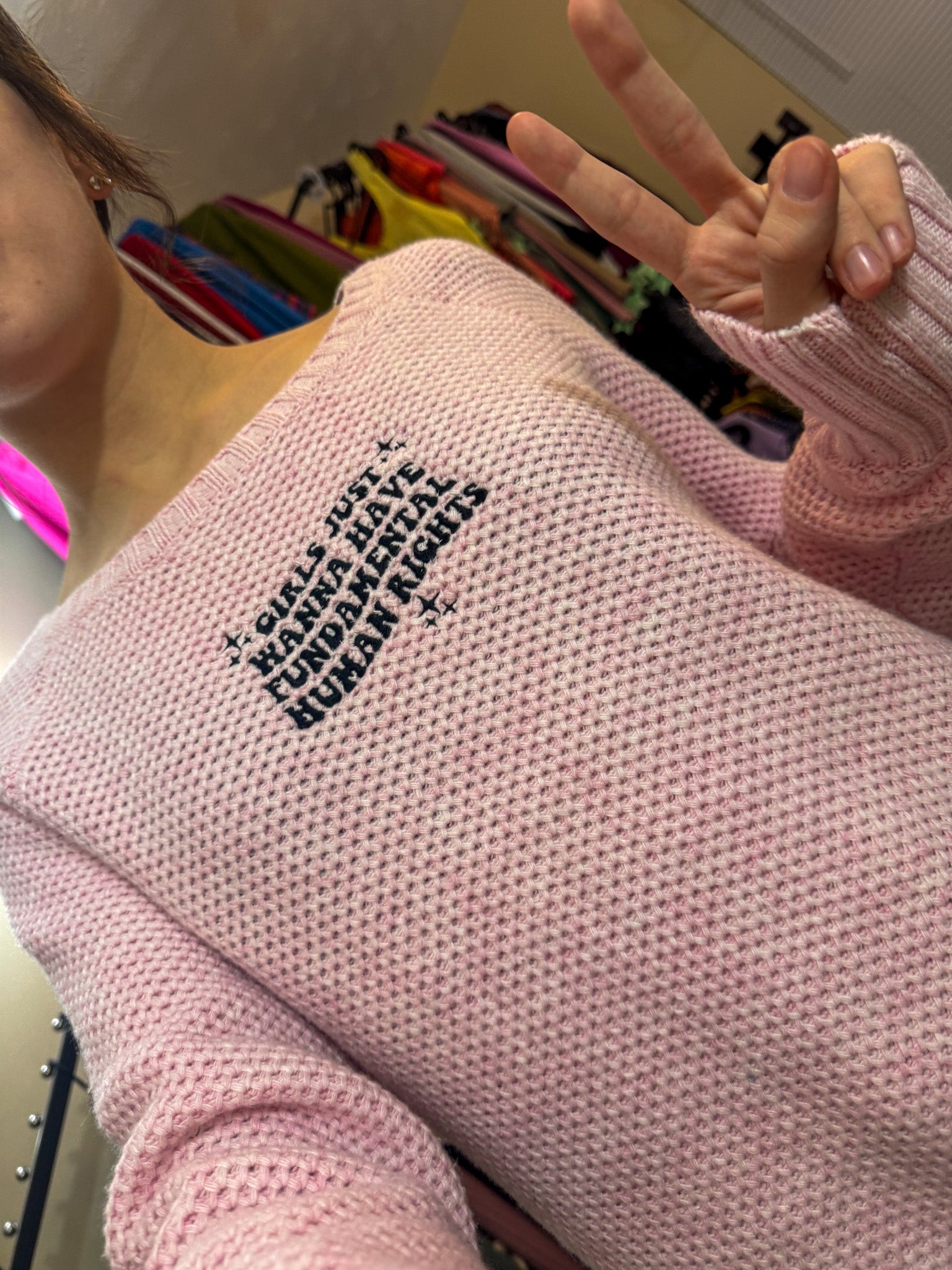 Make a statement with our Girls Just Want Fundamental Rights Pink Sweater. Embroidered by us and upcycled from a discarded secondhand garment, it's both sustainable and supports our small biz. Slow fashion never looked so good!