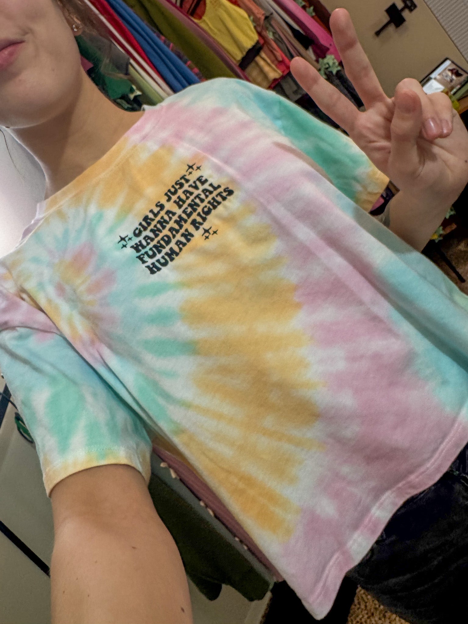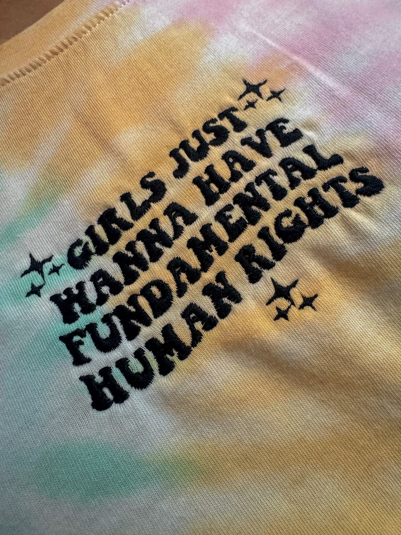 Get your hands on this funky Girls Just Want Fundamental Rights tie dye cropped tee. Each one is embroidered by us and upcycled from a discarded secondhand garment, making it not just a stylish addition to your wardrobe, but also a sustainable choice that supports our small biz. Slow fashion never looked so good!