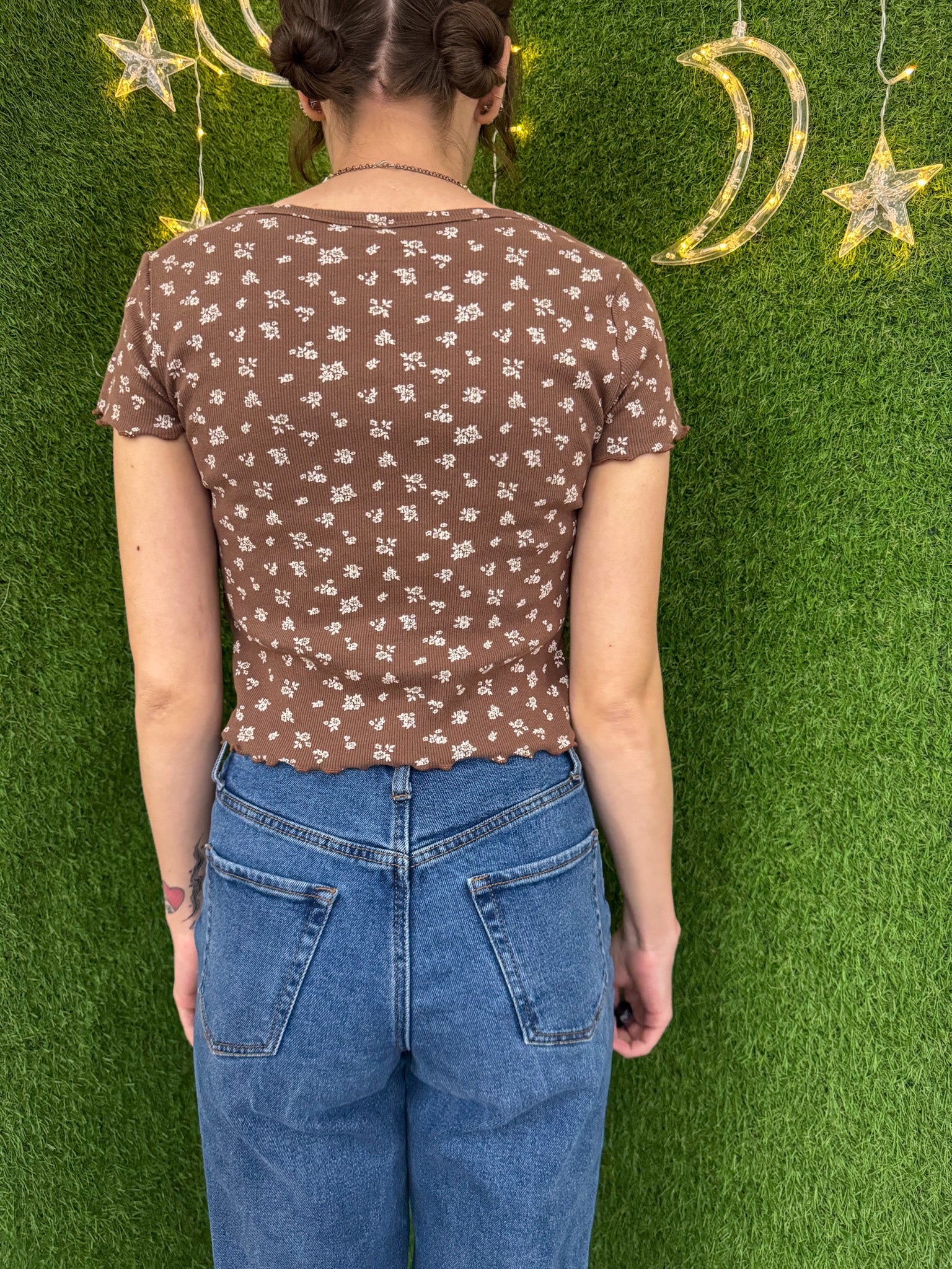Support small businesses while looking stylish in our Gold Dust Woman Brown Floral Baby Tee. Made sustainably and with care, this upcycled secondhand garment features beautiful embroidered details. Choose slow fashion and make a positive impact with your purchase!