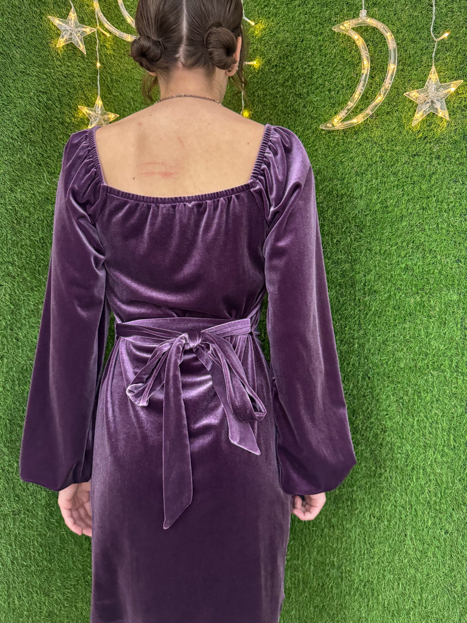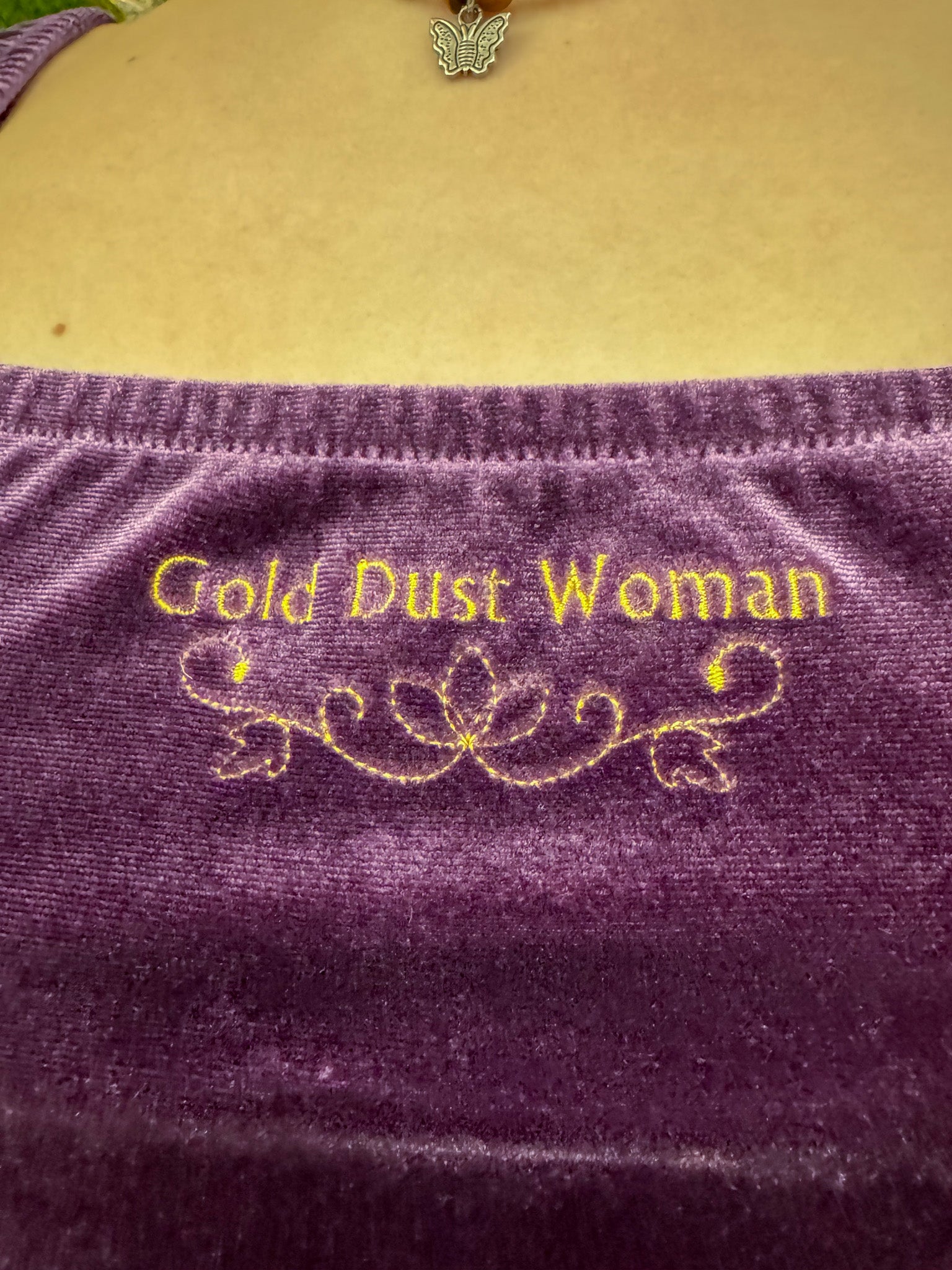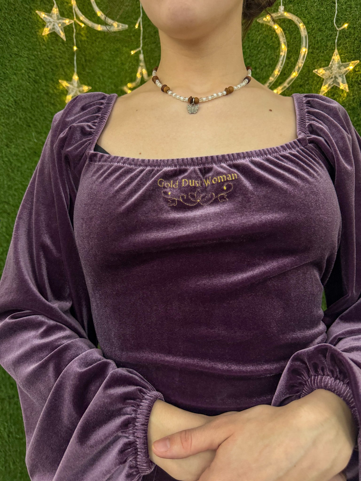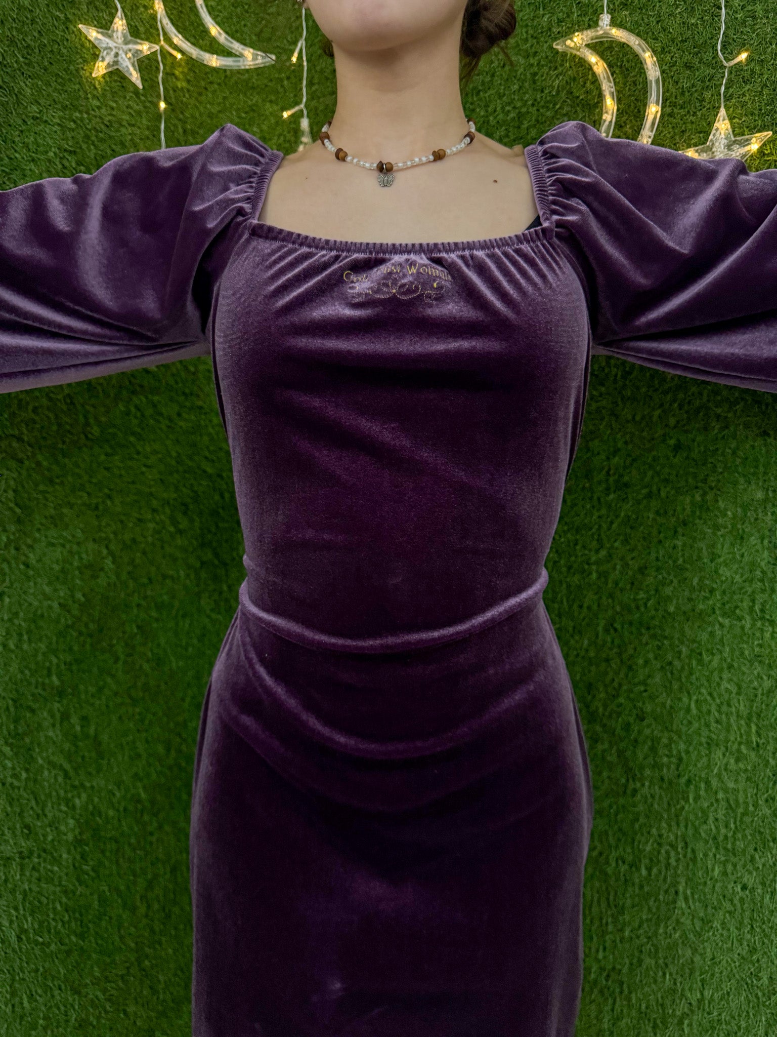 Channel your inner witch in our Gold Dust Woman Purple Velvet Dress. This secondhand, upcycled garment features beautiful embroidery, supporting small businesses and sustainable fashion. Look great and feel good knowing you're making a planet-friendly fashion choice with this slow fashion piece<3