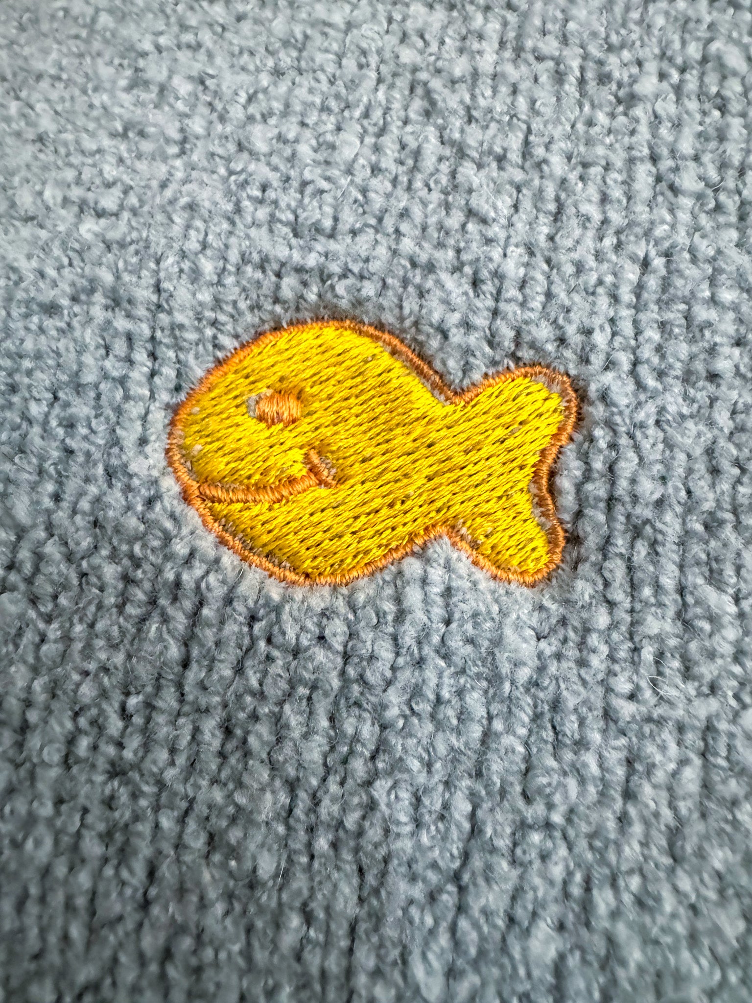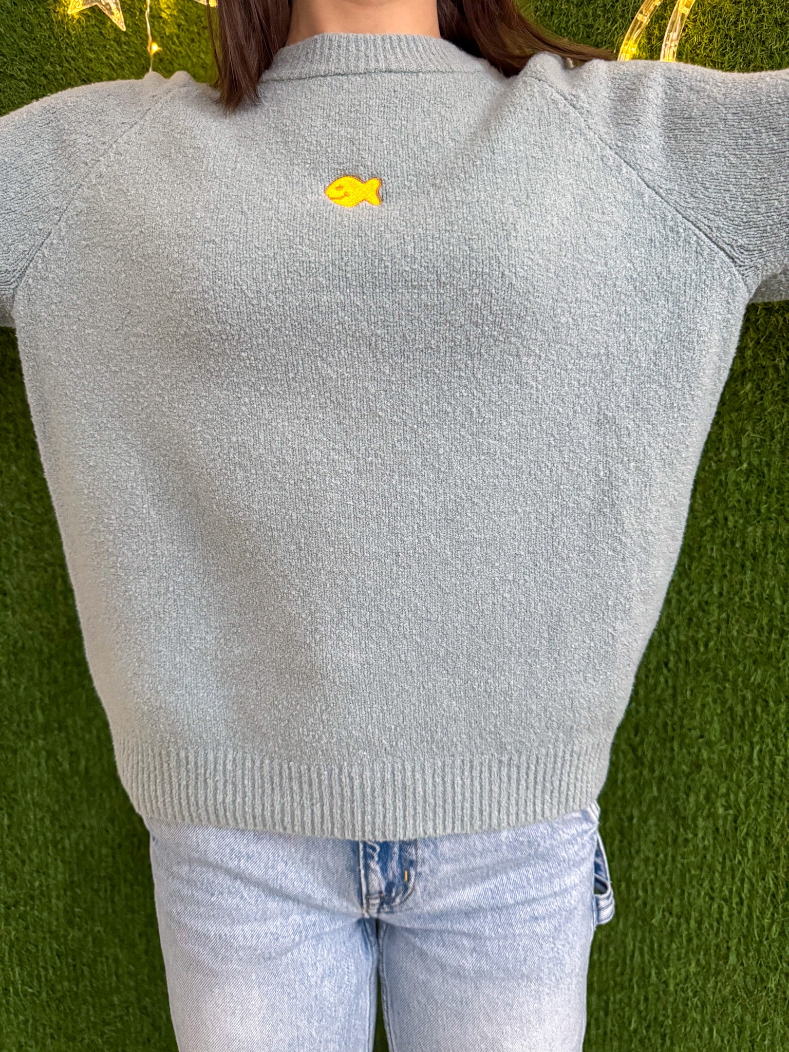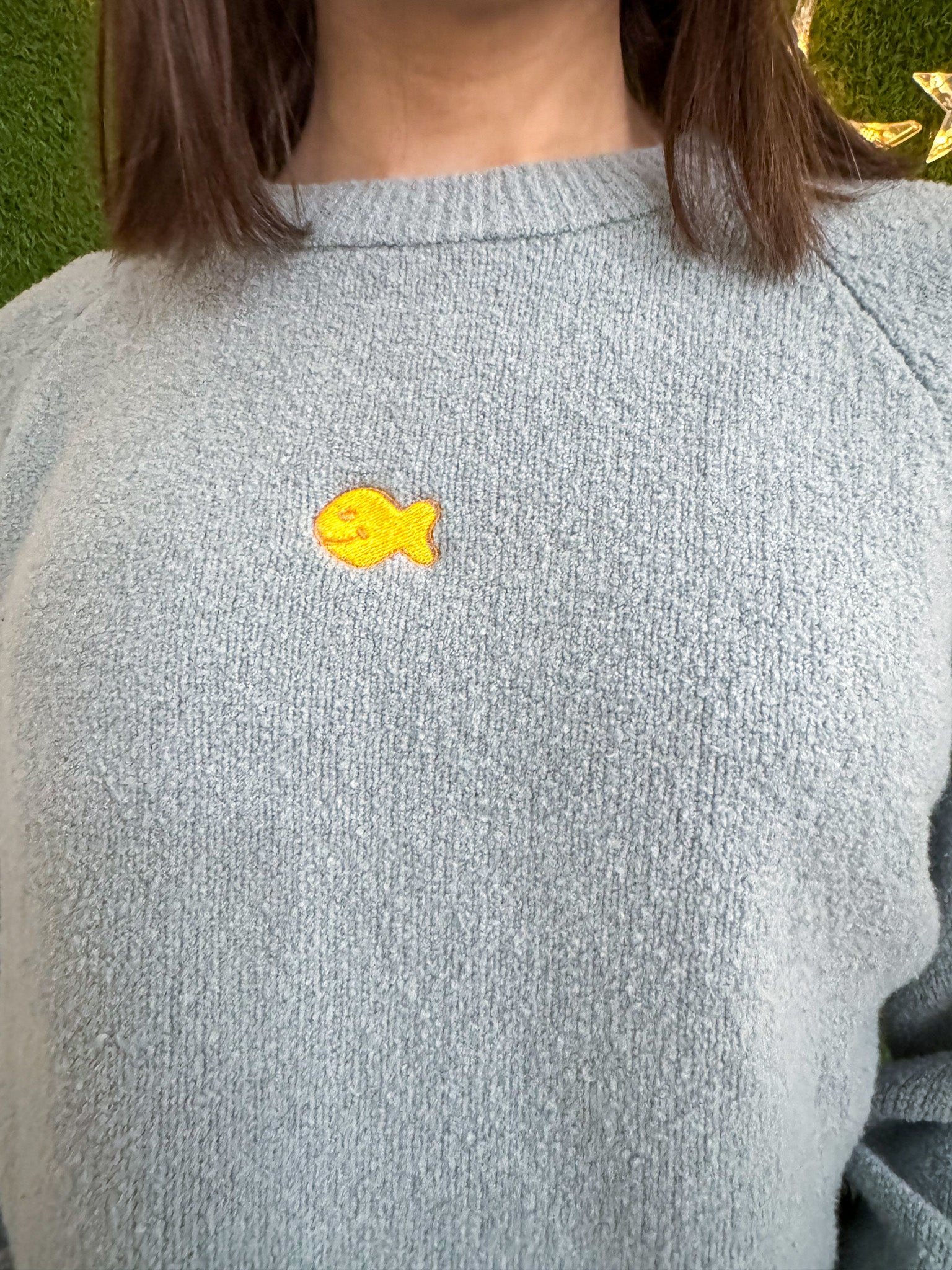 Go green with style in our Goldfish Light Blue Sweater! This embroidered, upcycled secondhand garment supports our small biz. Sustainable, slow fashion never looked so good<3