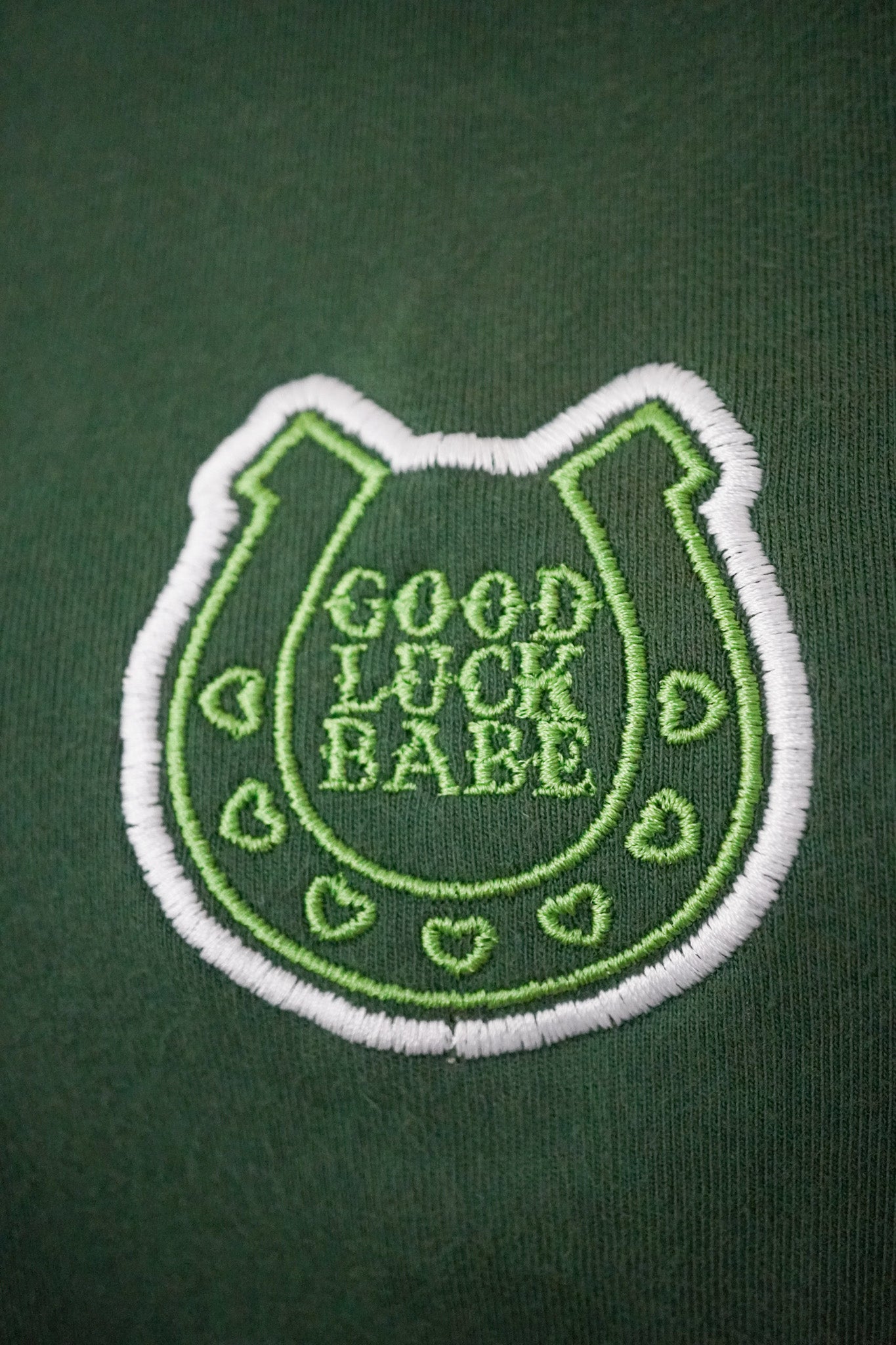 The Good Luck Babe Green T-Shirt is an embroidered, upcycled garment made from a secondhand piece. Supporting small businesses and embracing slow fashion, it offers a sustainable and unique addition to your wardrobe!