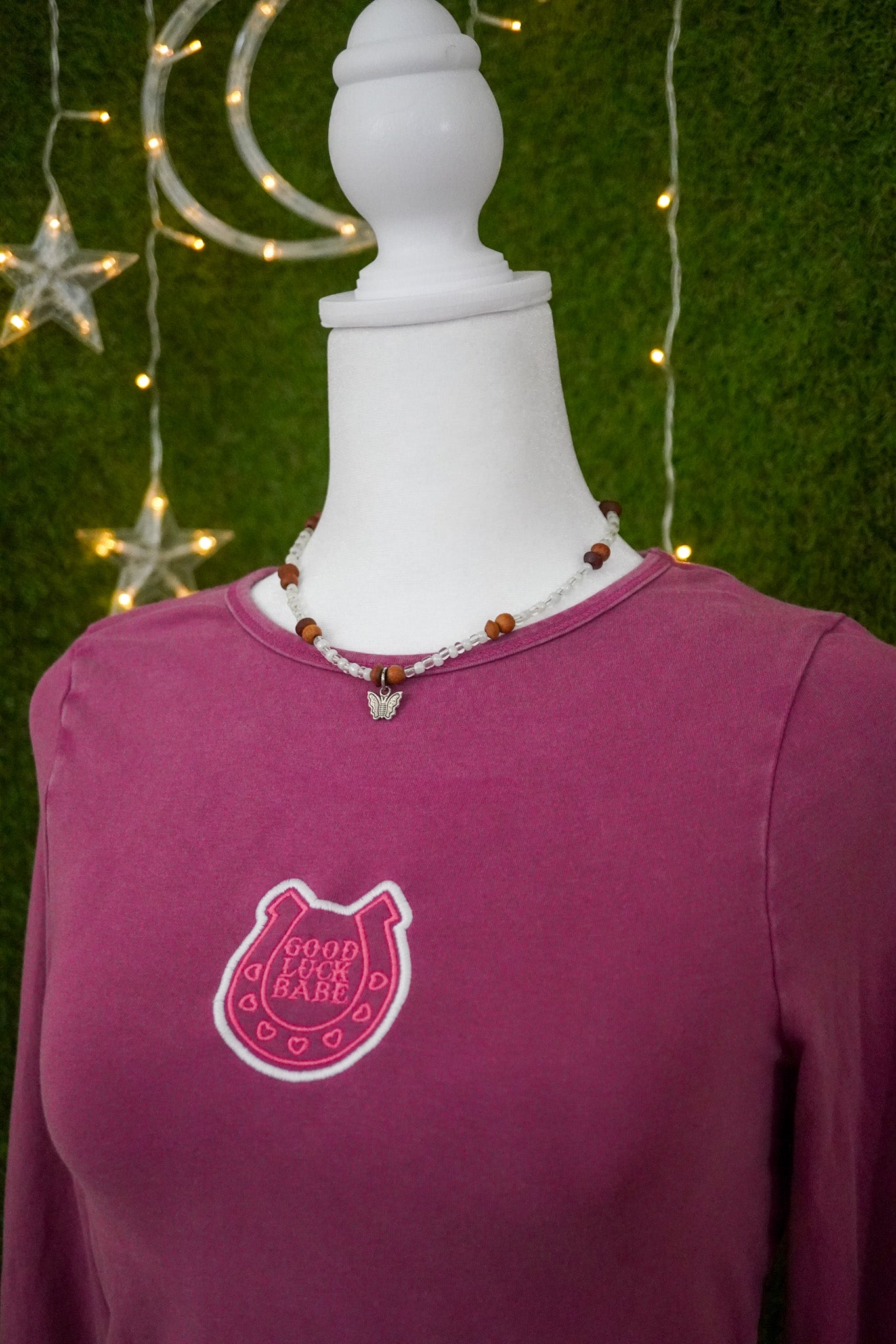 This Good Luck Babe Magenta Cropped Long Sleeve is a sustainable, upcycled piece crafted from a secondhand garment. Featuring delicate embroidery, it supports slow fashion and small businesses while adding a unique touch to your wardrobe.