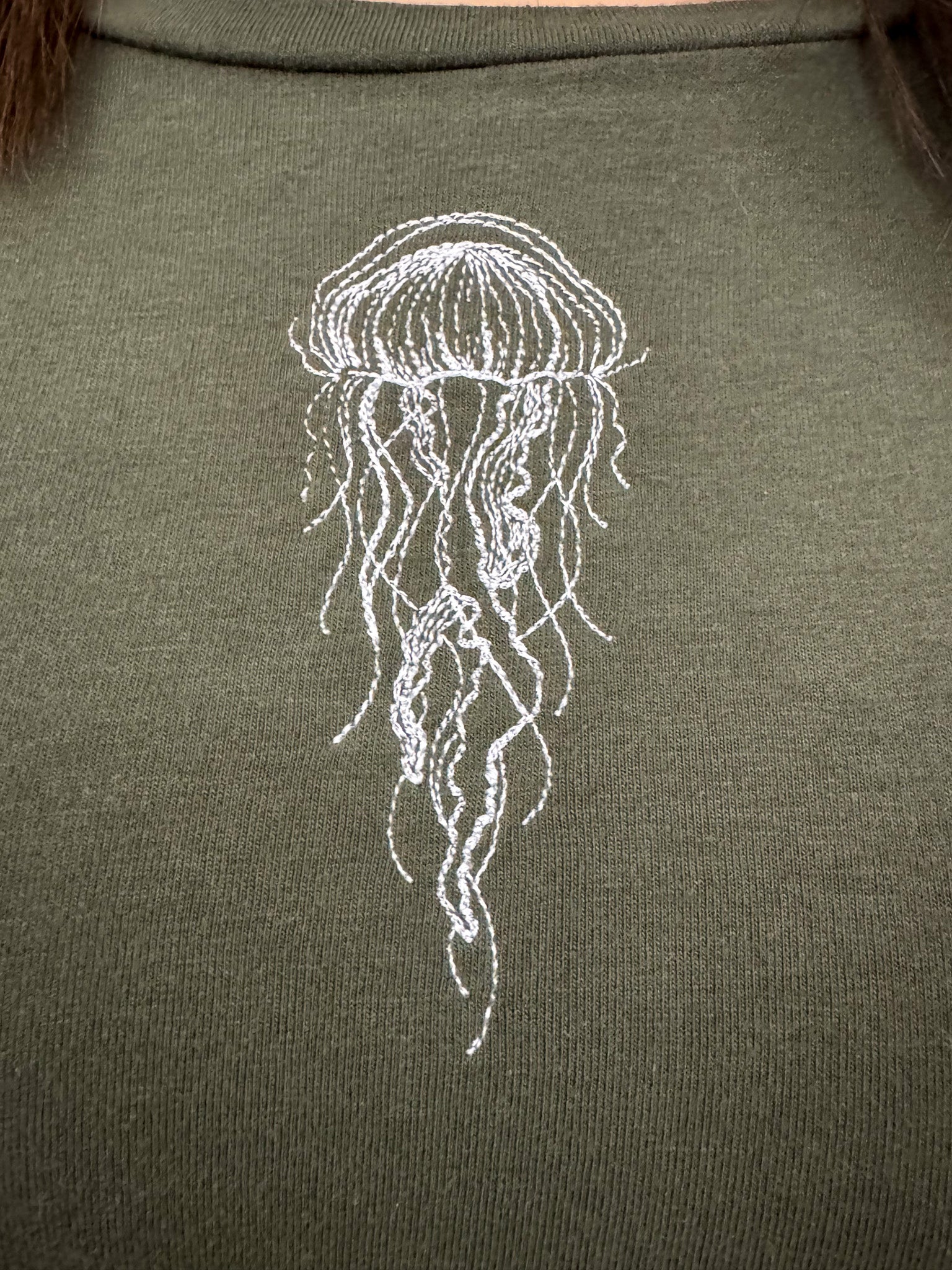 Support our small biz with our Green Jellyfish Baby Tee. Embroidered with sustainability in mind, this upcycled and secondhand garment is the perfect addition to your slow fashion wardrobe!