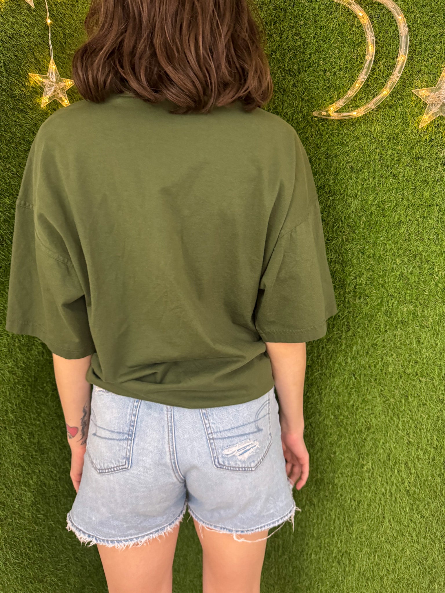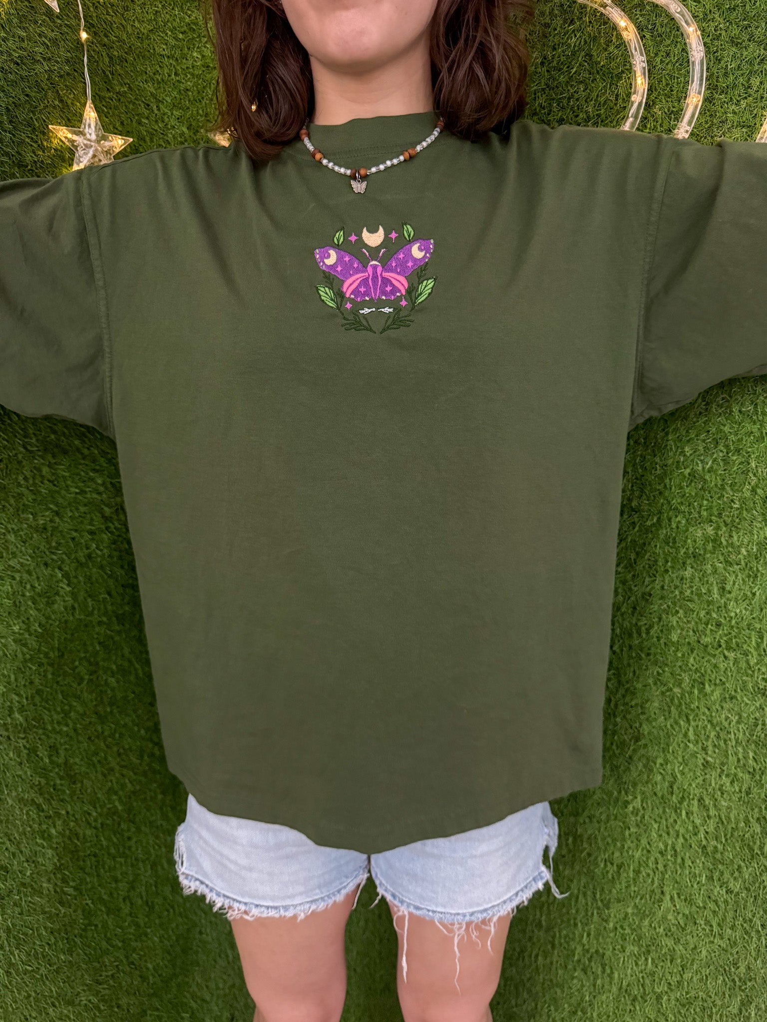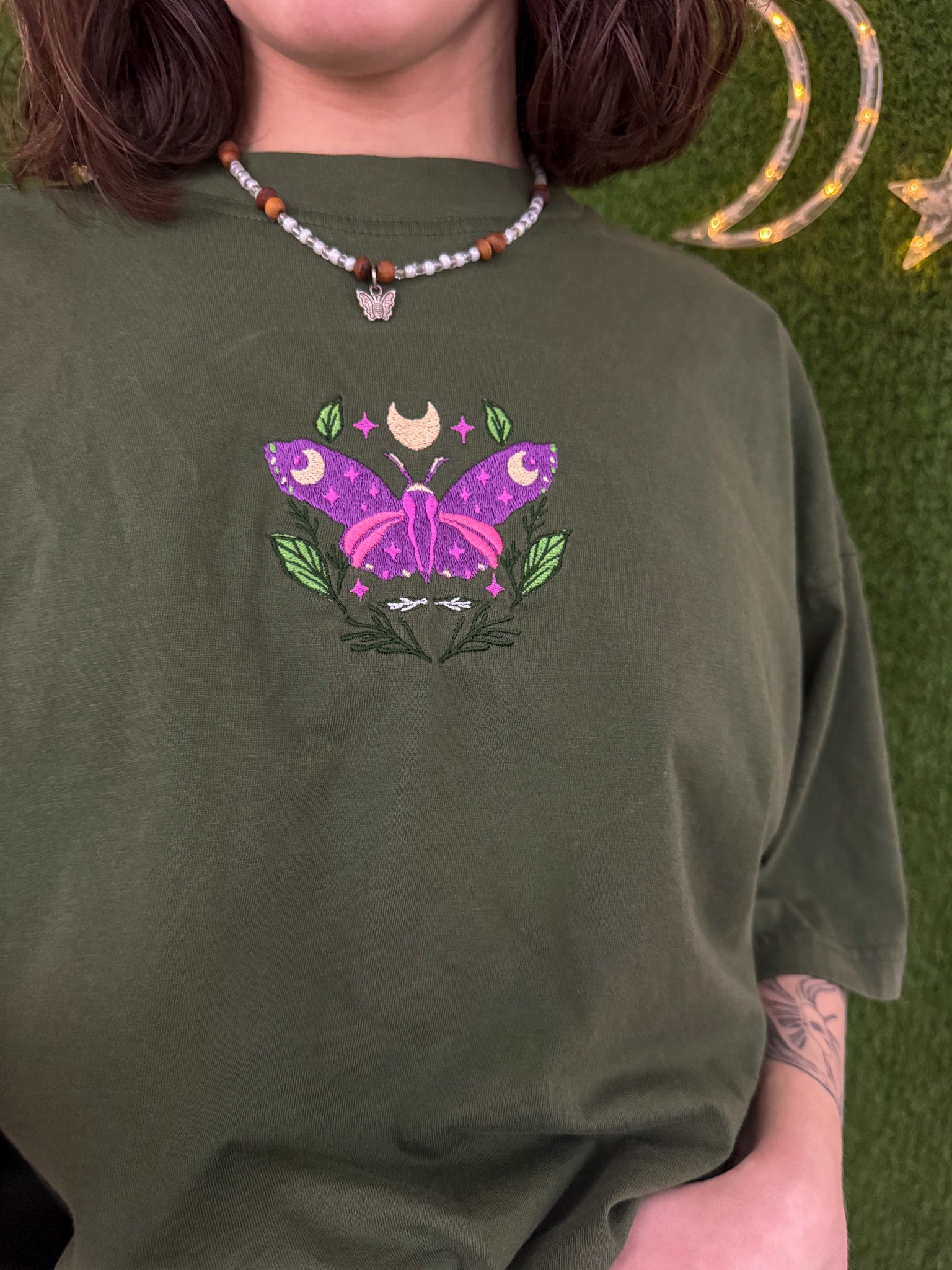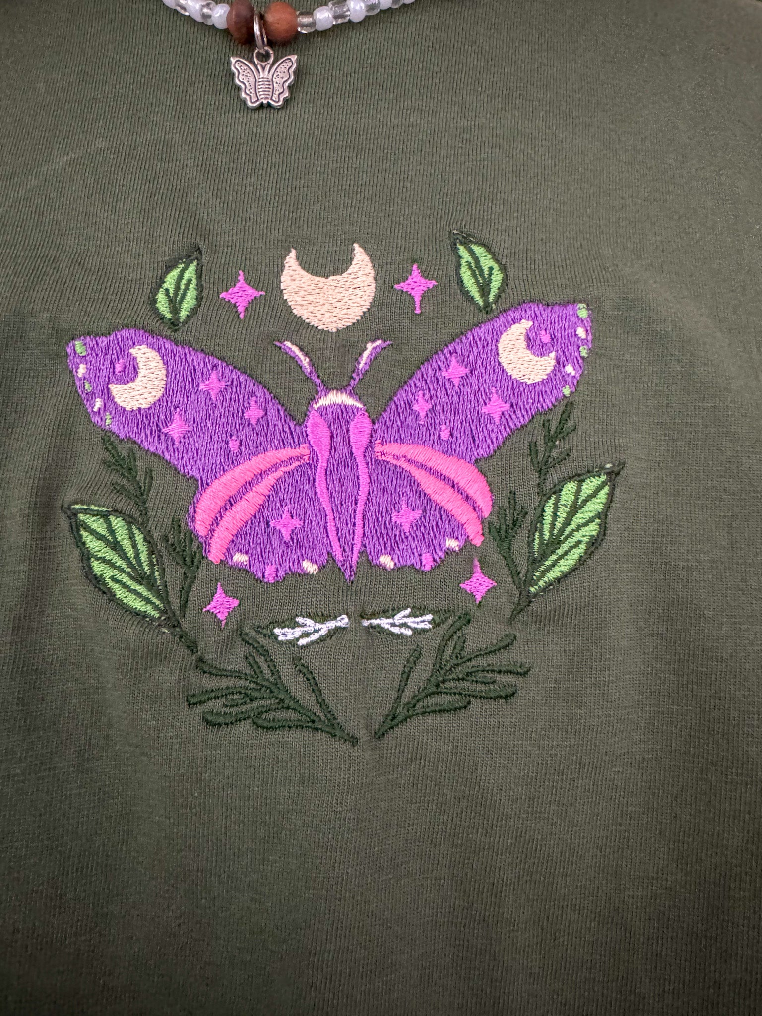 This eco-friendly t-shirt features a unique embroidered design and is made from upcycled materials, making it a sustainable and slow fashion choice. By purchasing this secondhand garment, you'll also be supporting our small business. Choose green, choose the Green Moth T-Shirt<3