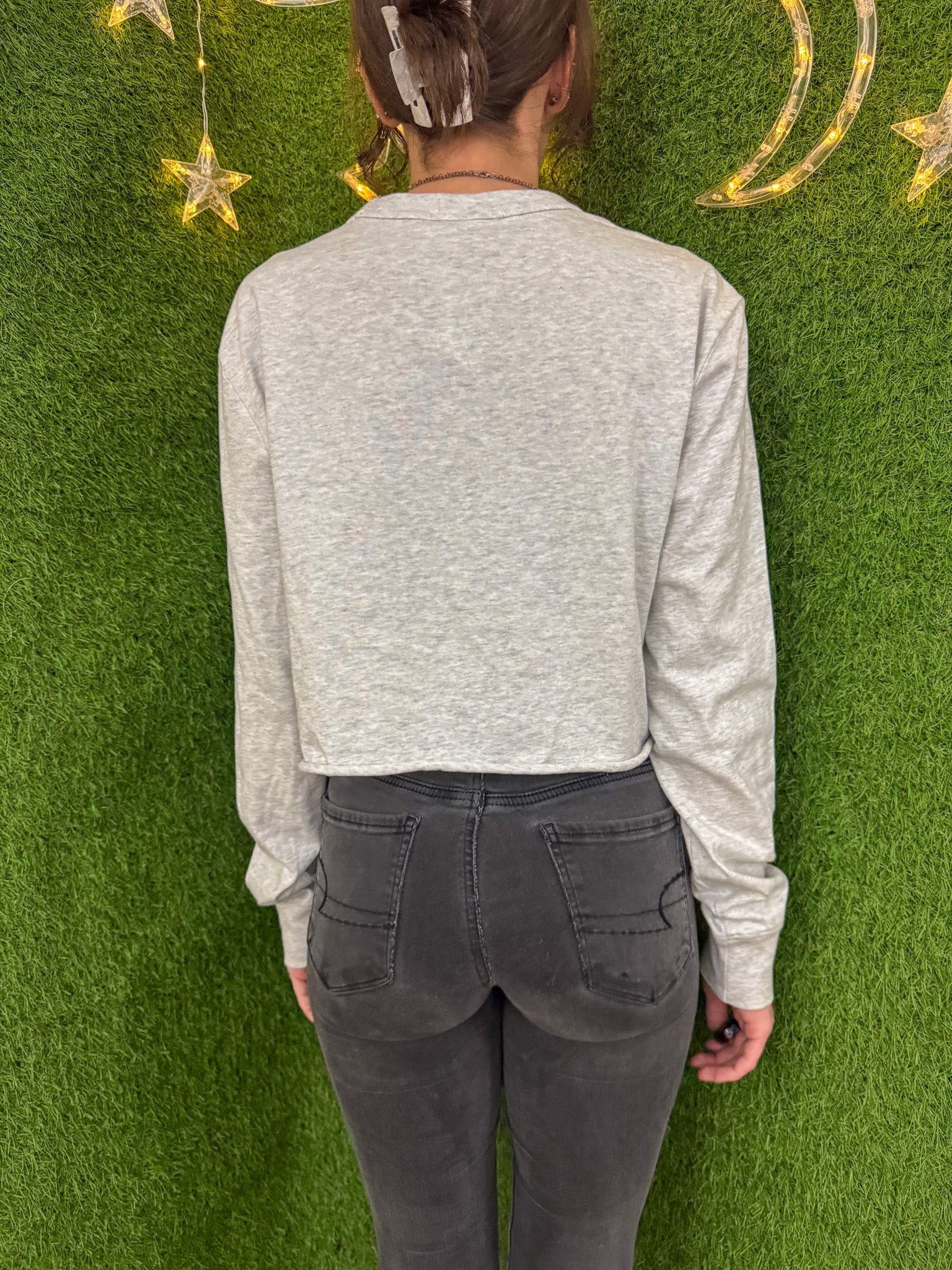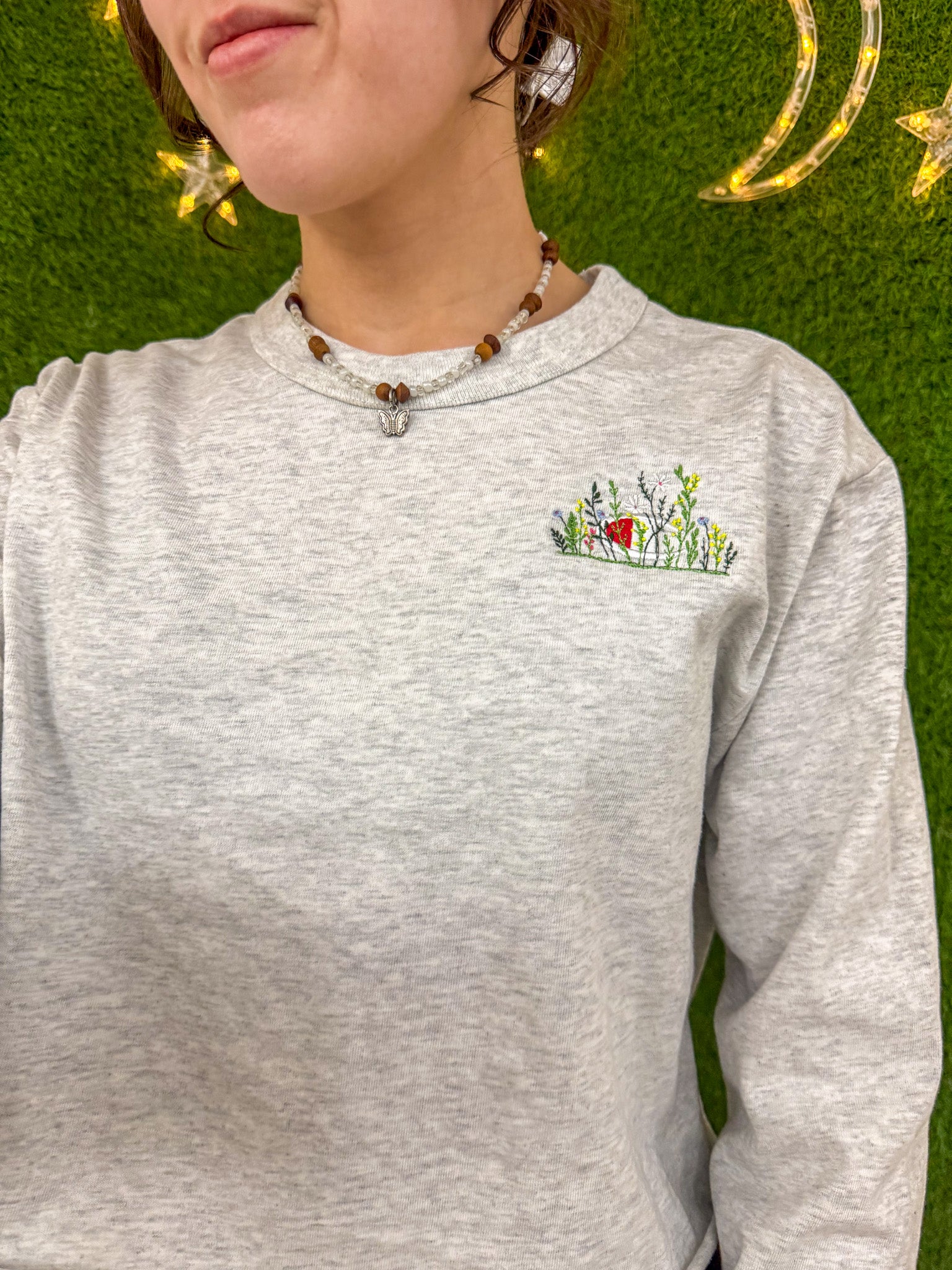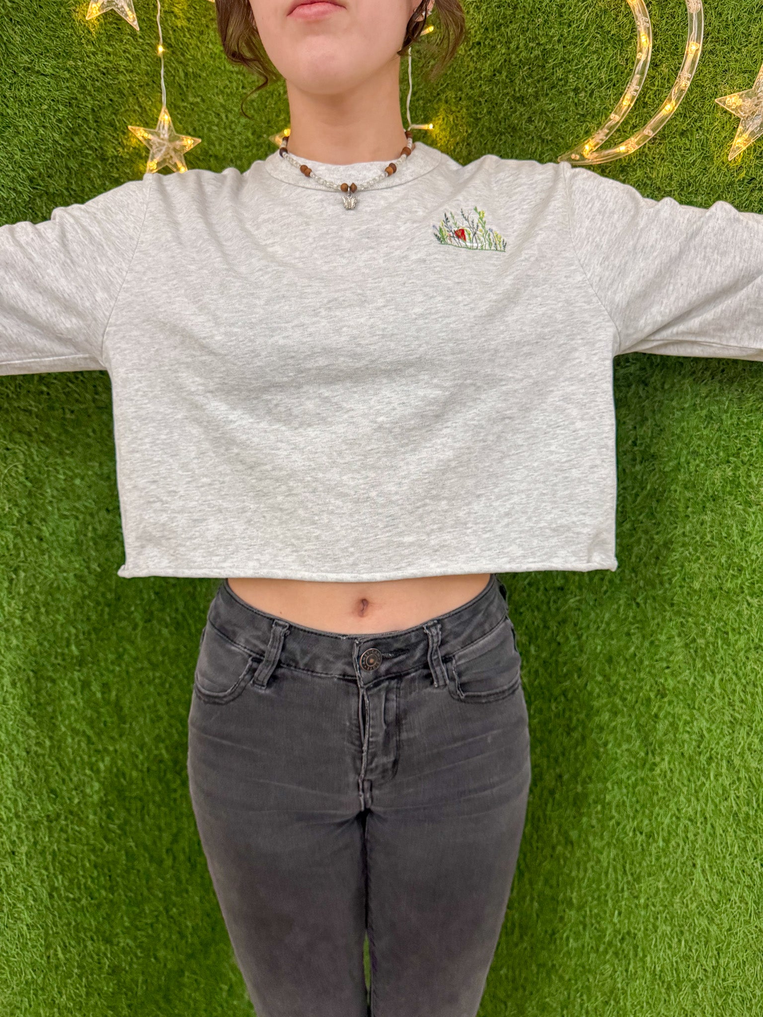 This grey floral cropped long sleeve from Champion is not only stylish, but also supports our small biz. The embroidered design adds a unique touch while the upcycled and secondhand materials make it a sustainable and slow fashion choice. Look good and feel good with this eco-friendly top!