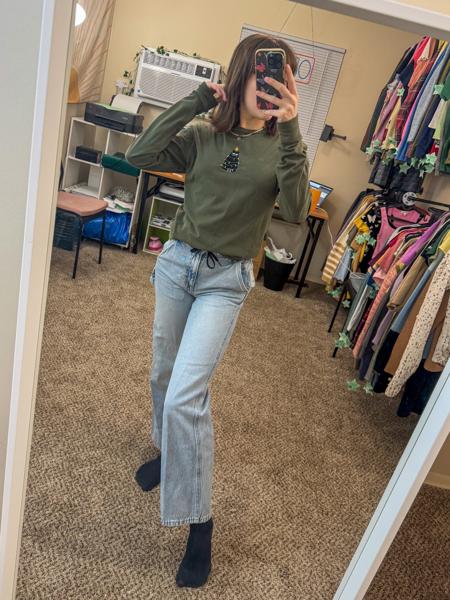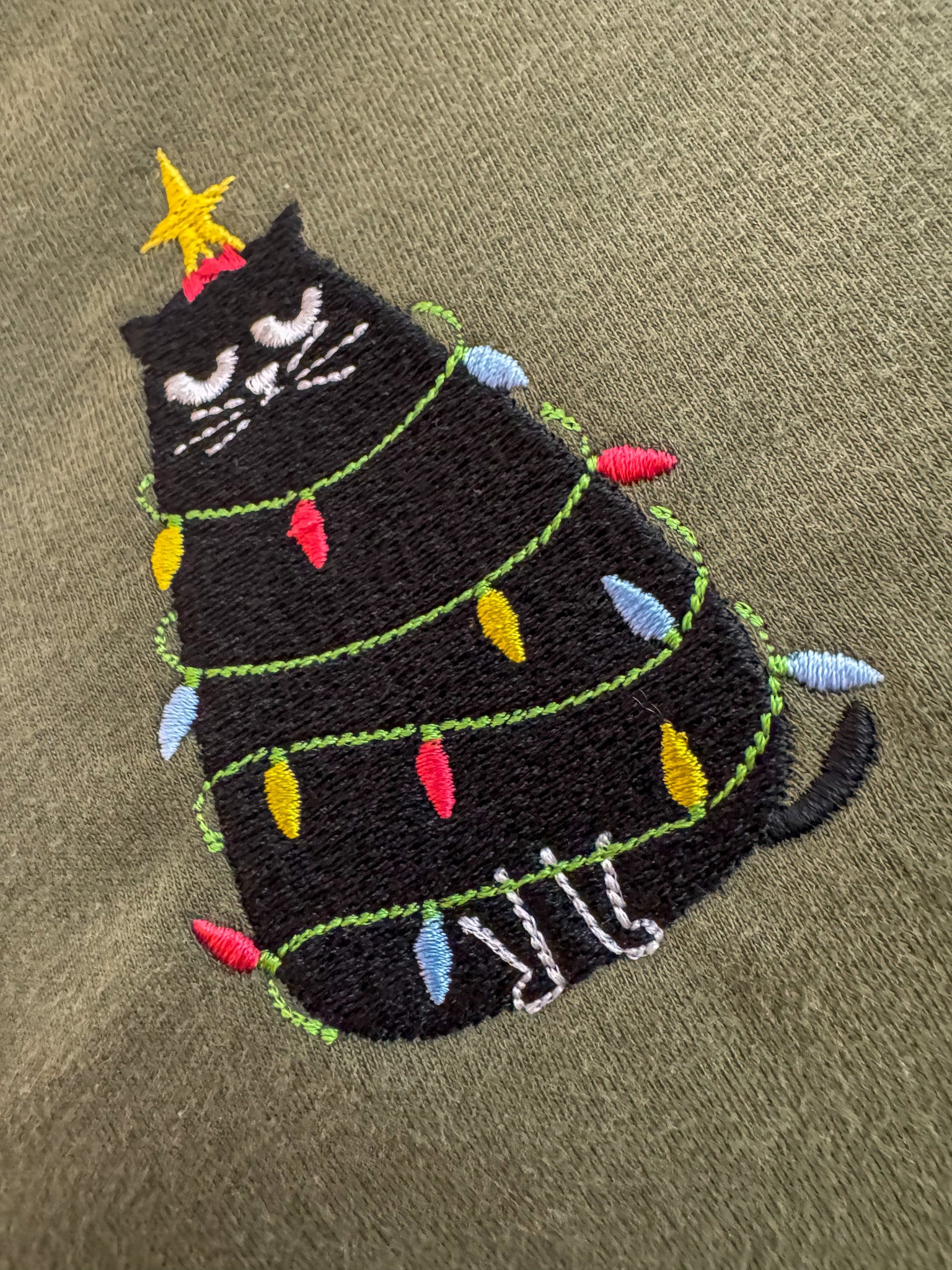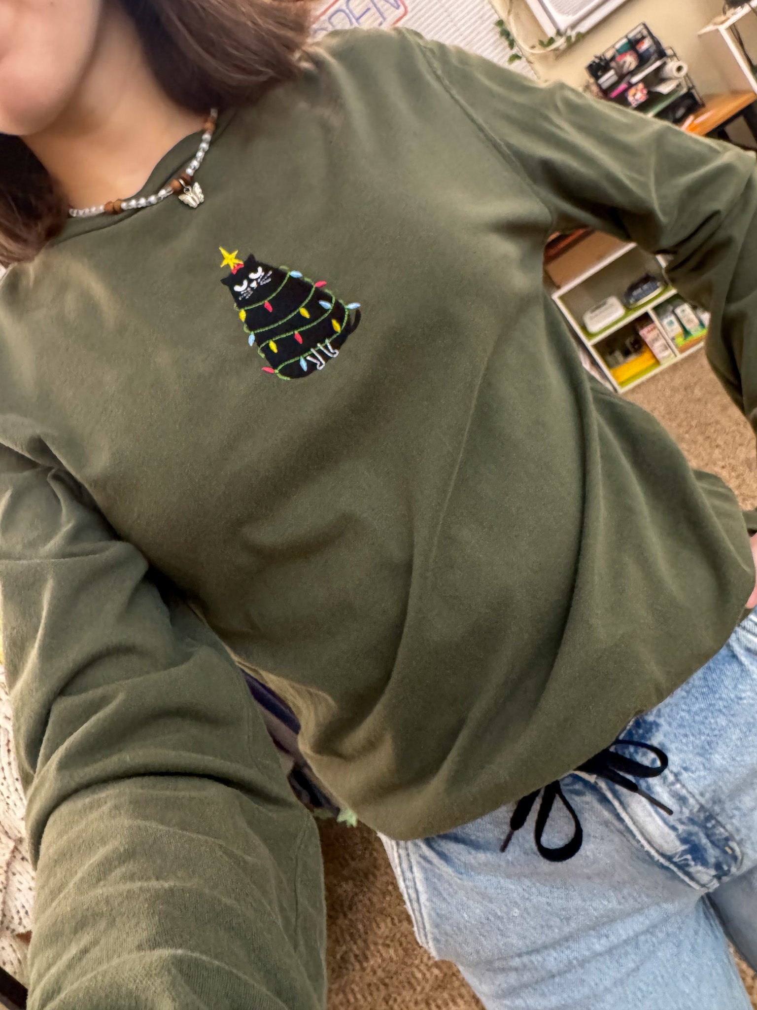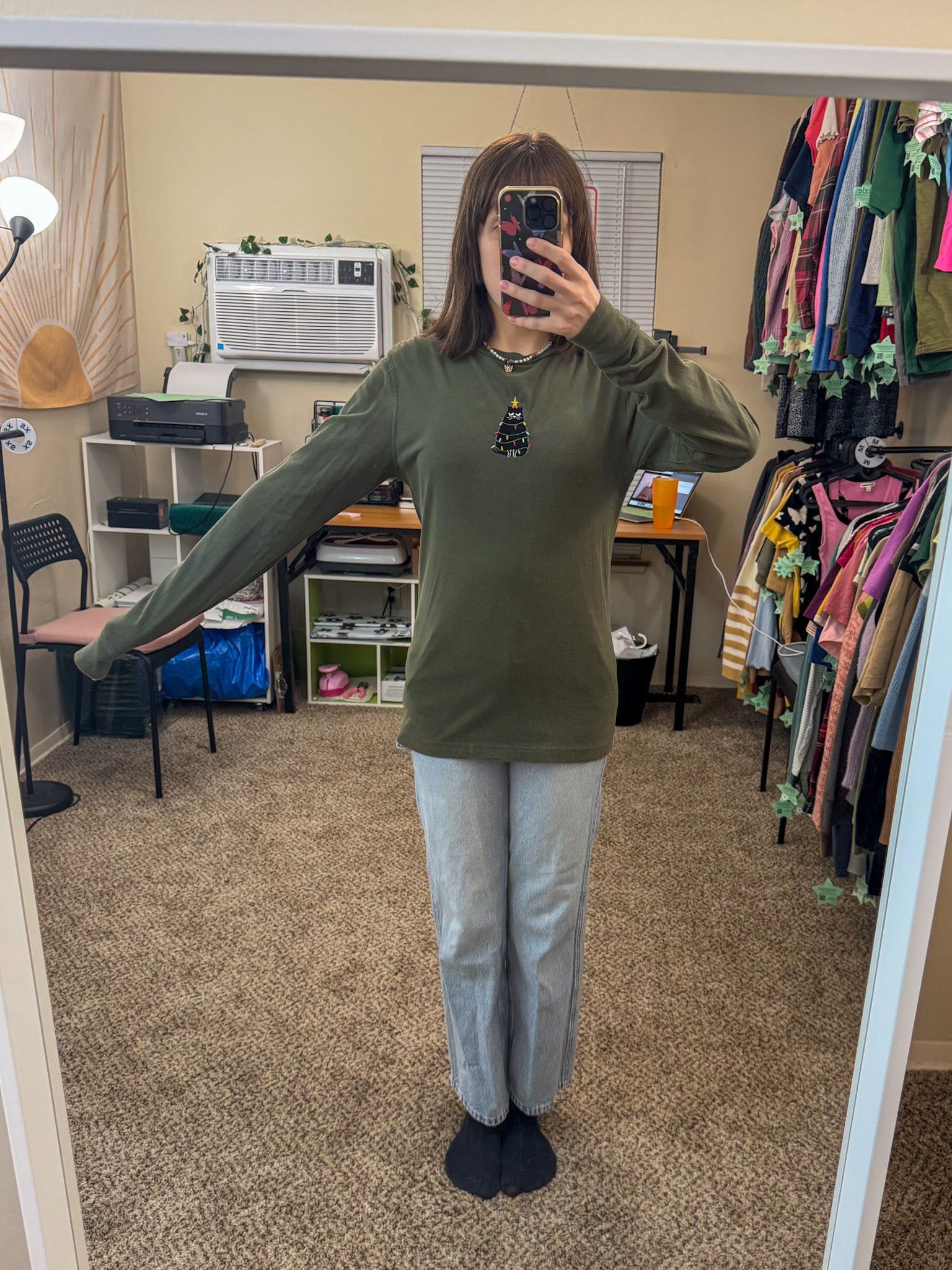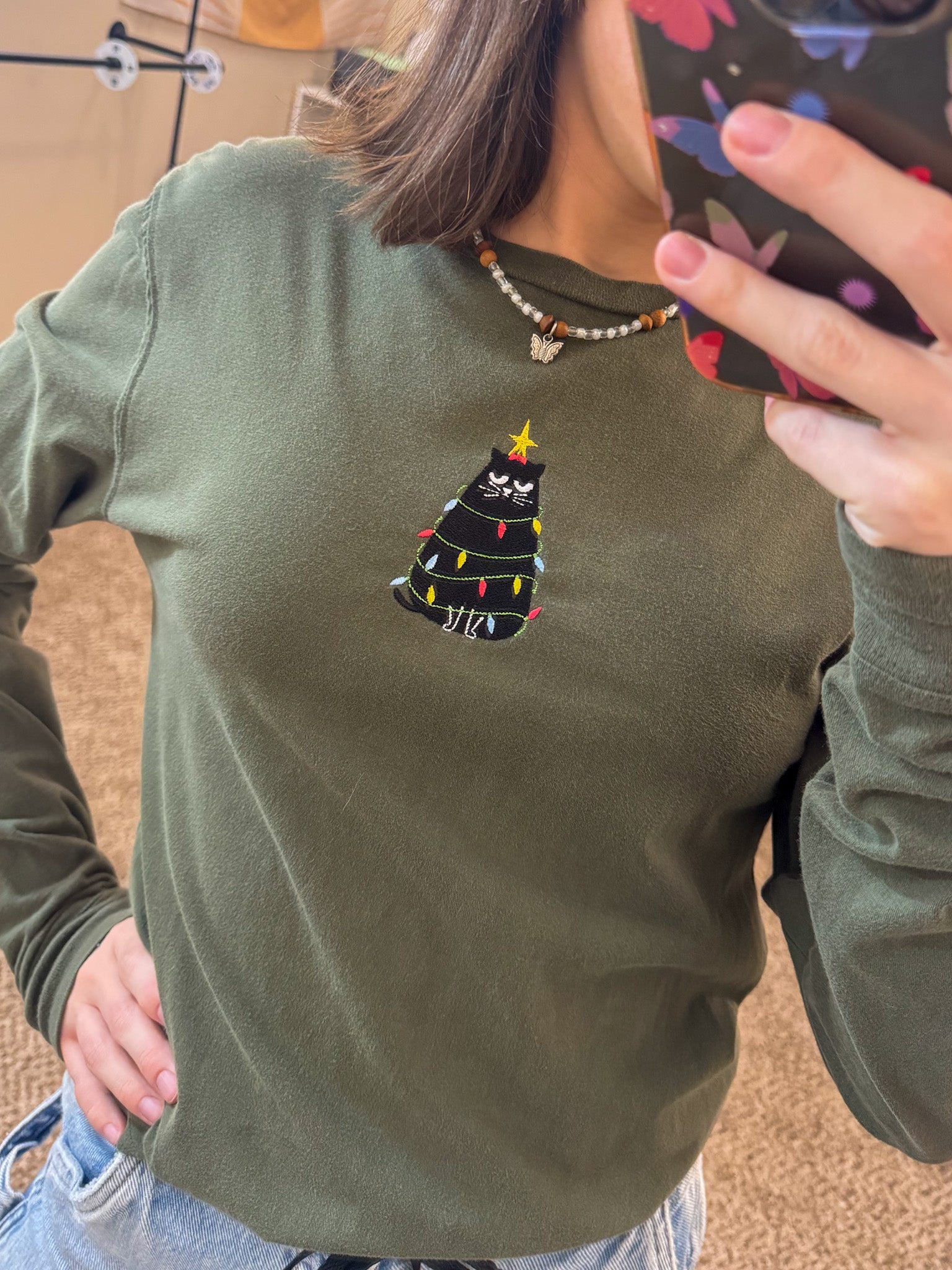 Join our Grumpy Kitty club with this green long sleeve shirt, embroidered by us! Support our small biz and sustainable fashion with this upcycled, discarded secondhand garment. Slow fashion never looked so CUTE!