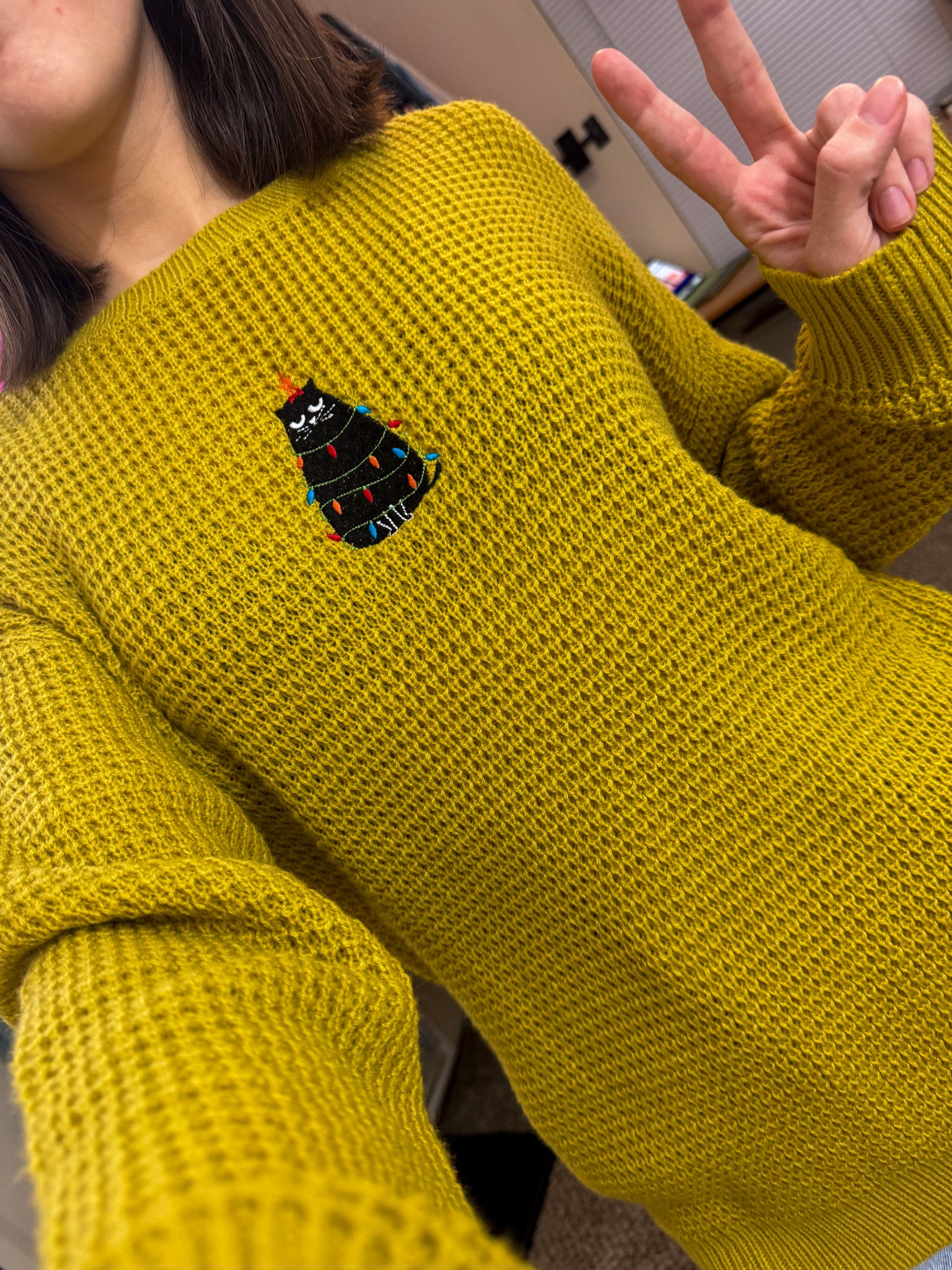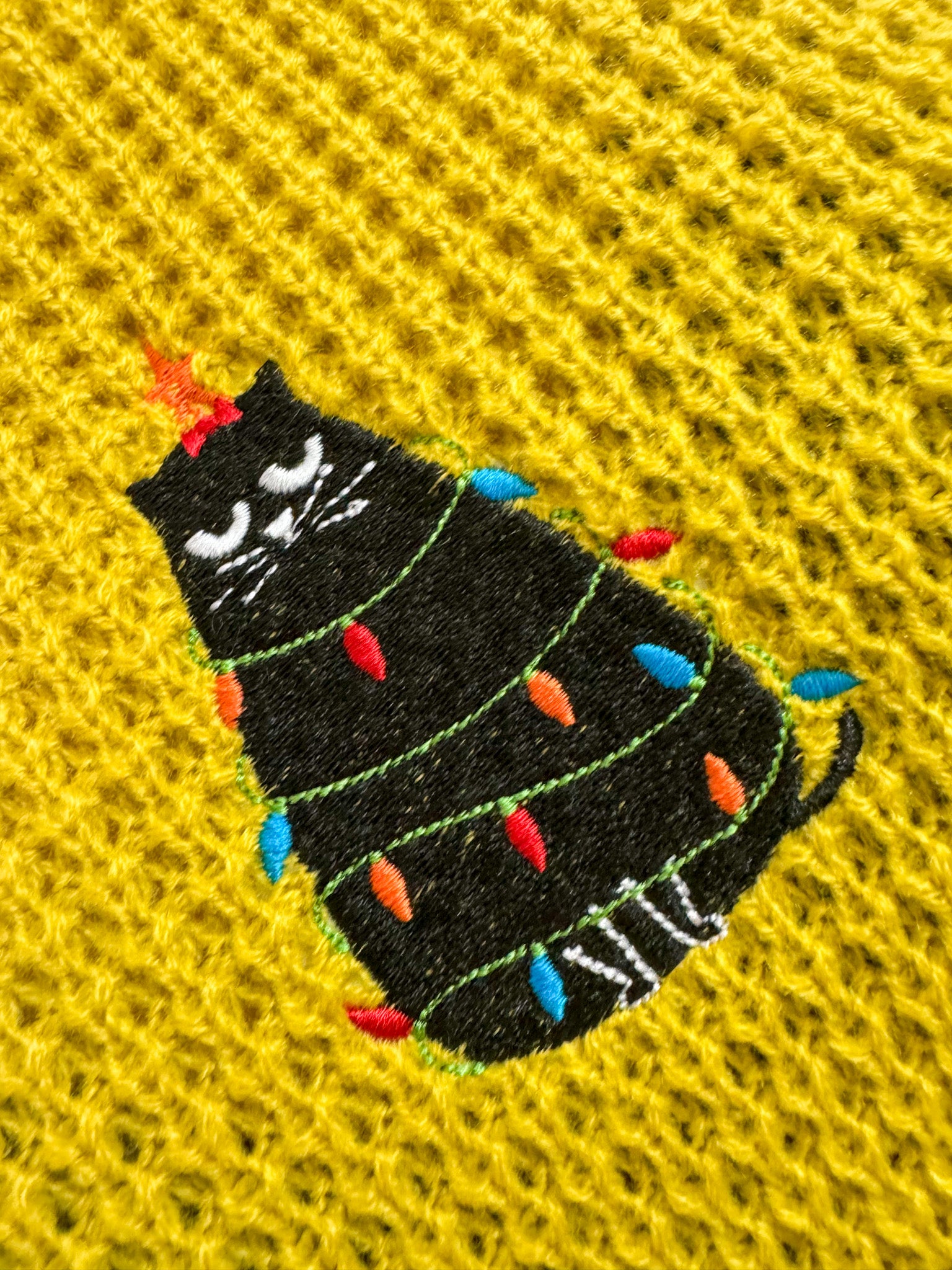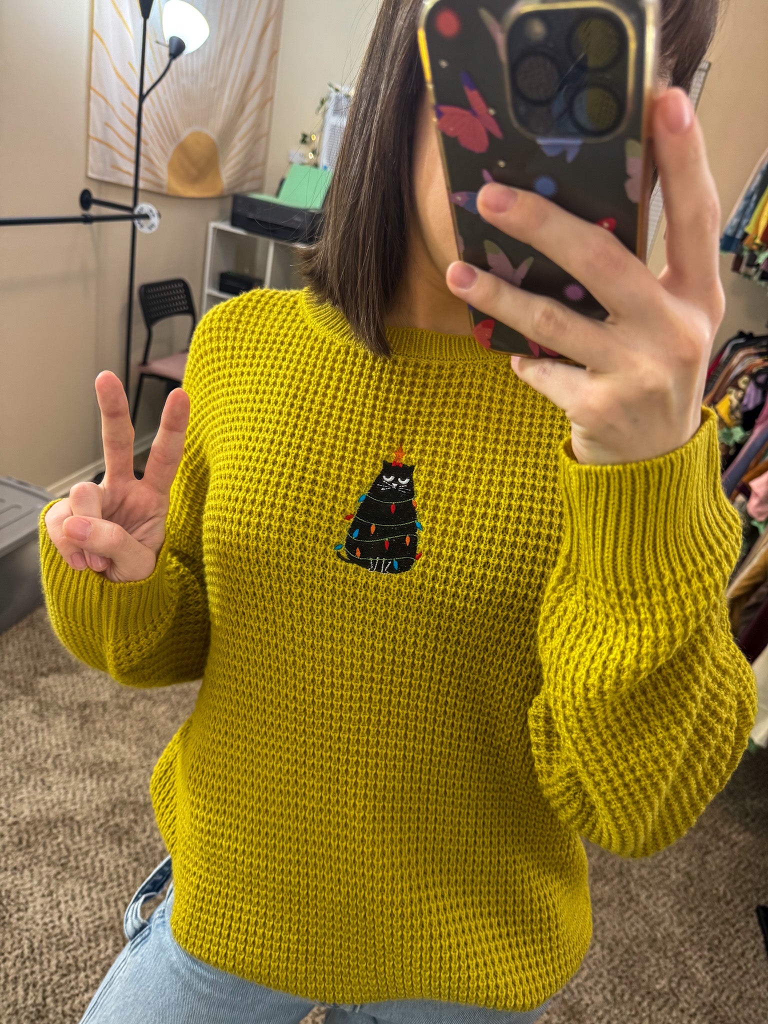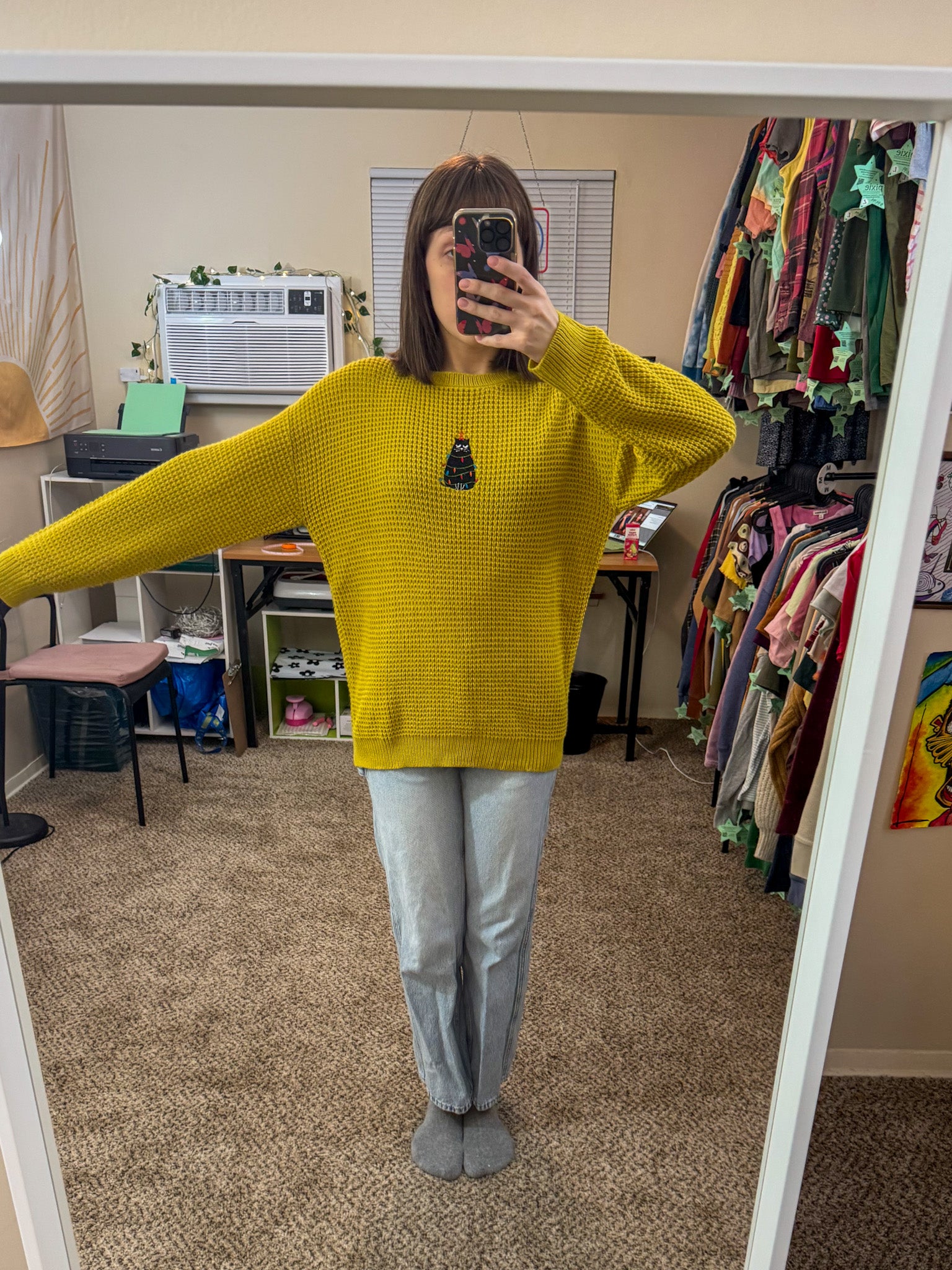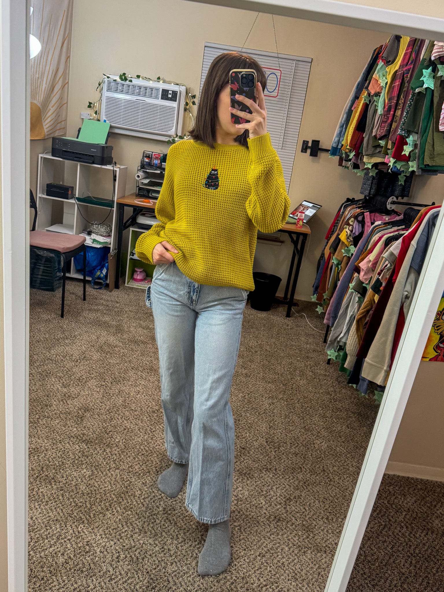 Be the coolest cat in town with our Grumpy Kitty Sweater! Hand-embroidered by us, this sweater not only supports our small business, but is also upcycled from a discarded secondhand garment. Join the slow fashion movement and look good while doing good!