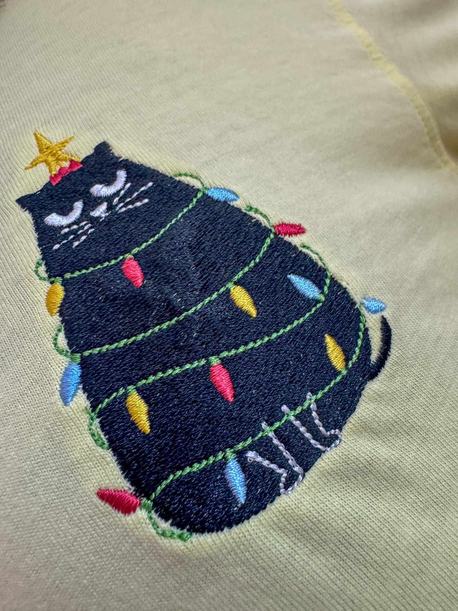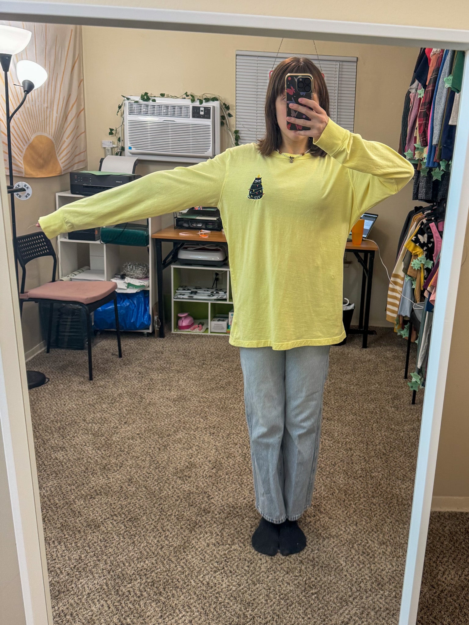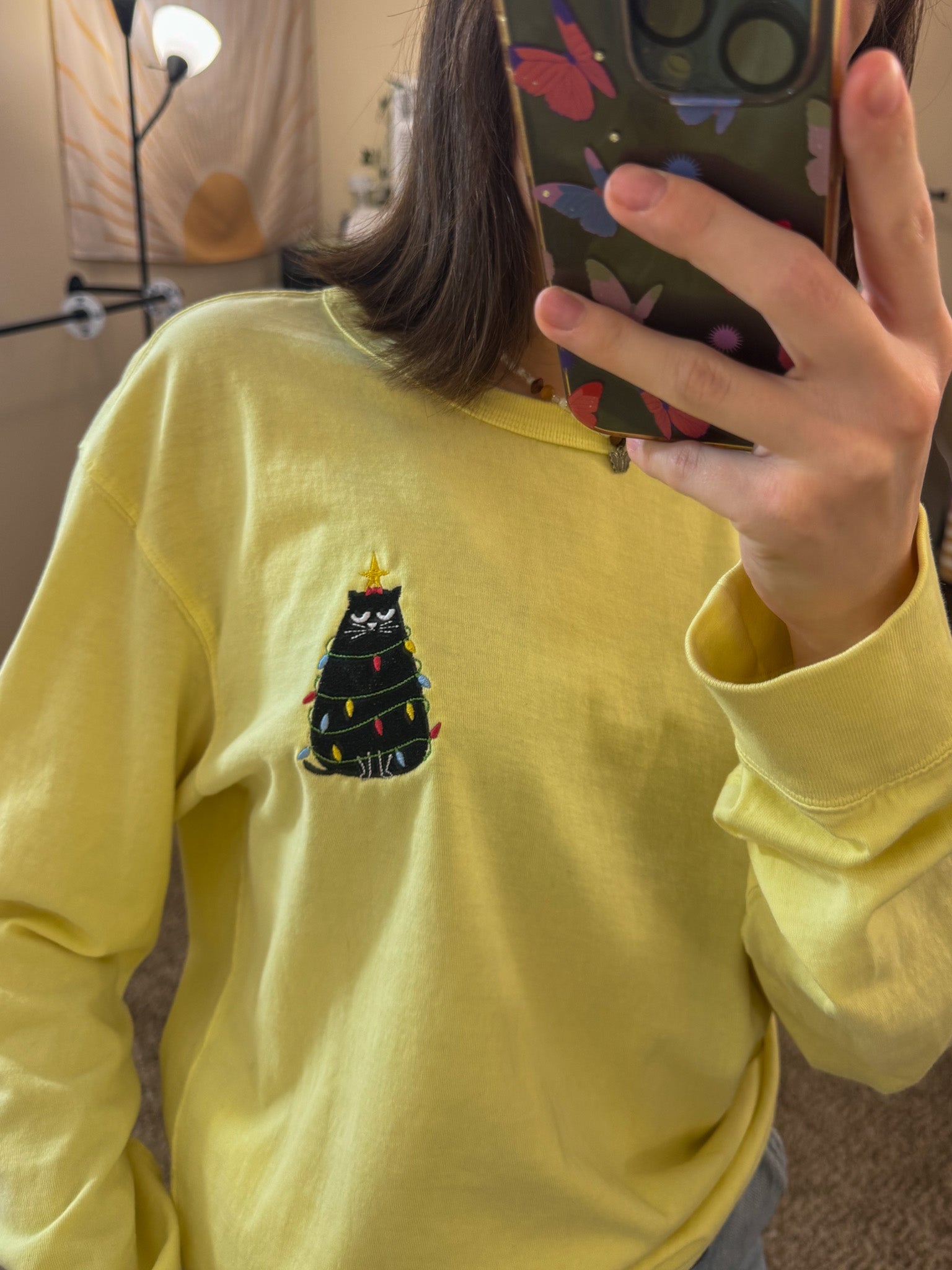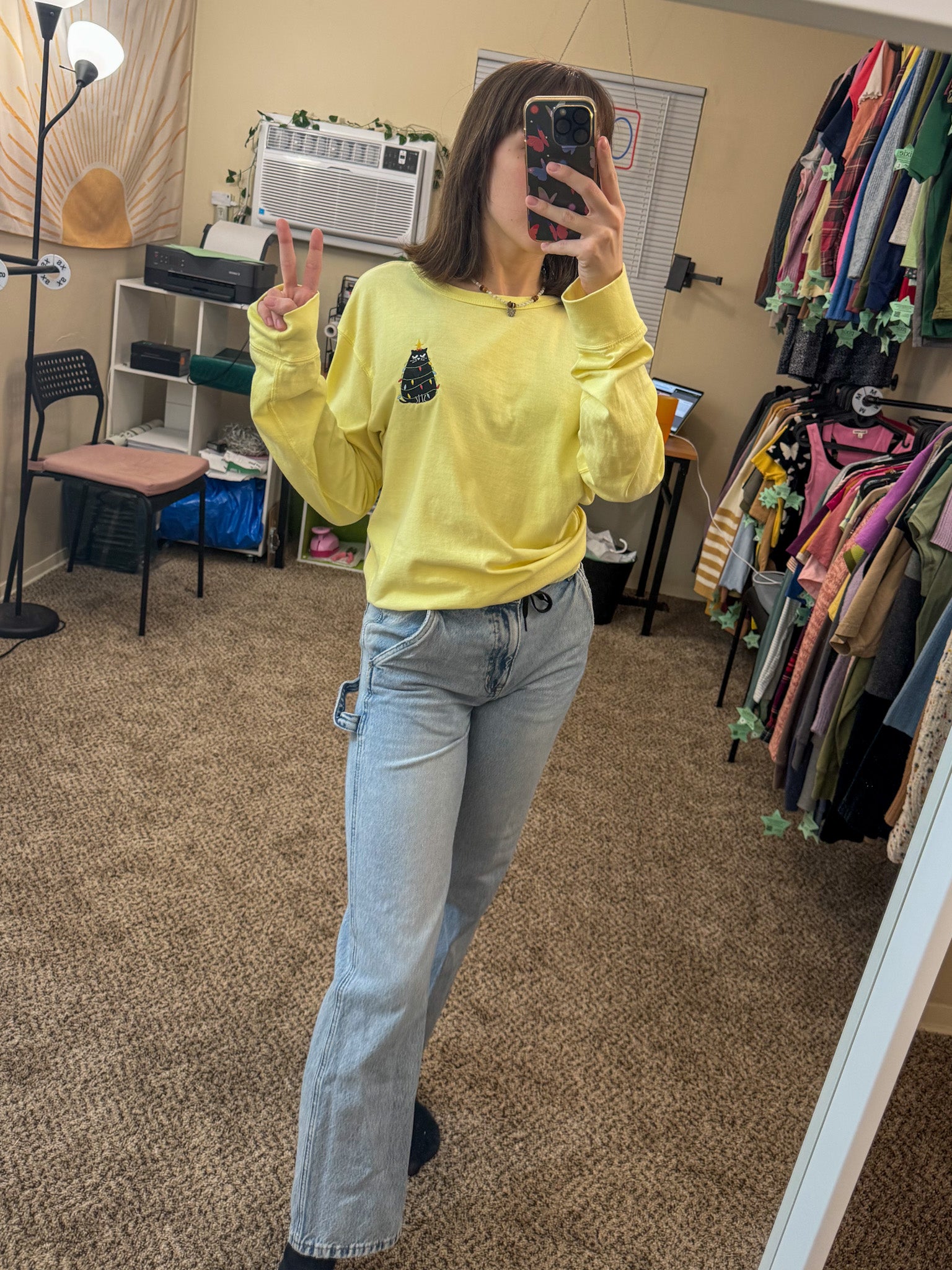 Put some pawsitively sustainable style in your wardrobe with our Grumpy Kitty Yellow Long Sleeve. This upcycled, embroidered secondhand garment not only supports our small biz, but also helps reduce fashion waste. Slow fashion never looked so good!