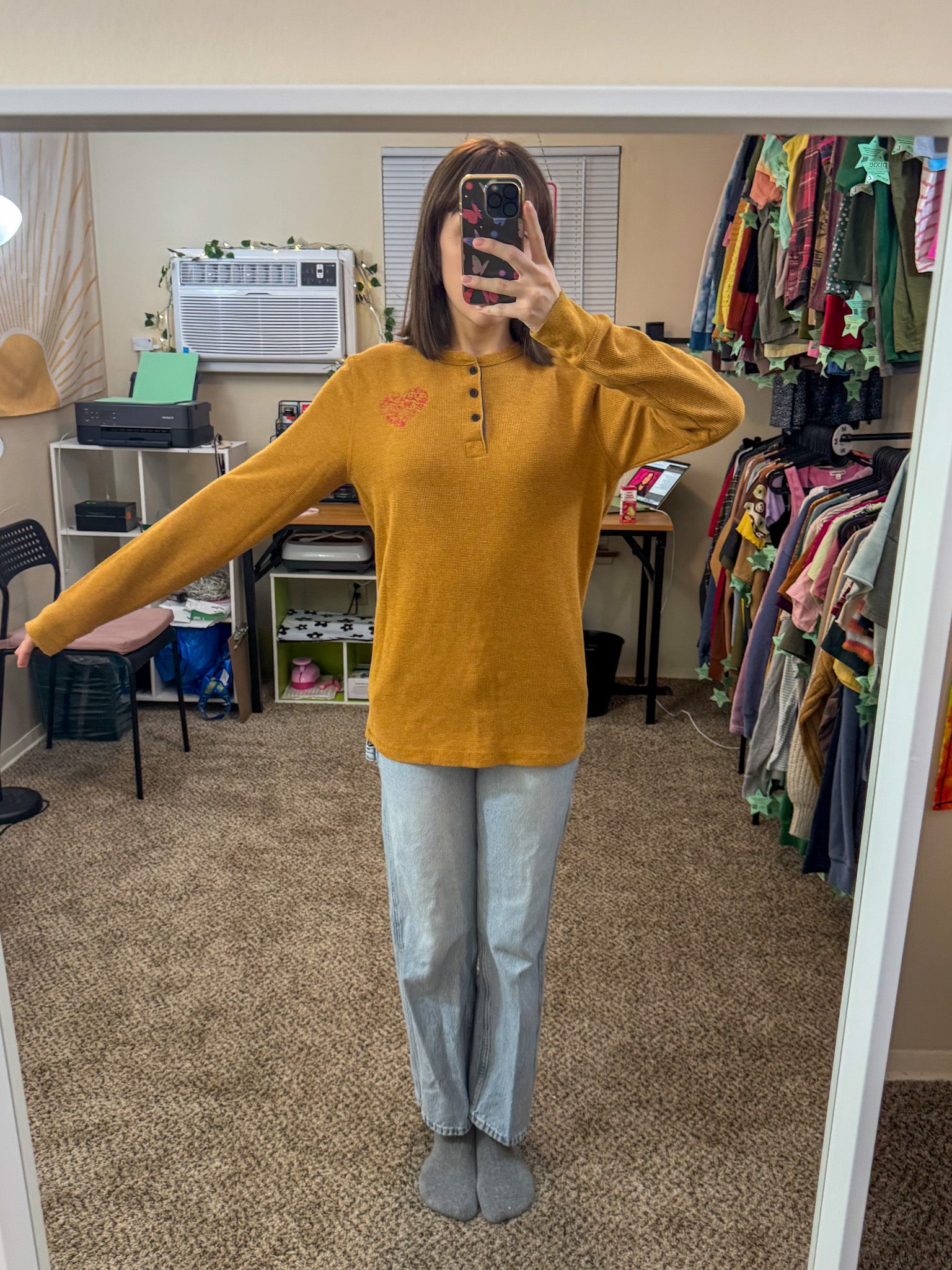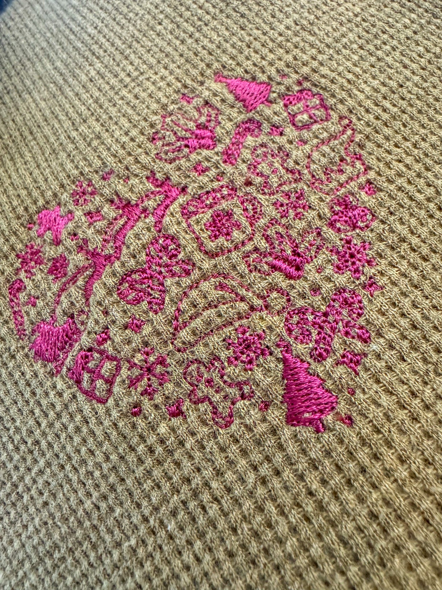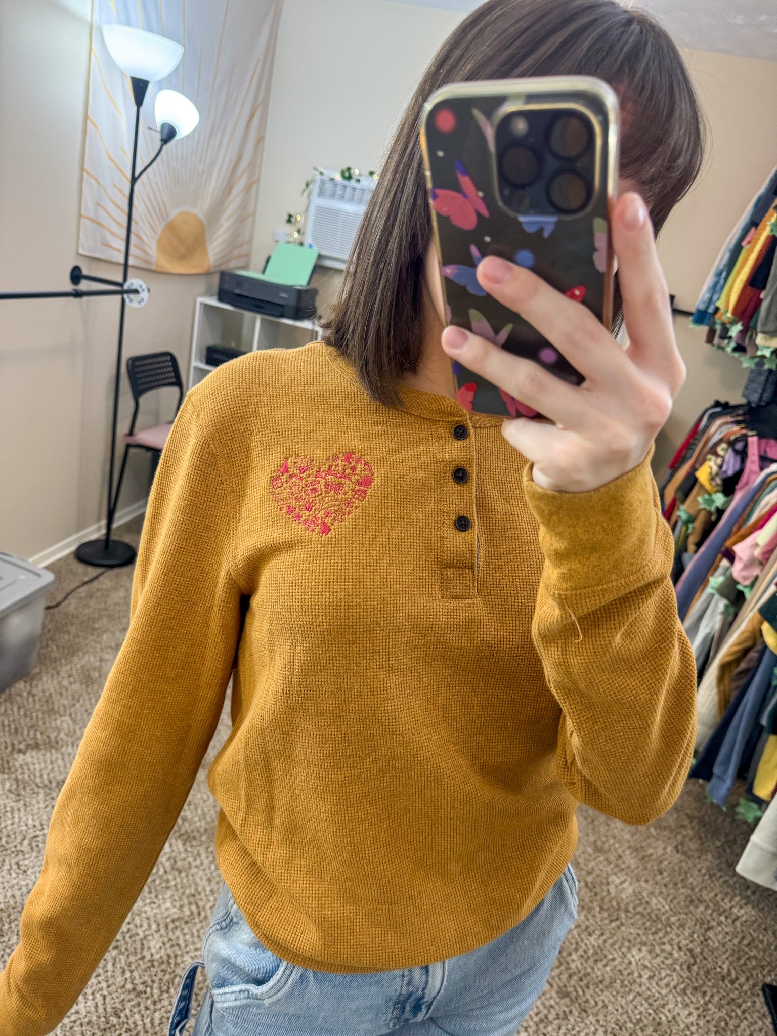 Get cozy and show support for small businesses with our Holiday Heart Thermal Button Up. This top is lovingly embroidered and upcycled by us from a discarded secondhand garment, making it a sustainable and stylish addition to your wardrobe. Embrace the slow fashion movement with this unique and quirky piece!