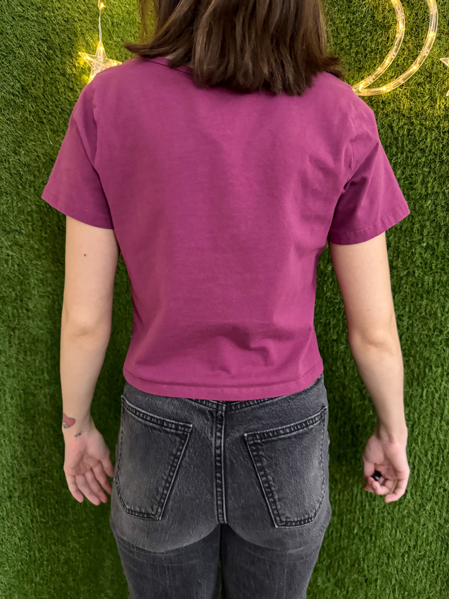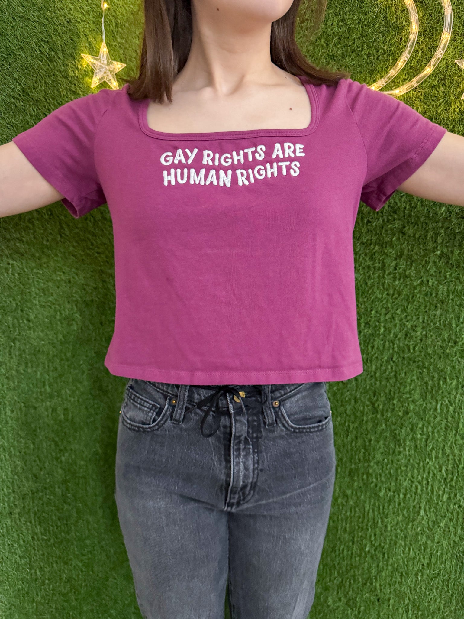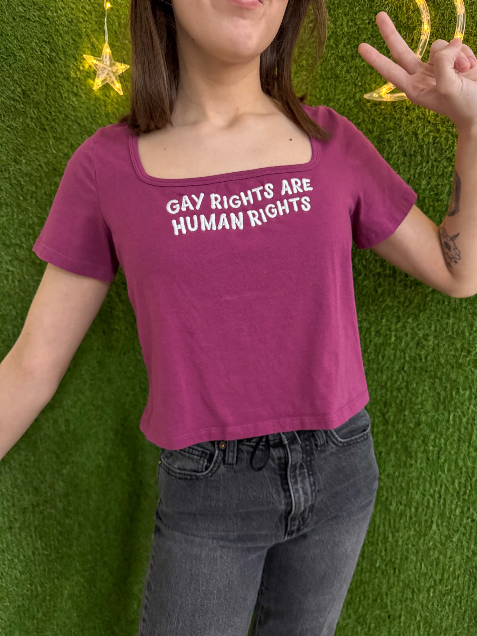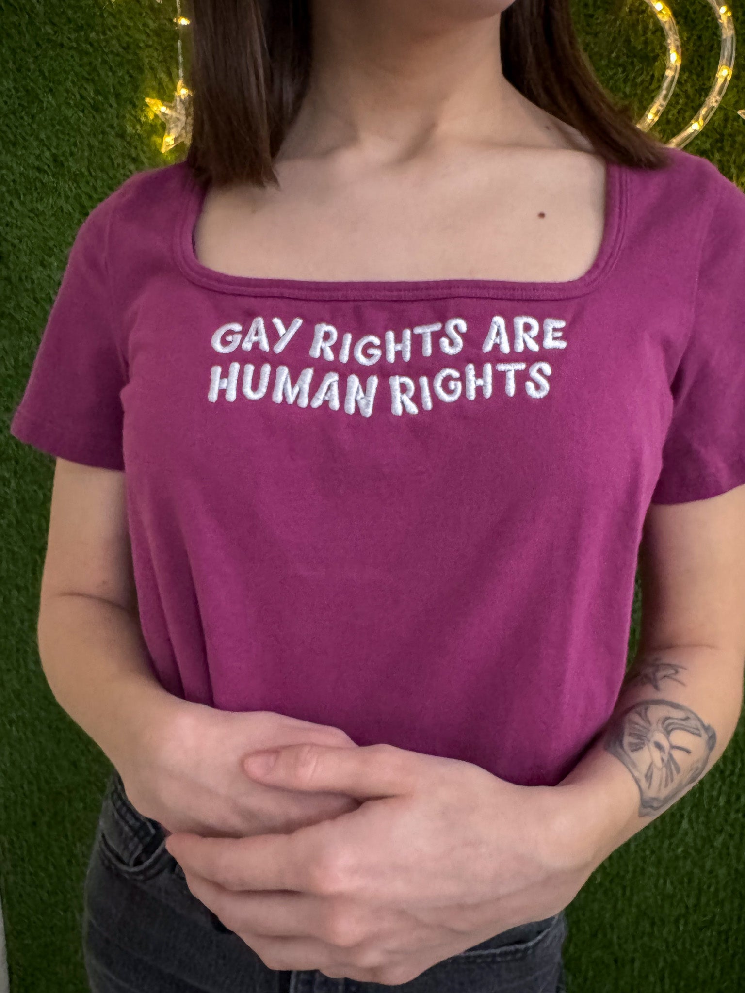 Show your support for human rights in style with this quirky magenta baby tee, featuring intricate embroidery. Made from upcycled materials, this sustainable and slow fashion piece also supports small businesses. A secondhand garment with a powerful message. Gently used, fiercely fashionable!