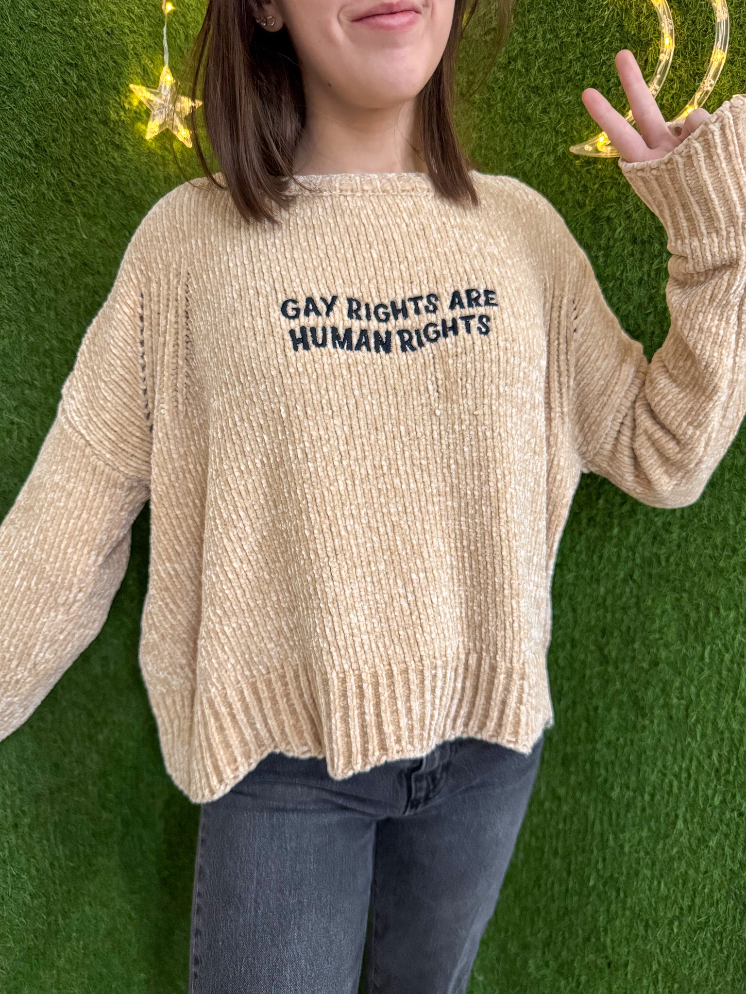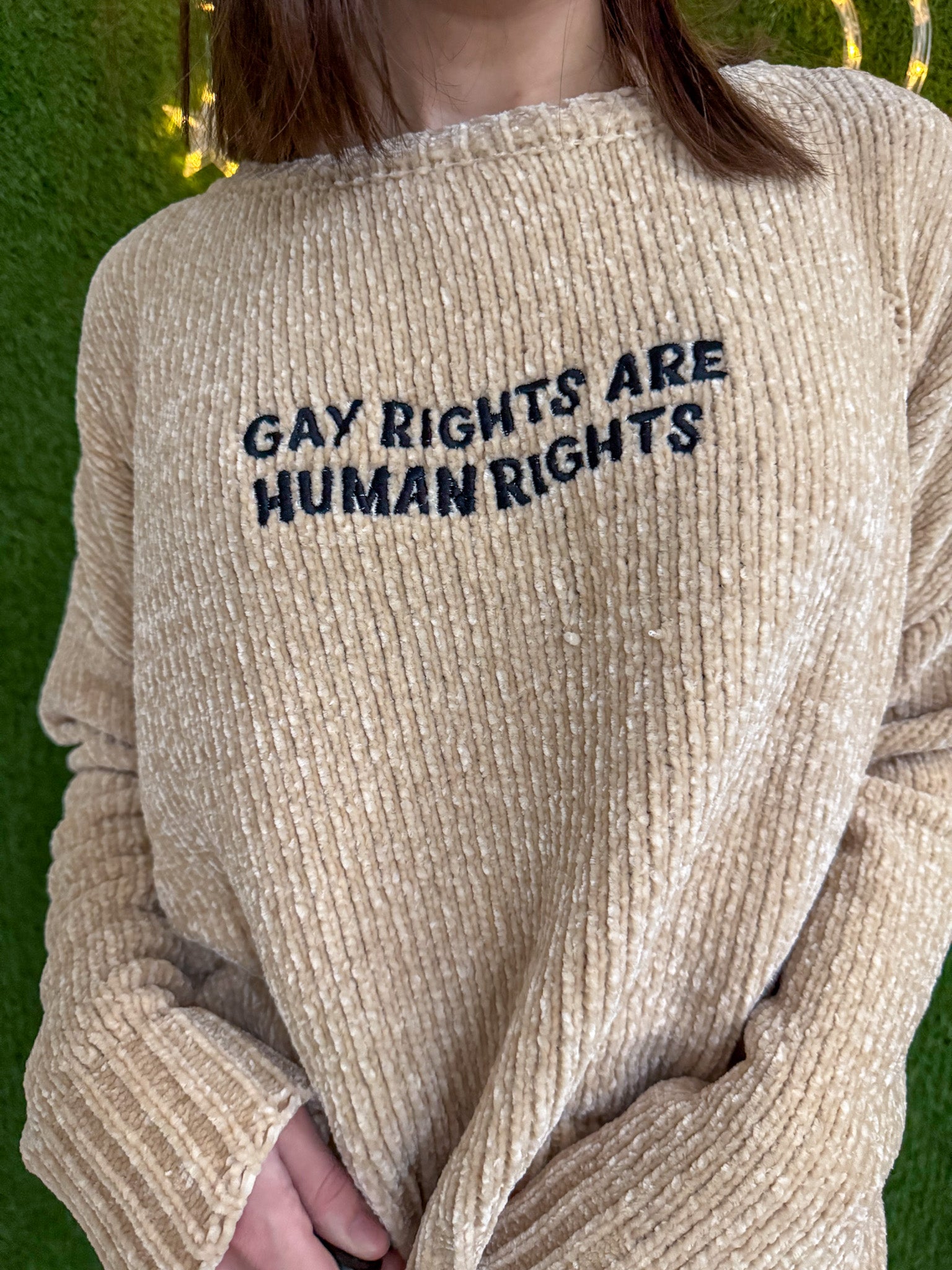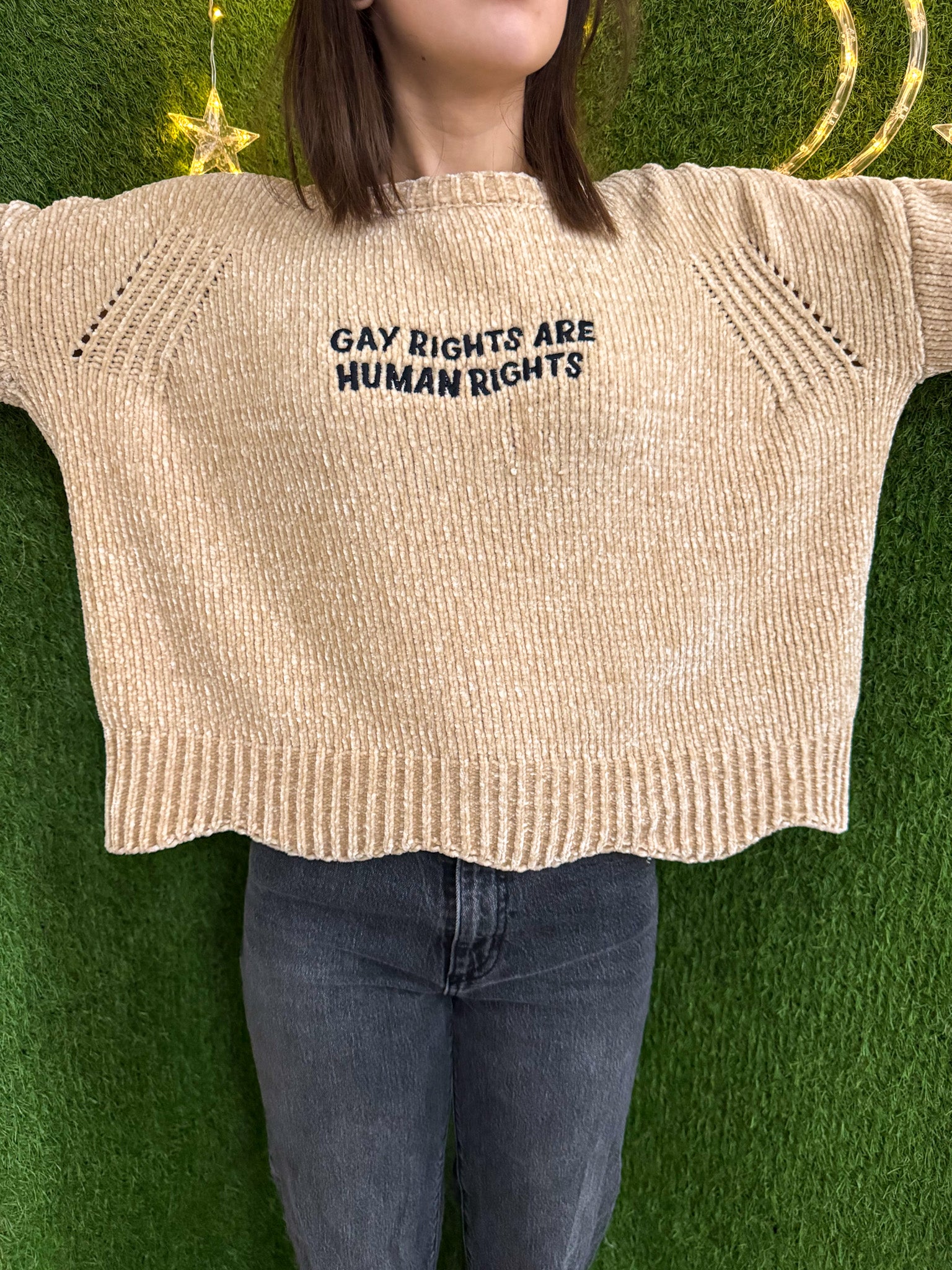 Stay trendy and ethical with our Human Rights Wavy Bottom Cropped Sweater. This one-of-a-kind piece is both sustainable and supportive, as it's made from an upcycled secondhand garment. With stylish embroidery and a slow fashion approach, you can feel good knowing you're supporting our small biz!