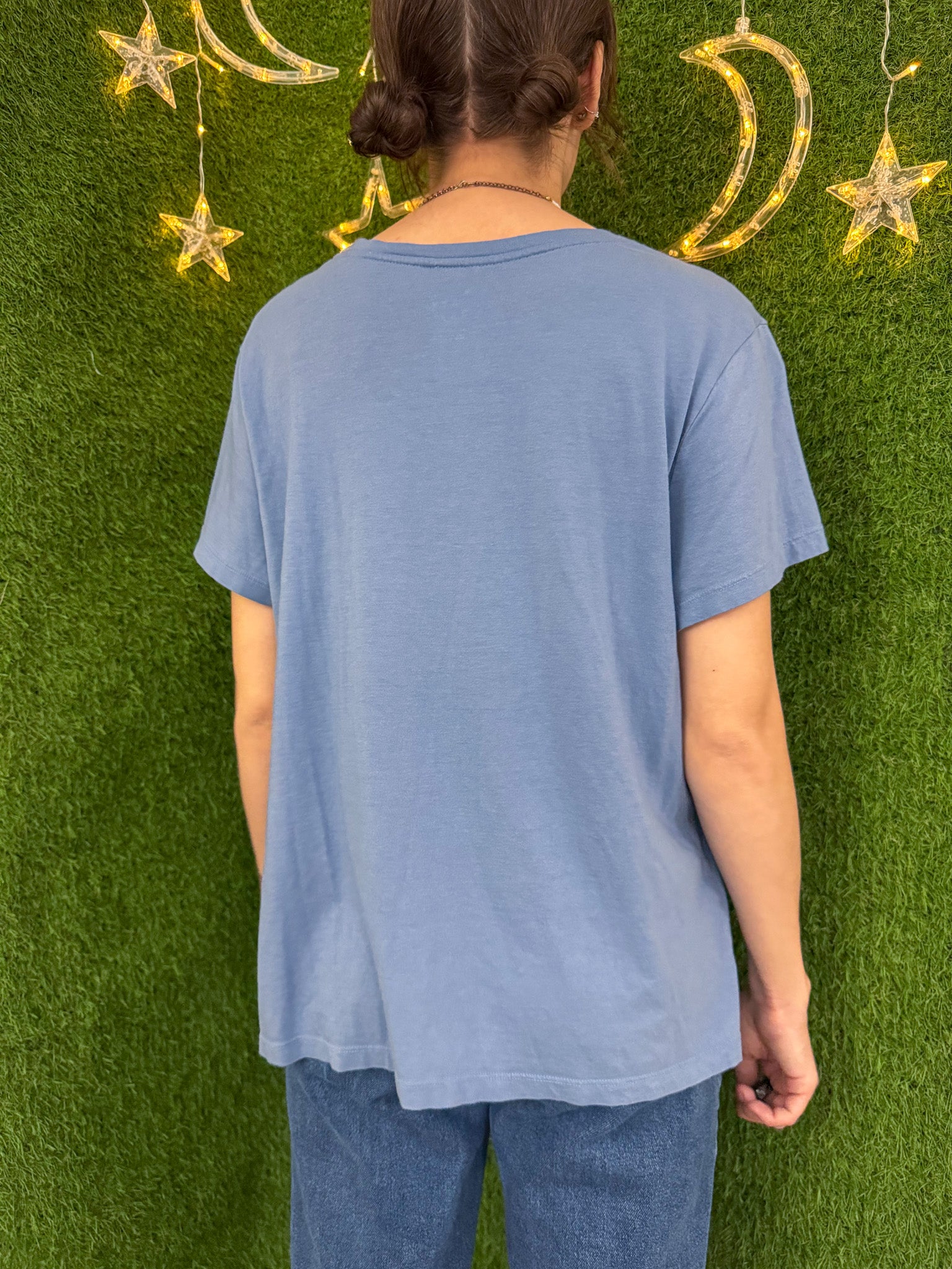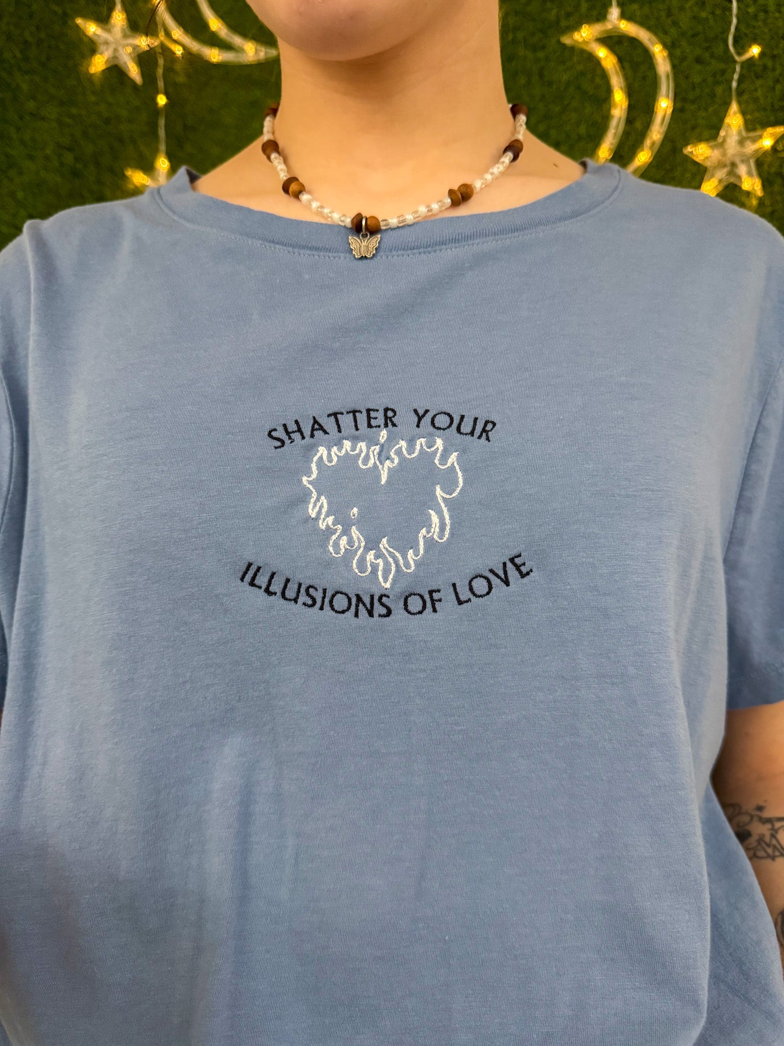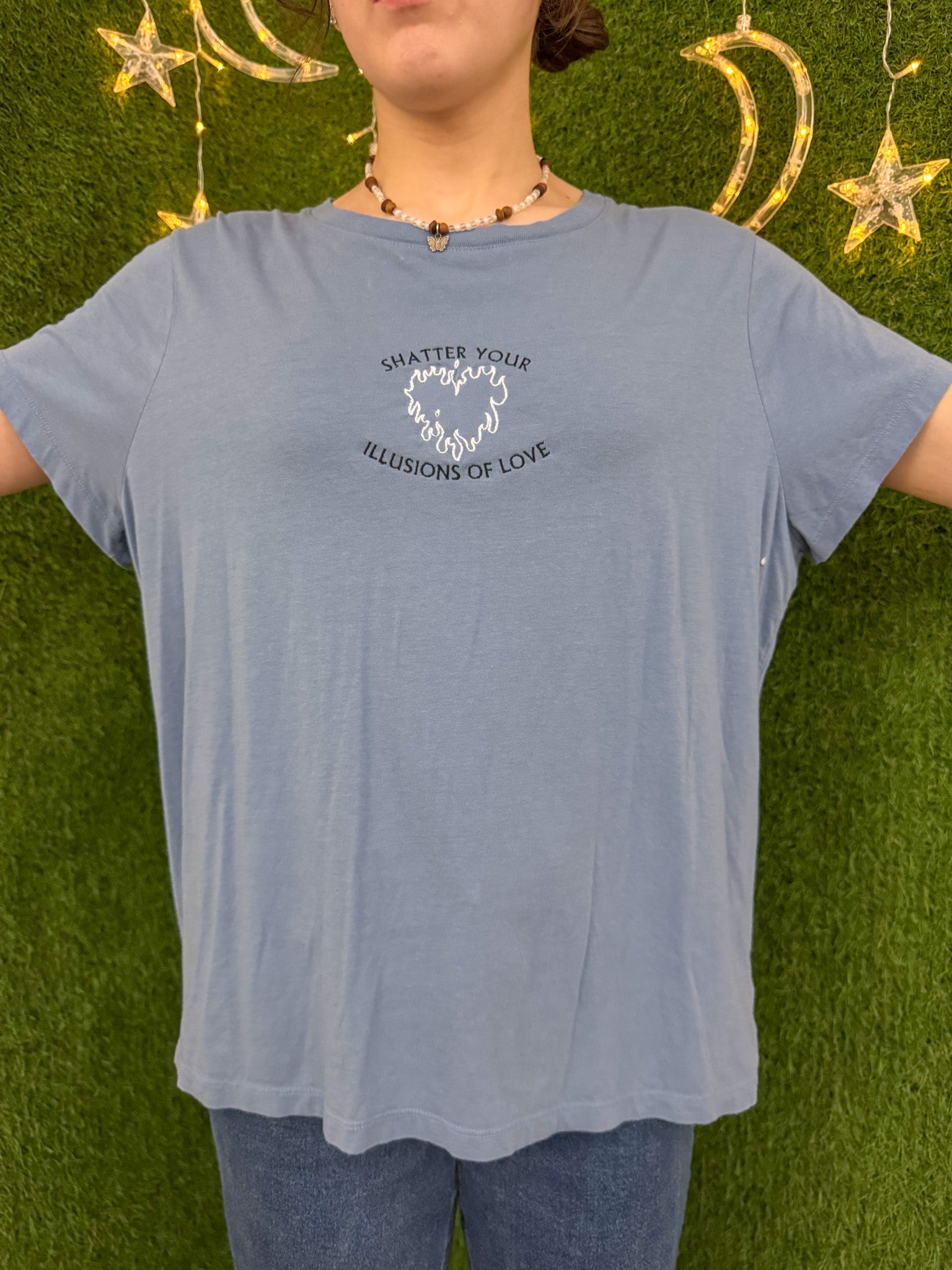 Chic and sustainable, this Illusions of Love Blue T-Shirt is made with love and embroidered details. Support our small business and the environment with upcycled and slow fashion. A stylish and conscious choice for any wardrobe!