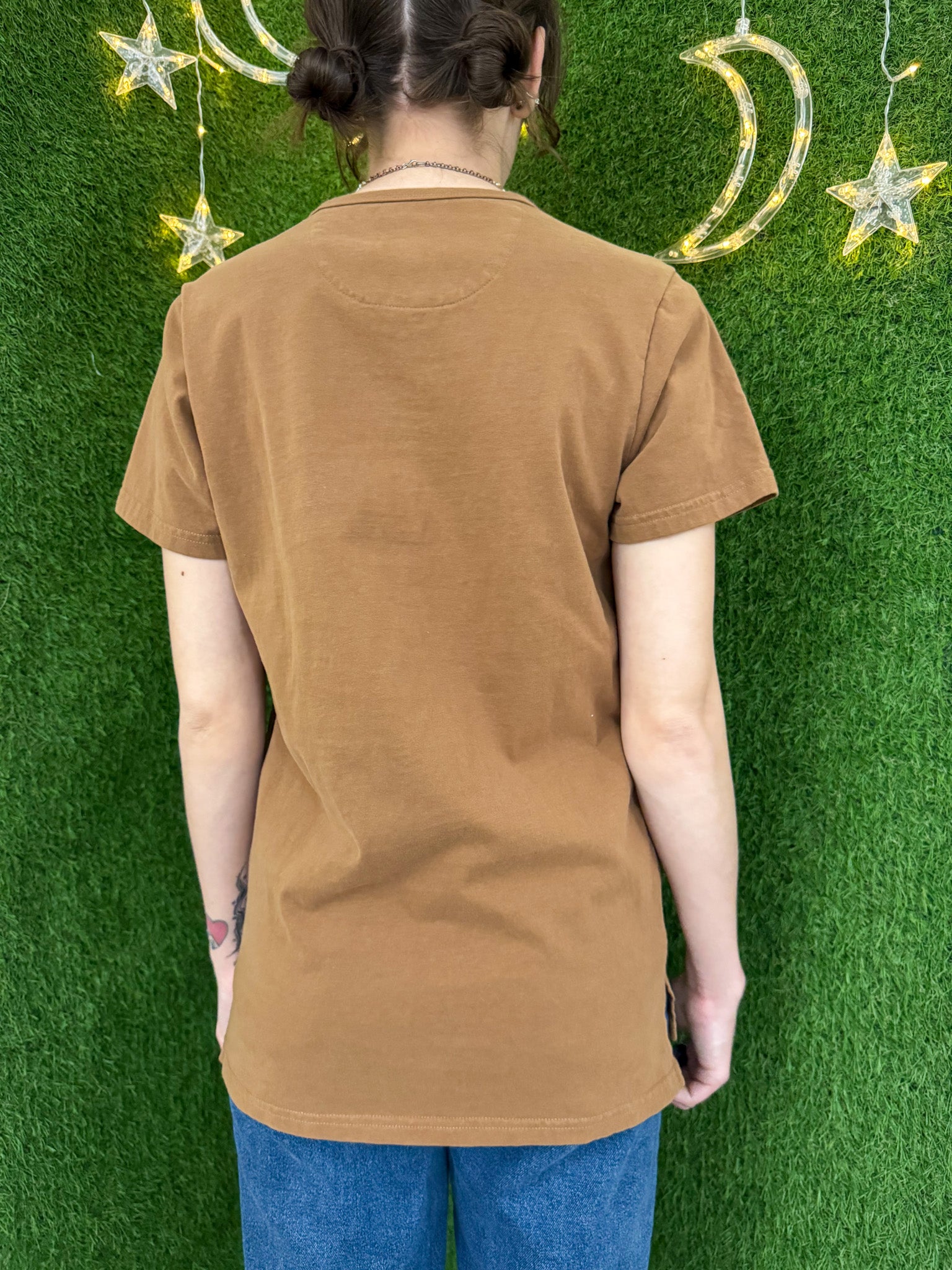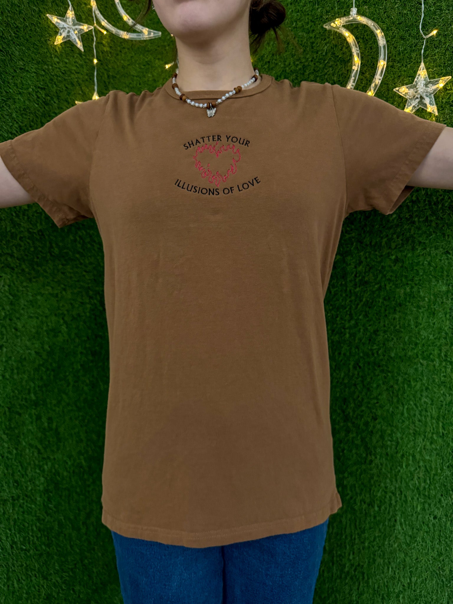 Upgrade your wardrobe with the Illusions of Love Brown T-Shirt. Made with upcycled and sustainable materials, this secondhand garment helps support our small biz. With its embroidered design, it's a must-have for anyone looking to add a unique and stylish touch to their wardrobe. Join the slow fashion movement today<3