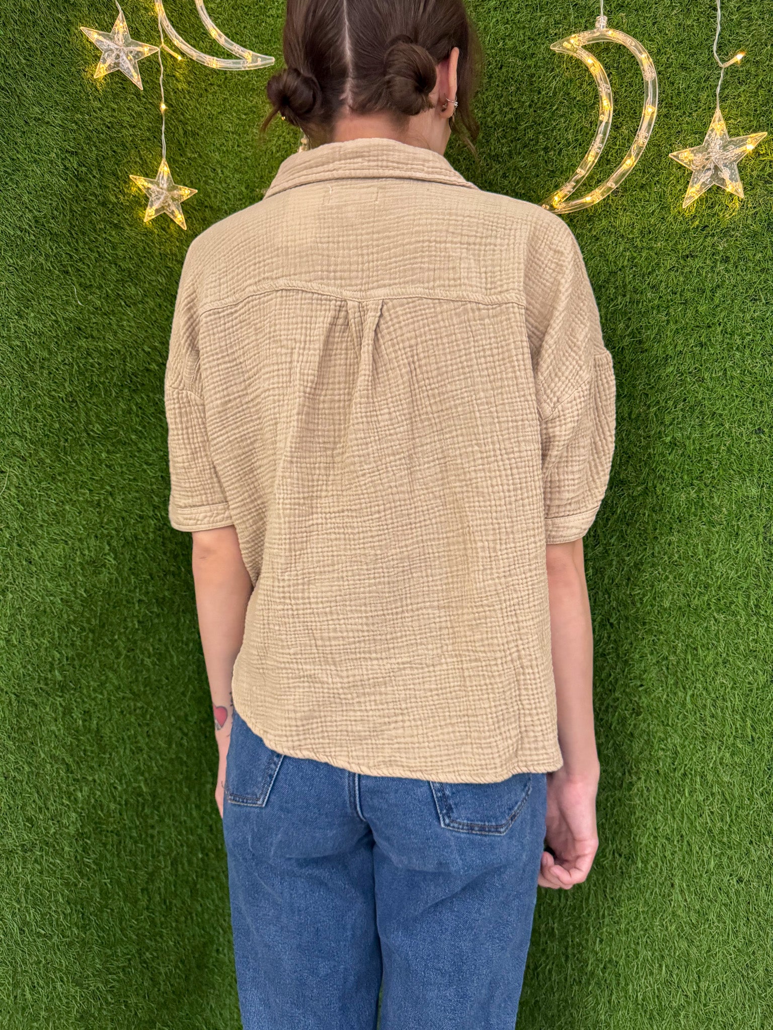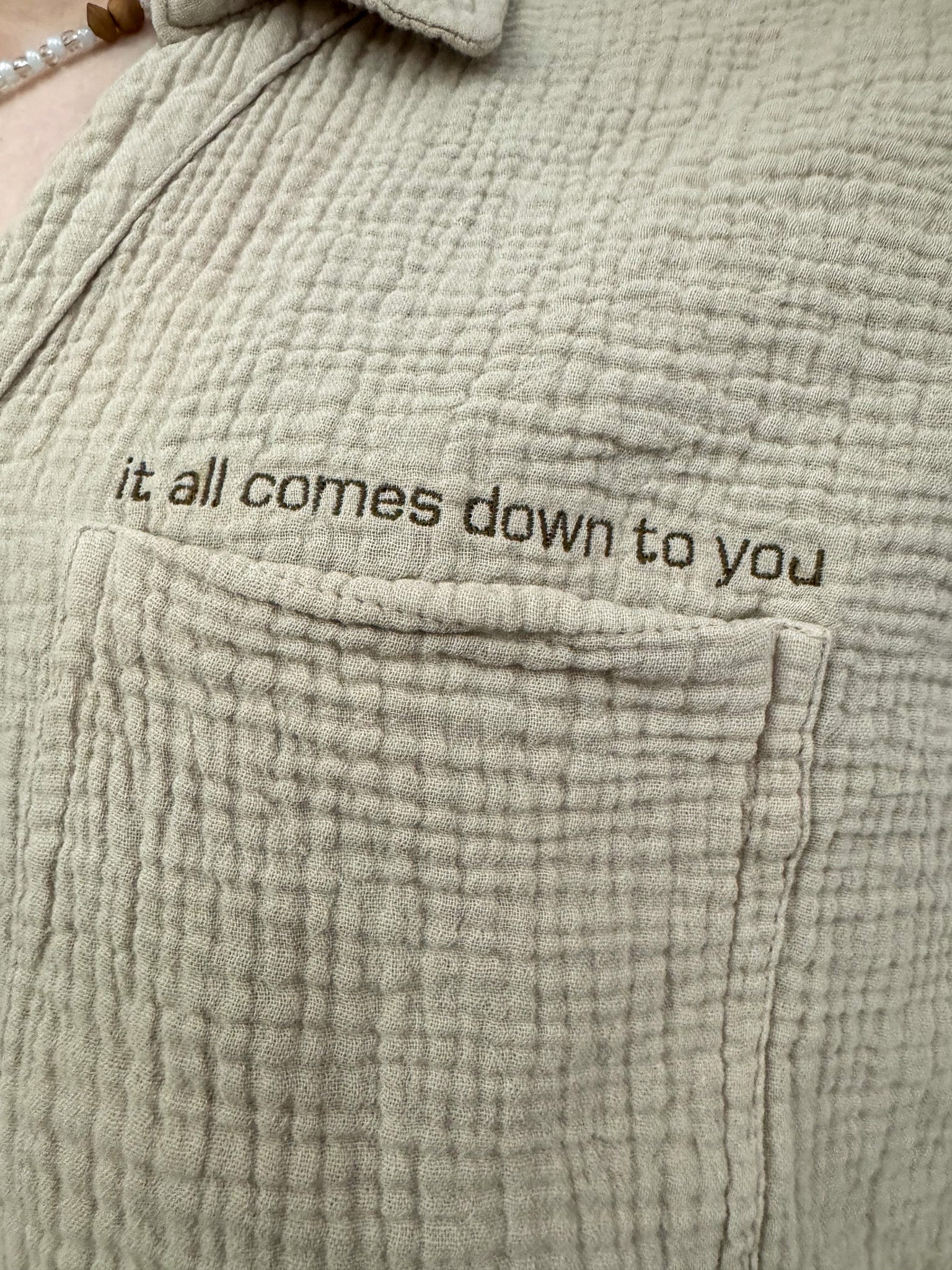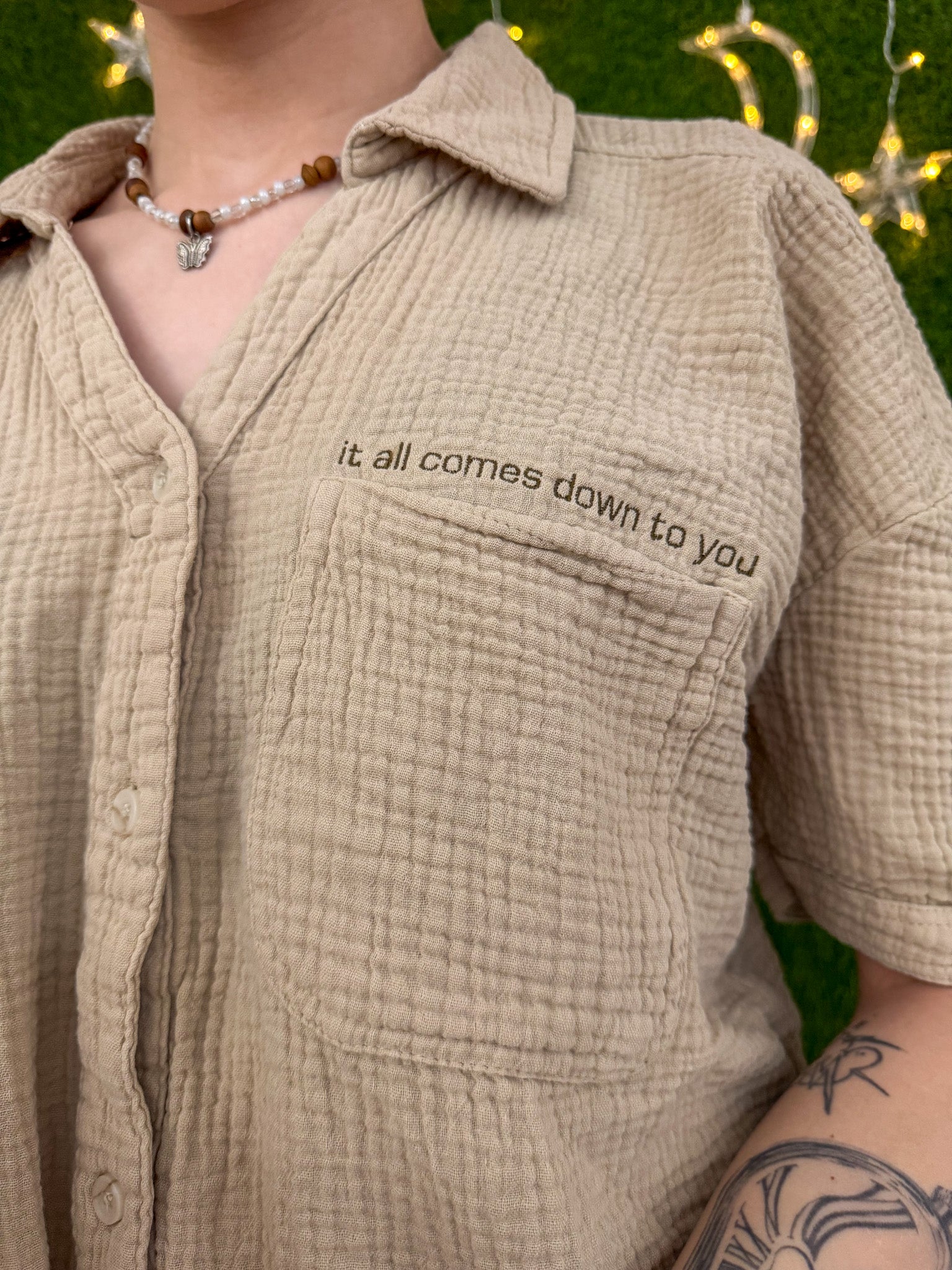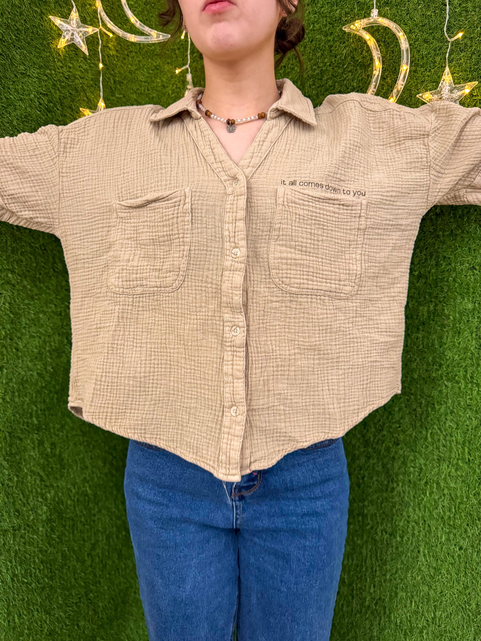 Go green in style with our khaki cropped button up. This upcycled, secondhand garment is not only sustainable but also features beautiful embroidery. Support our small business and slow fashion movement with this versatile piece. It all comes down to you and your fashion choices!