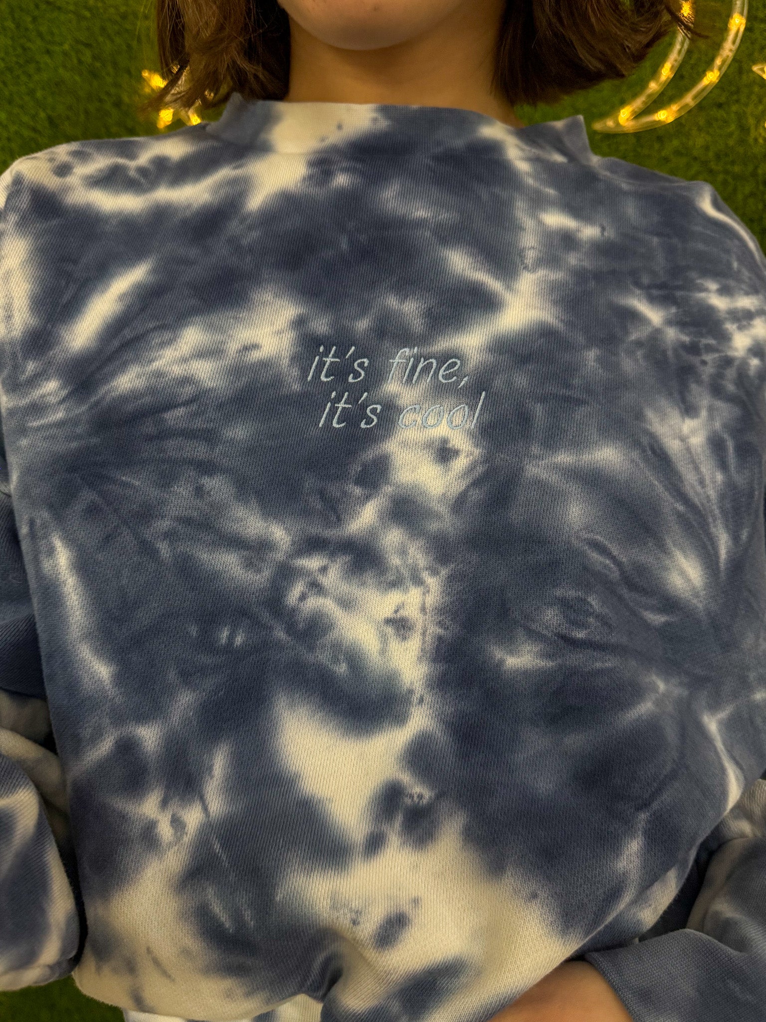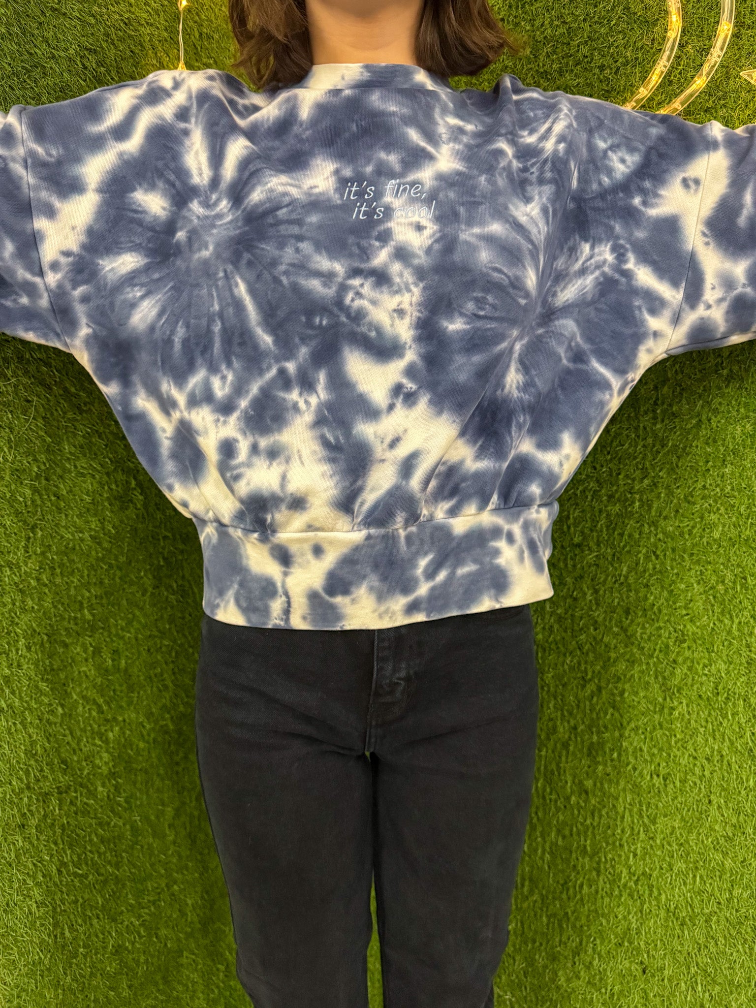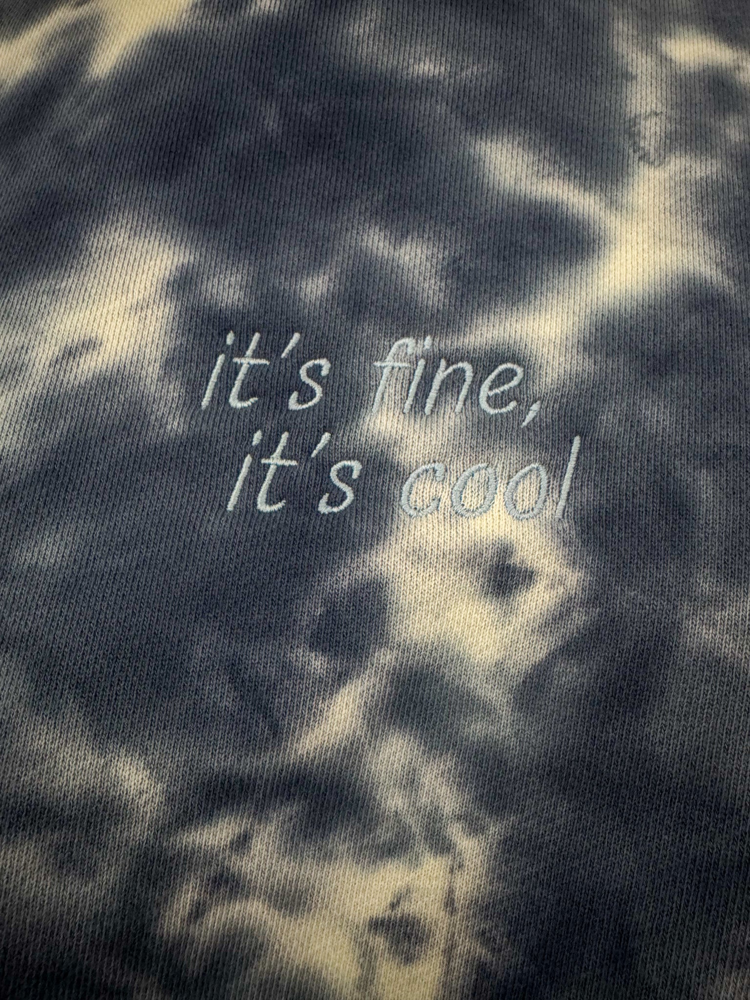 Elevate your style and support small businesses with our It's Fine It's Cool tie dye crewneck. Embroidered with care and made from upcycled materials, this sustainable, secondhand garment is the perfect choice for slow fashion lovers. Add a unique and colorful touch to your wardrobe while making a positive impact<3