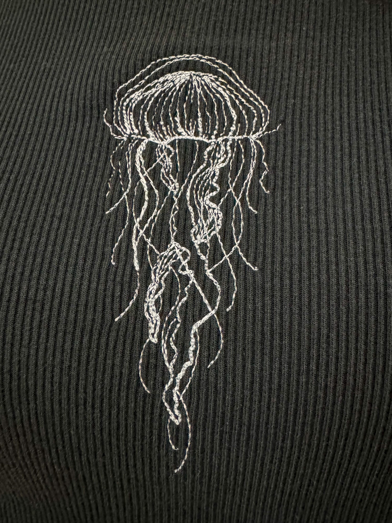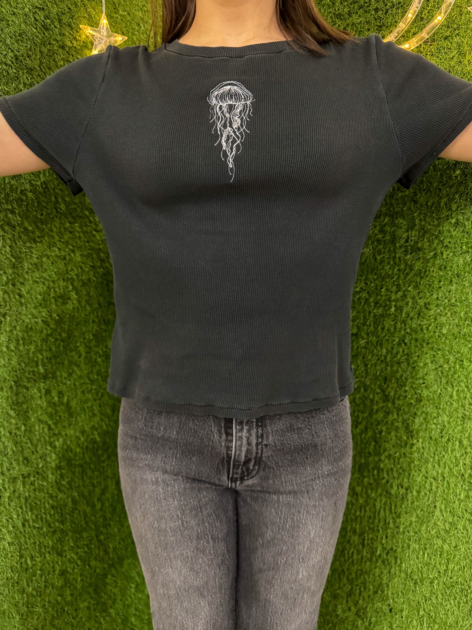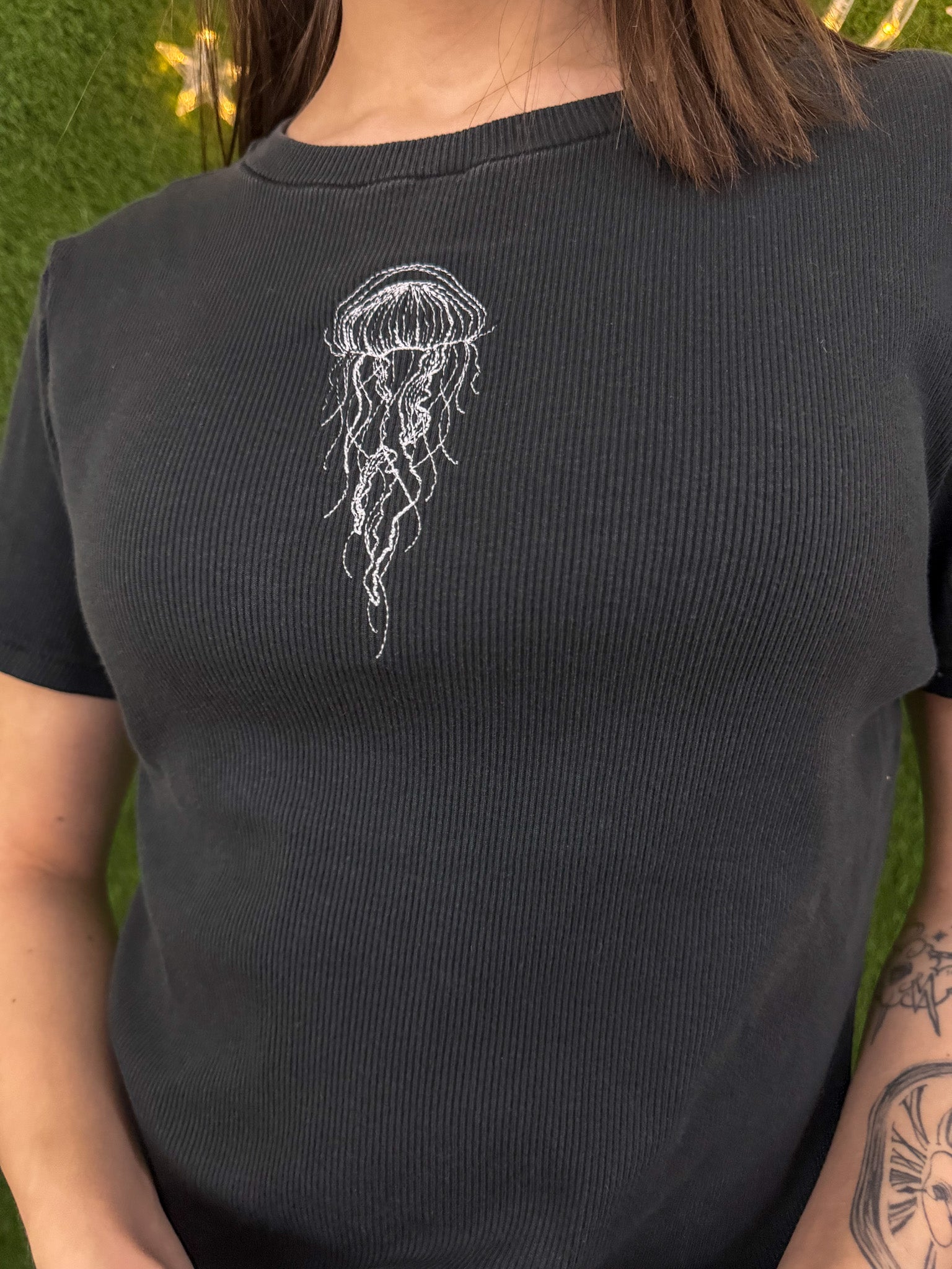 Support sustainable fashion with our Jellyfish Skims Baby Tee. This secondhand garment is upcycled and embroidered, making it a unique addition to your wardrobe while supporting our small biz. Join the slow fashion movement with this eco-friendly and stylish piece!