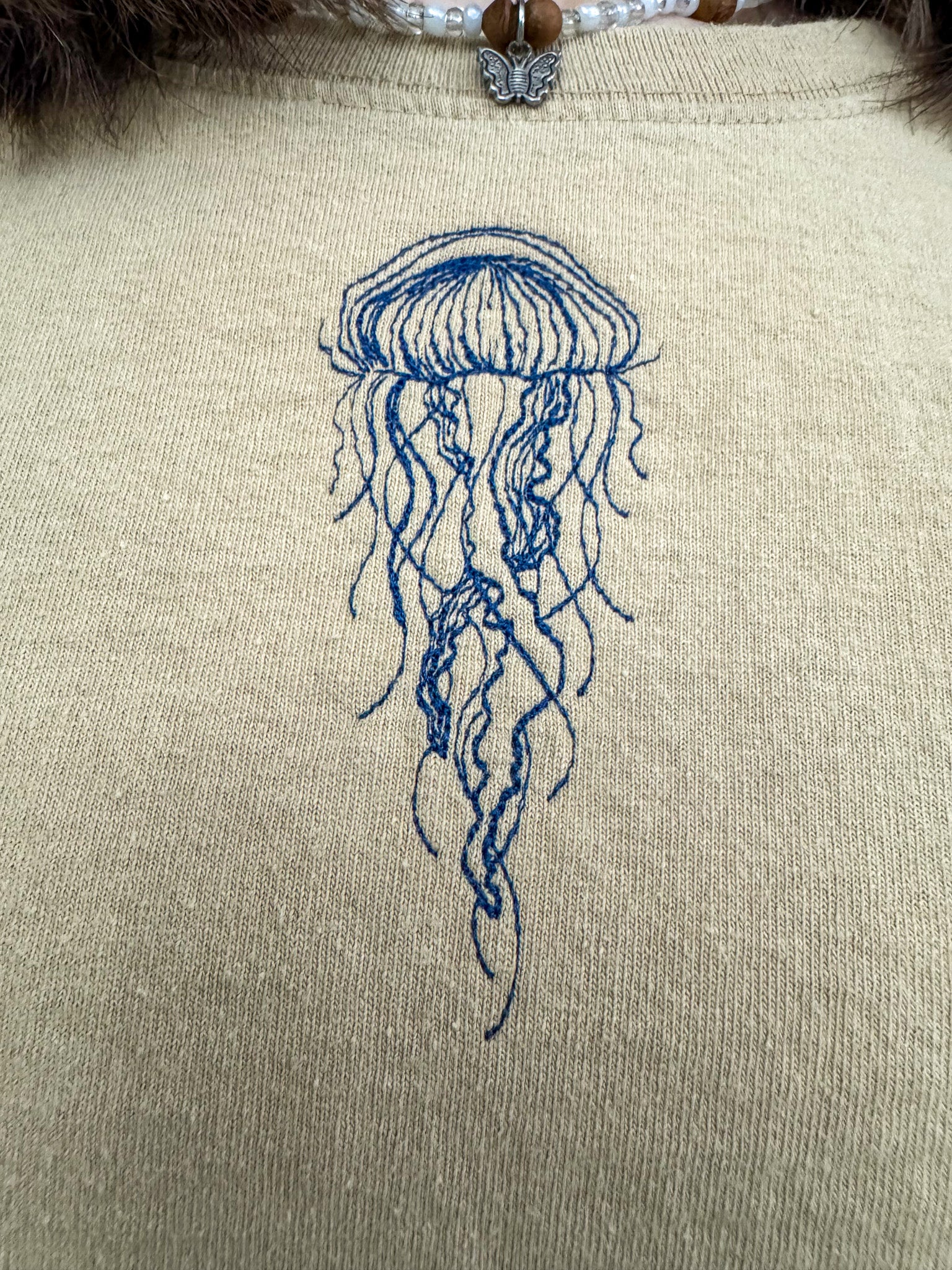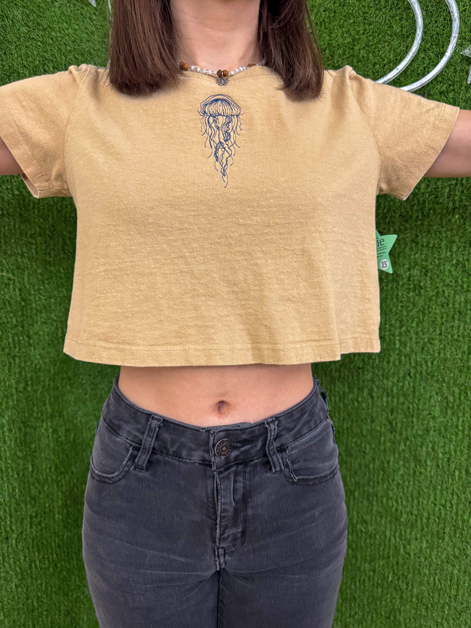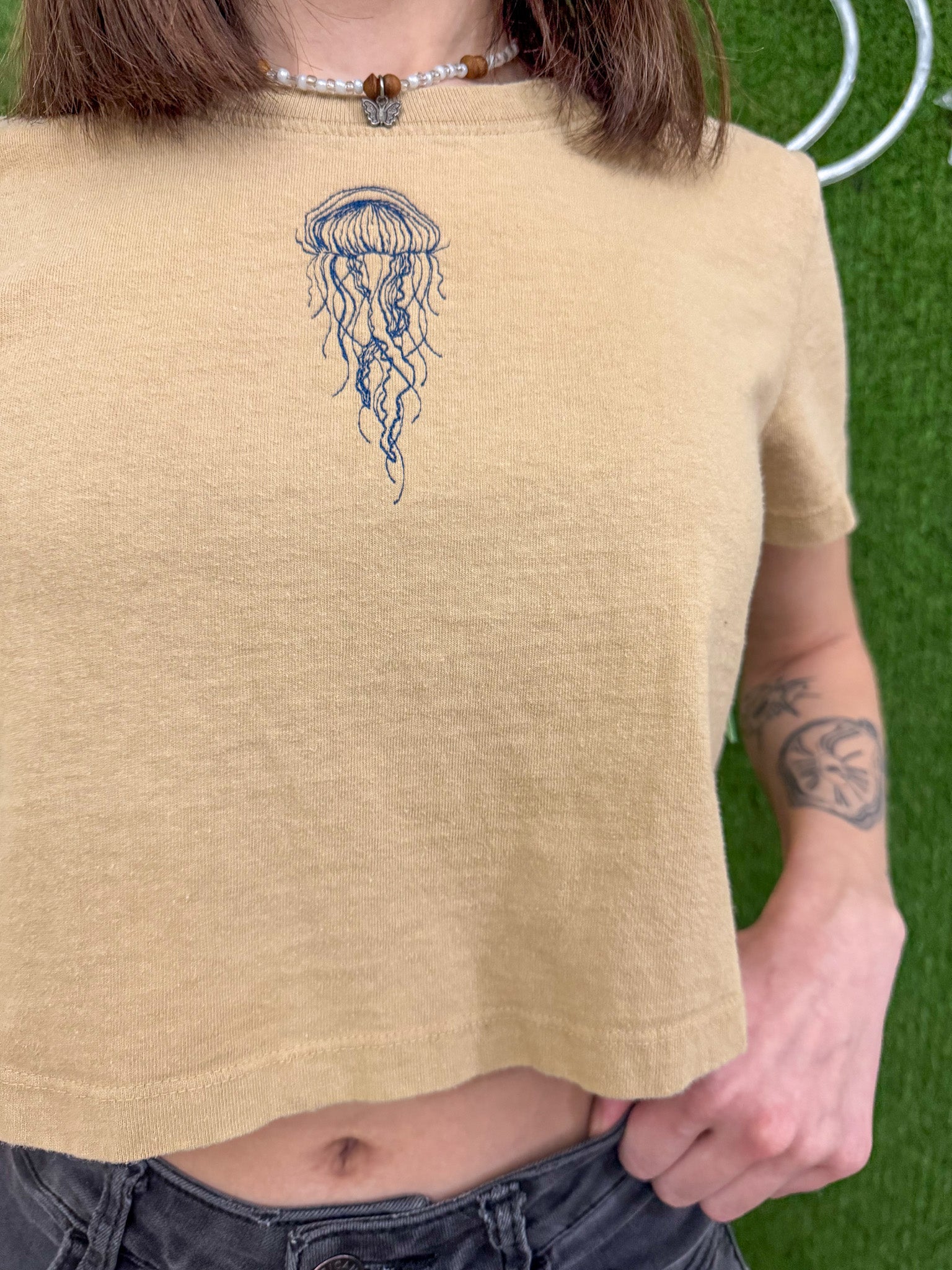 Embrace sustainable slow fashion with our Jellyfish Tan Cropped Tee. Expertly embroidered, this top is made from discarded secondhand garments, supporting our small biz and the environment. Upcycled with a playful tone, this quirky tee is a must-have for conscious fashion lovers. Support our small biz with style! 🐙♻️