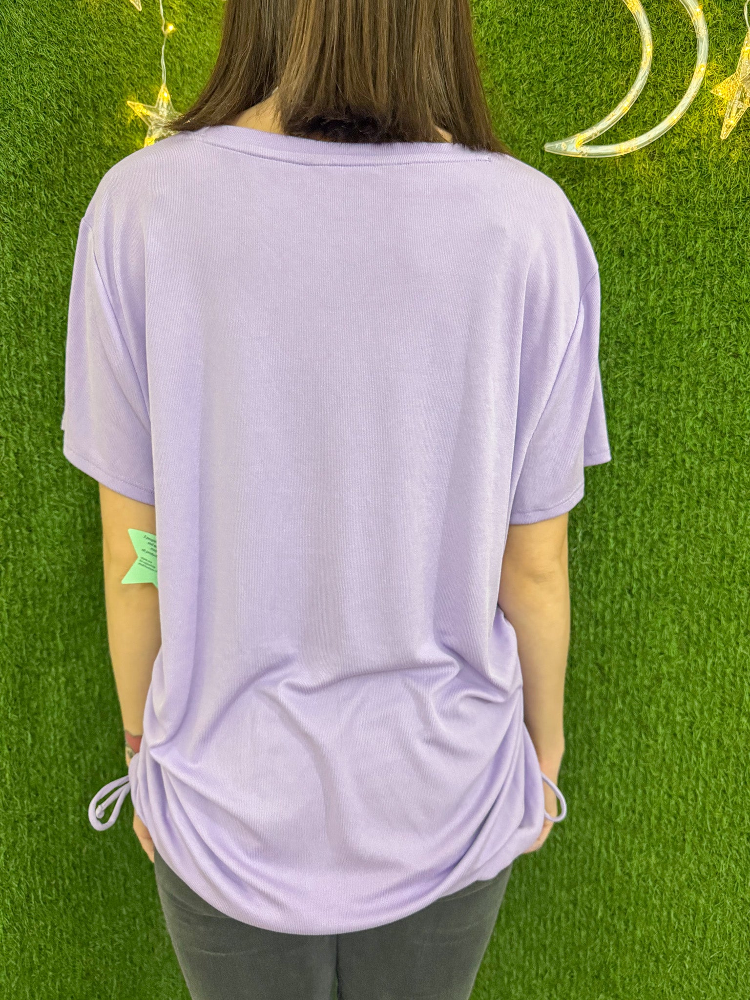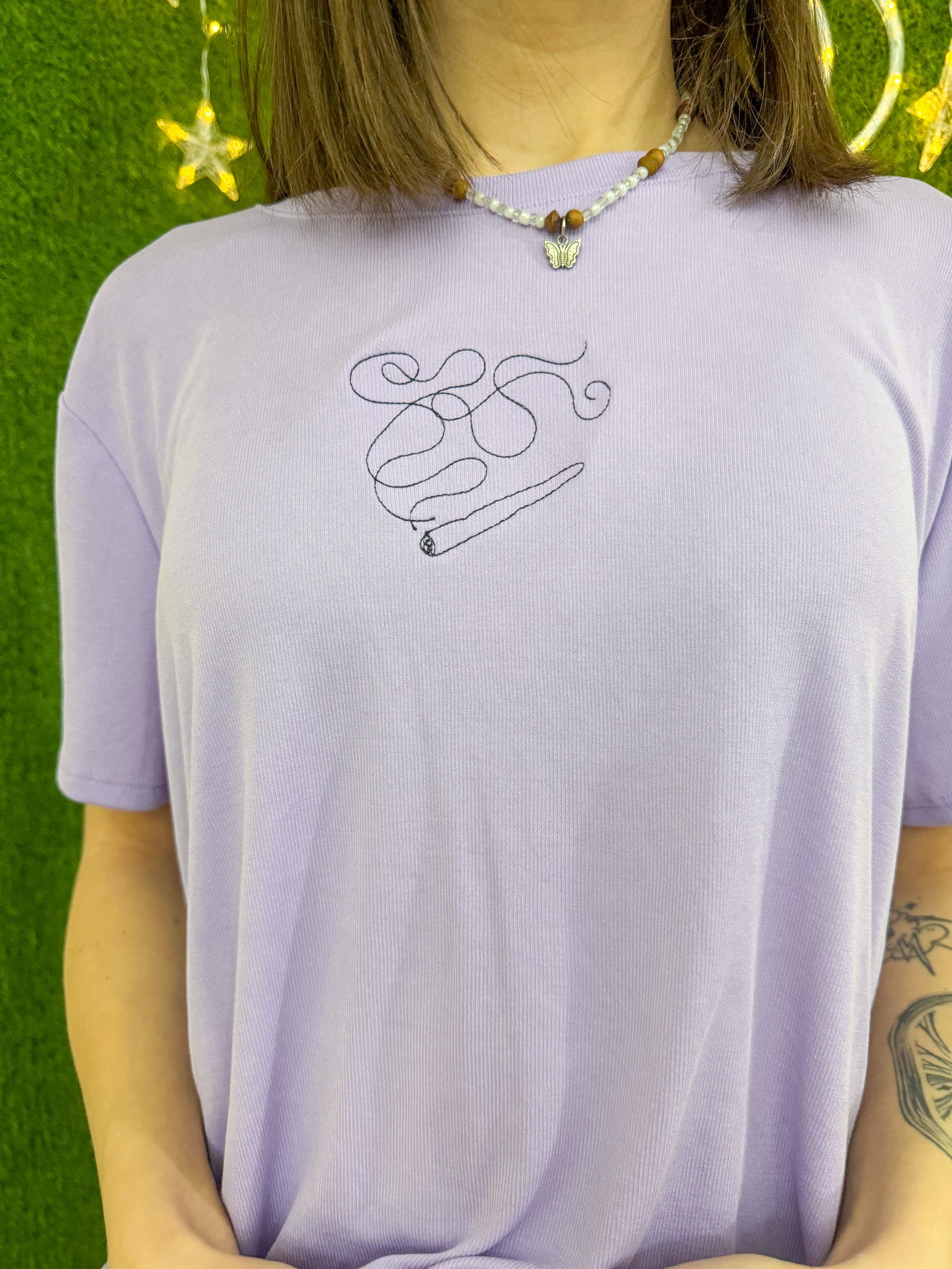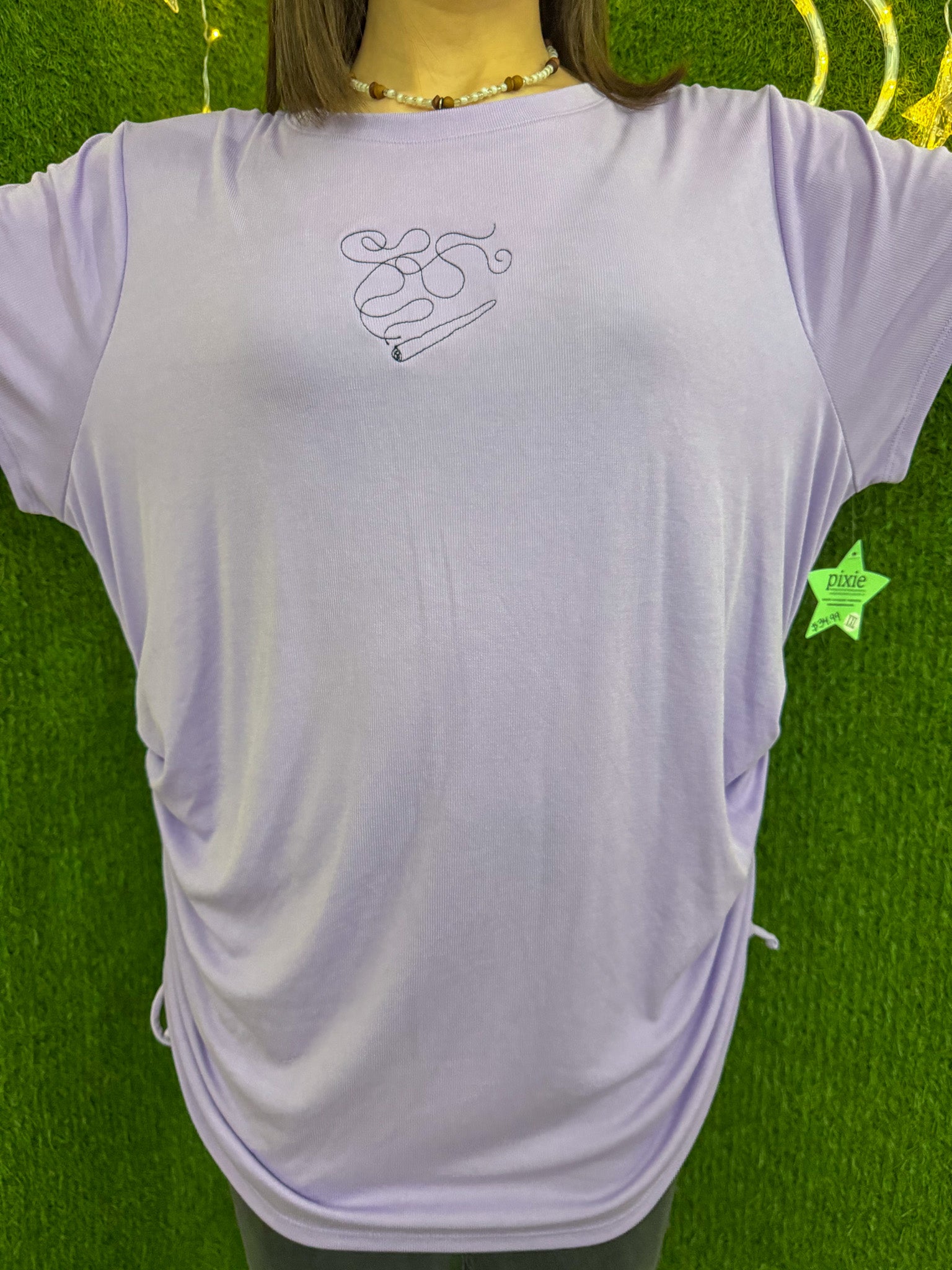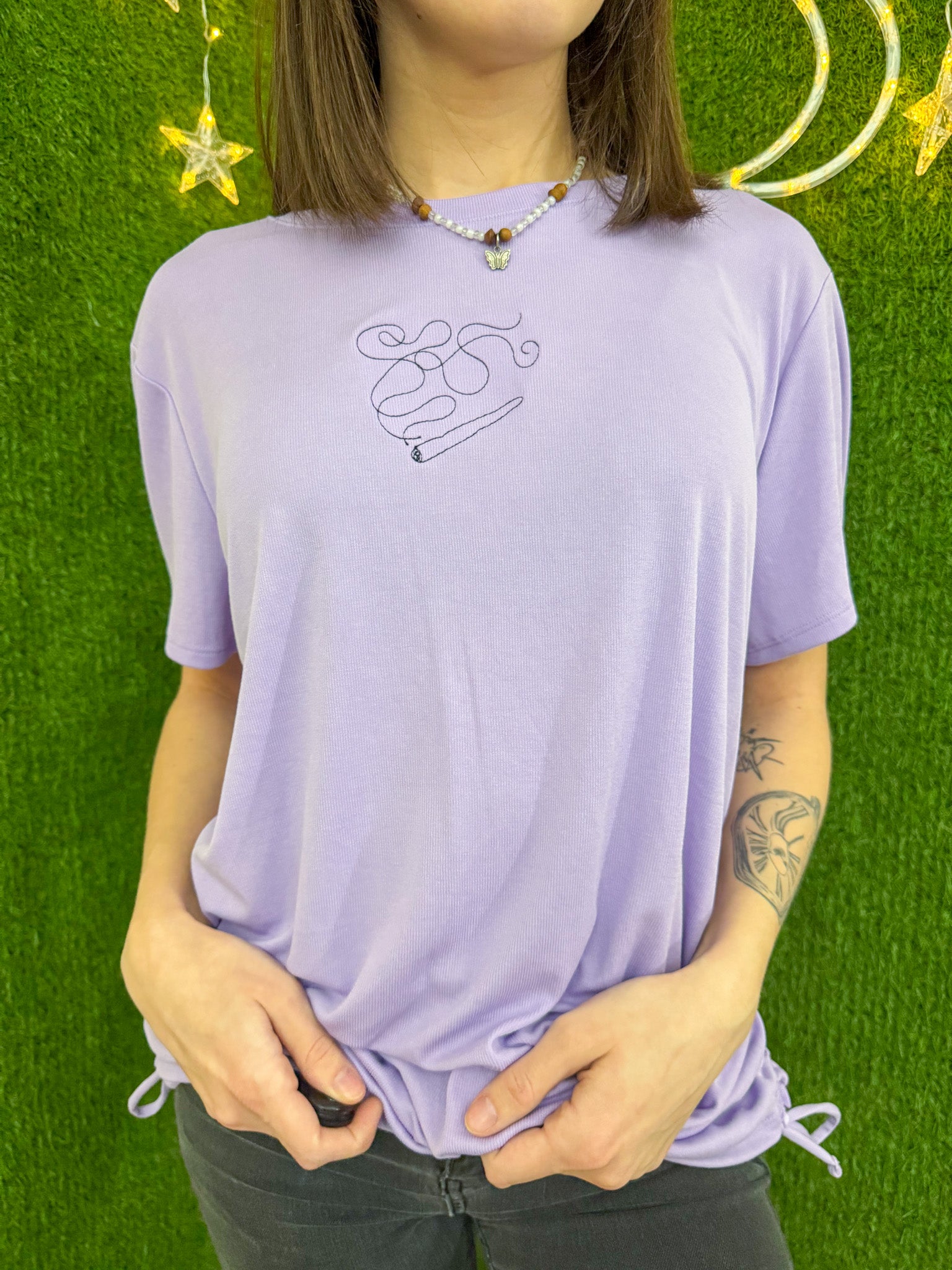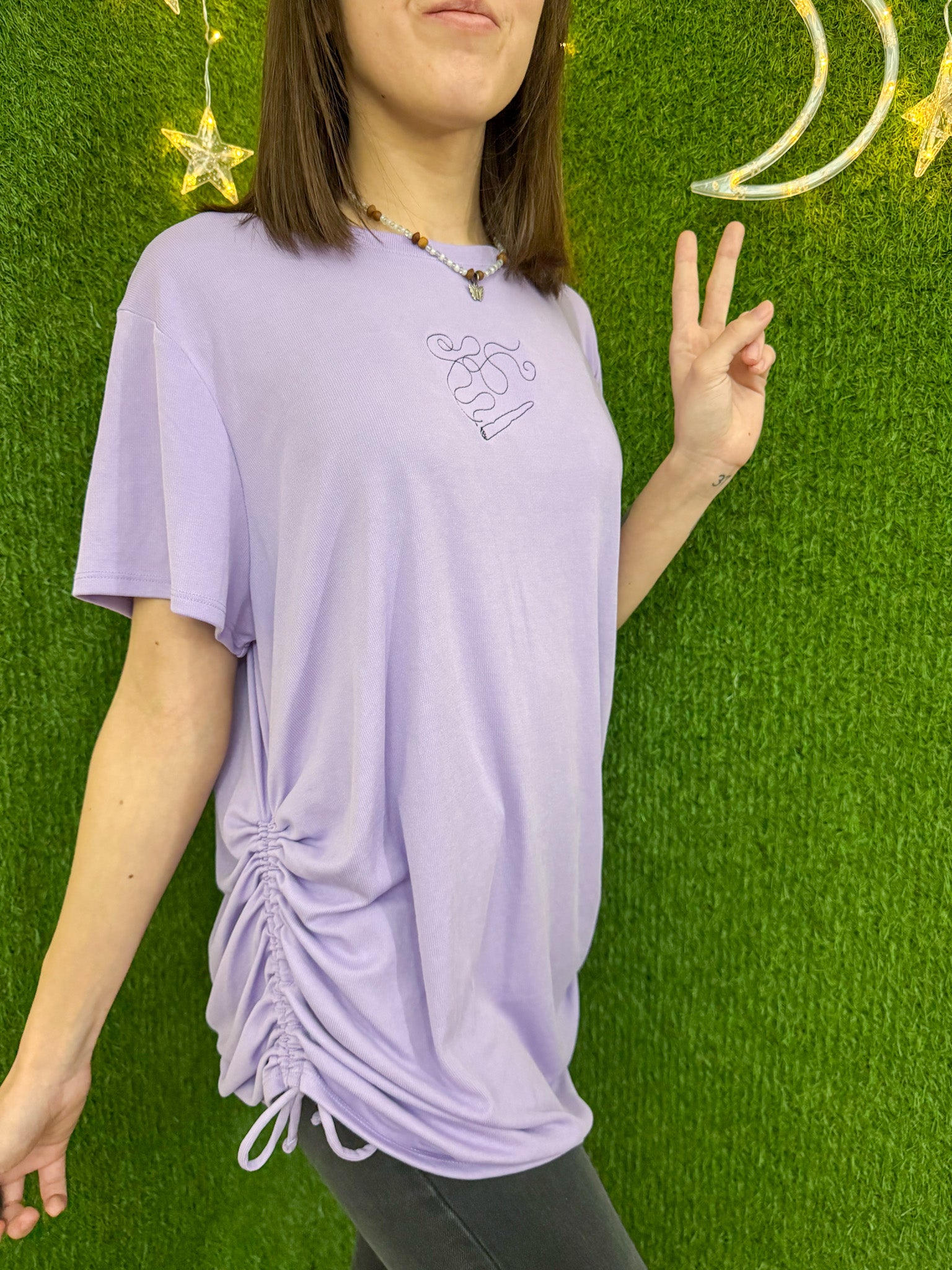 Rock this embroidered lilac tee with a playful side cinch. Support our small biz and sustainability efforts while staying chic in this upcycled, slow fashion piece!