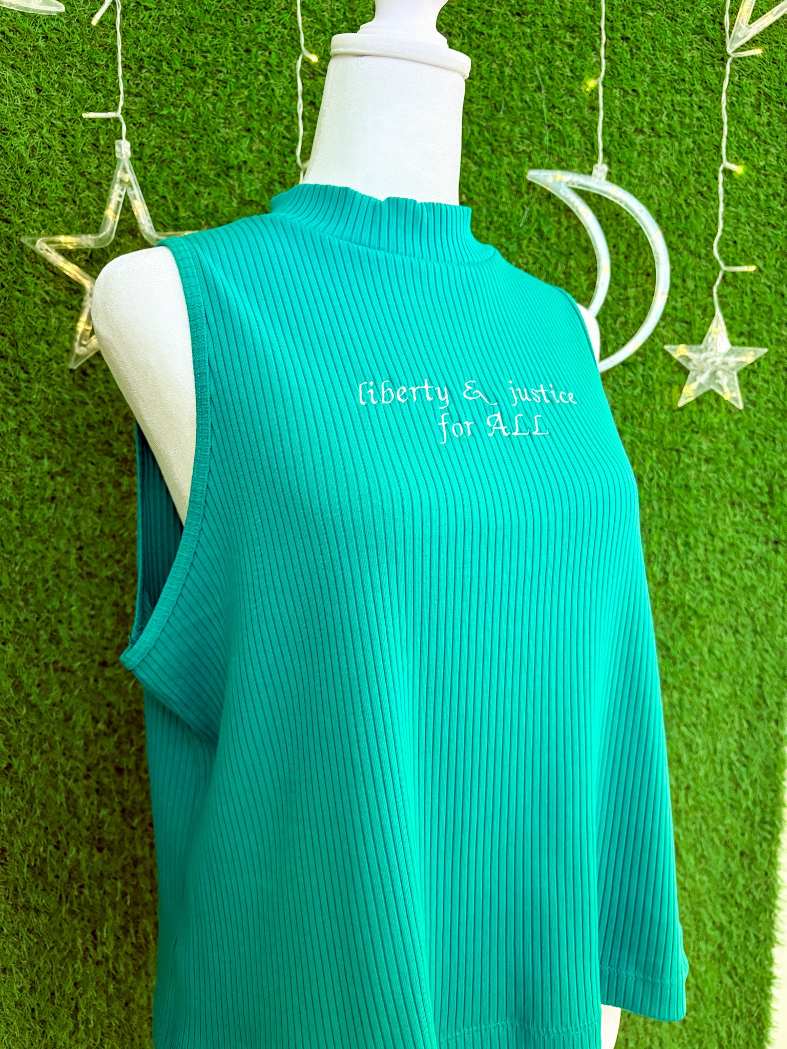 This Liberty & Justice for ALL Green Turtleneck Ribbed Tank is a sustainable statement piece upcycled from a secondhand garment. Featuring delicate embroidered details, it embodies slow fashion values while supporting our small business. Perfect for those who care about the planet and style, this tank offers a unique, eco-friendly addition to your wardrobe!
