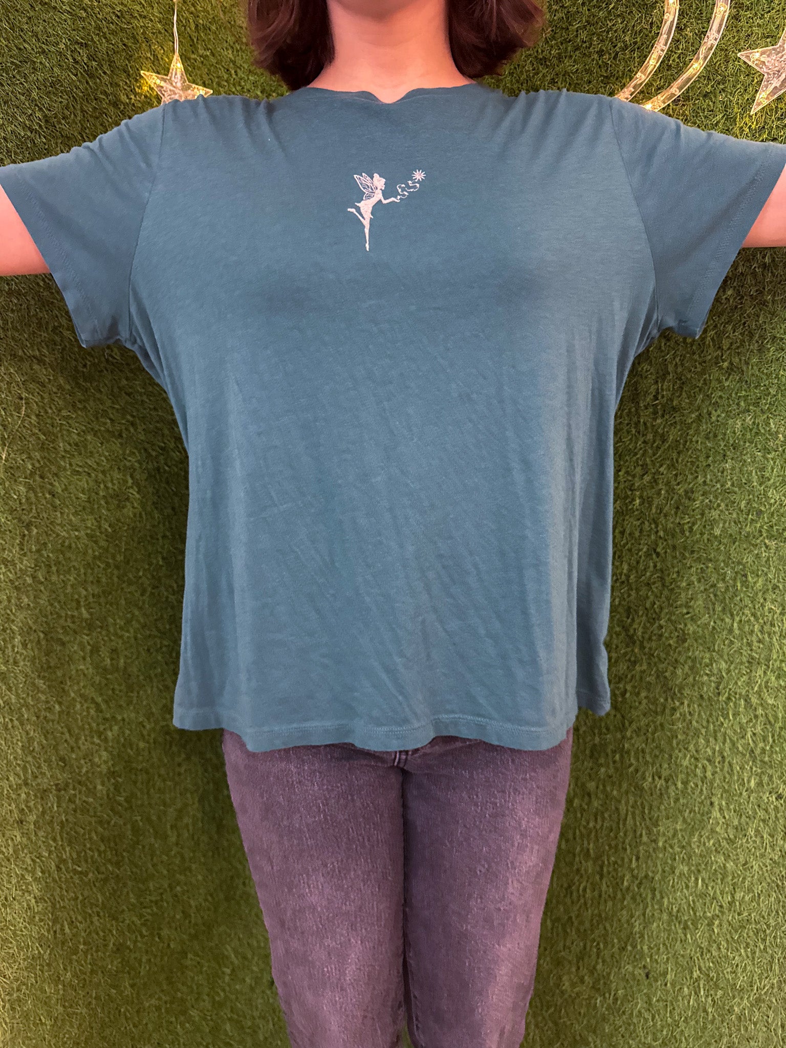 Support our small biz with this Little Fairy Teal Blue T-Shirt. Made from a secondhand garment, it's upcycled and sustainable, perfect for the slow fashion trend. The intricate embroidered design adds a special touch to this unique and eco-friendly piece<3