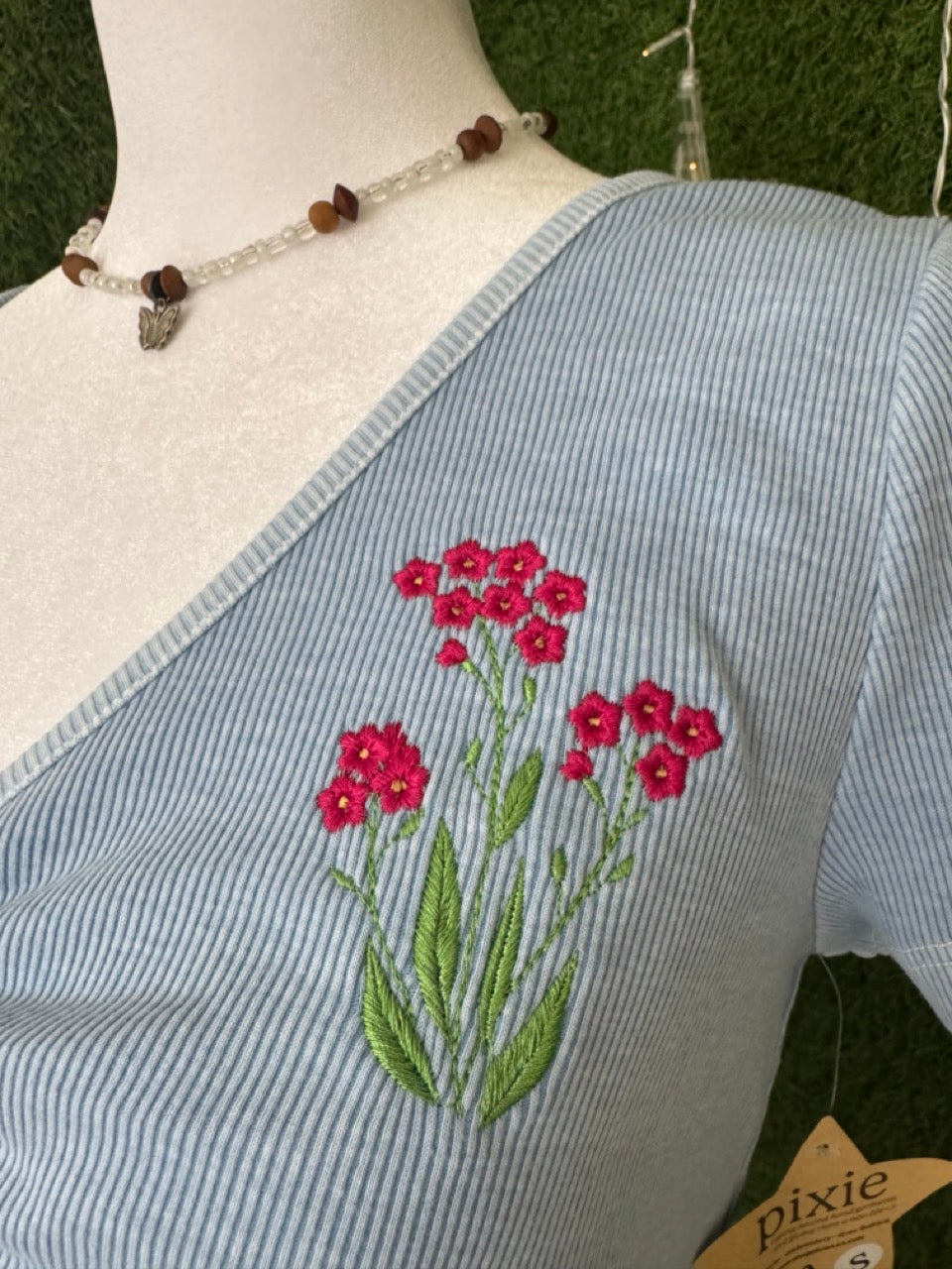 This Little Flowers Cinched Front Blue Baby Tee brings charm and sustainability together with its delicate embroidery, lovingly upcycled on a secondhand garment. Perfect for trendsetters, this slow fashion piece adds a playful touch to any wardrobe while supporting eco-friendly style!