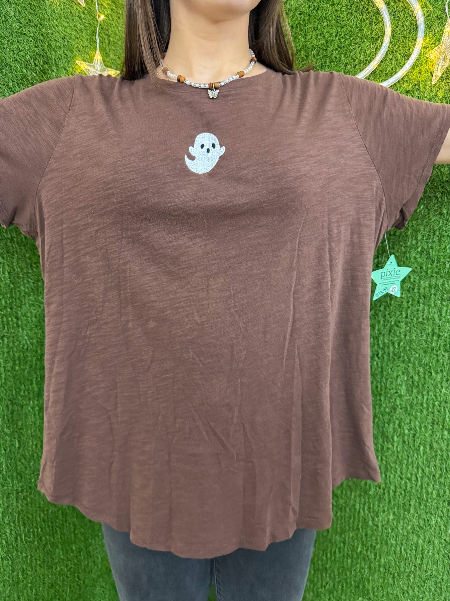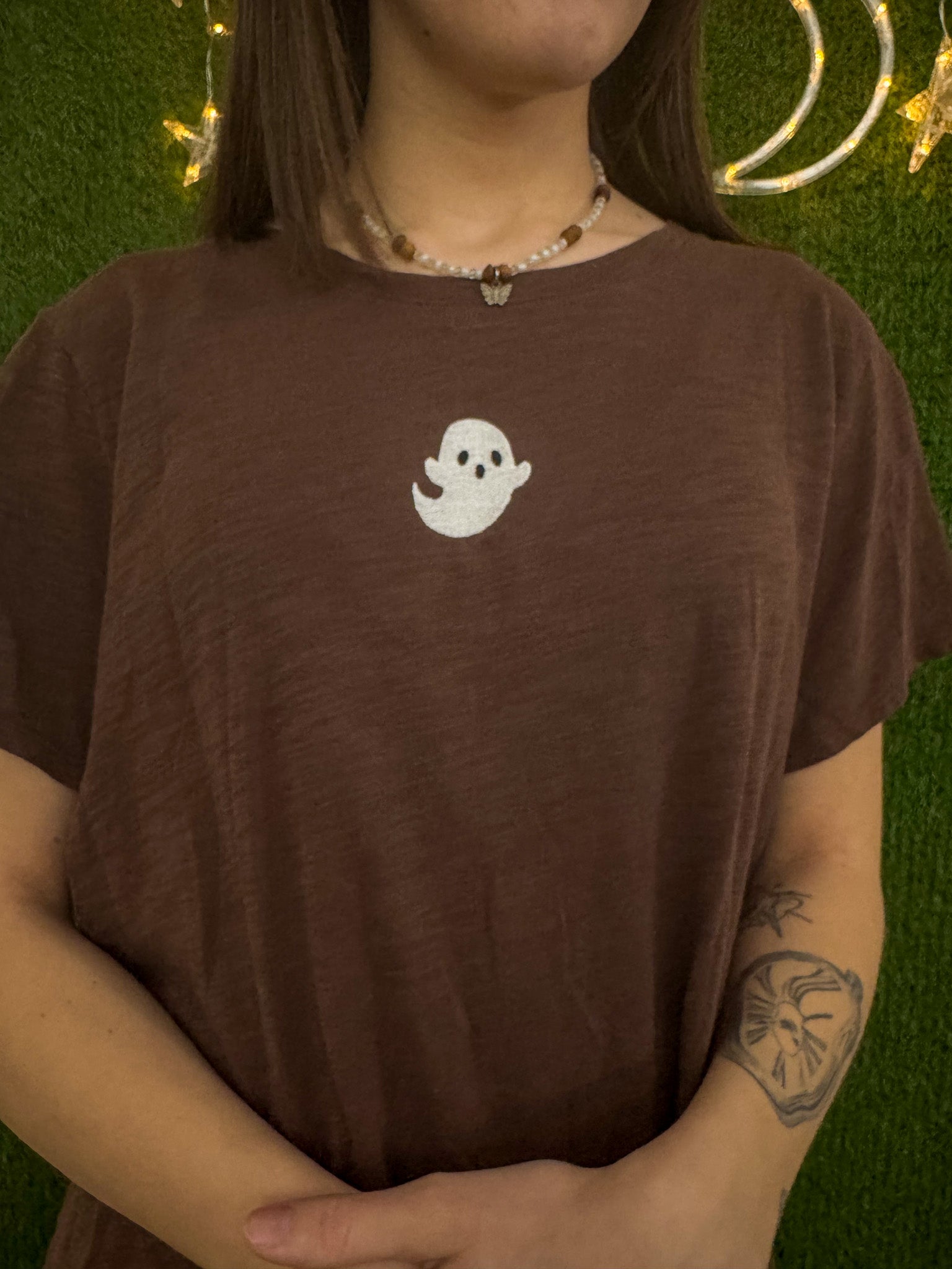 Add some playful style to your wardrobe with our Little Ghost Brown T-Shirt! This embroidered shirt not only supports our small biz, but it's also upcycled from a discarded secondhand garment, making it sustainable and a part of the slow fashion movement!