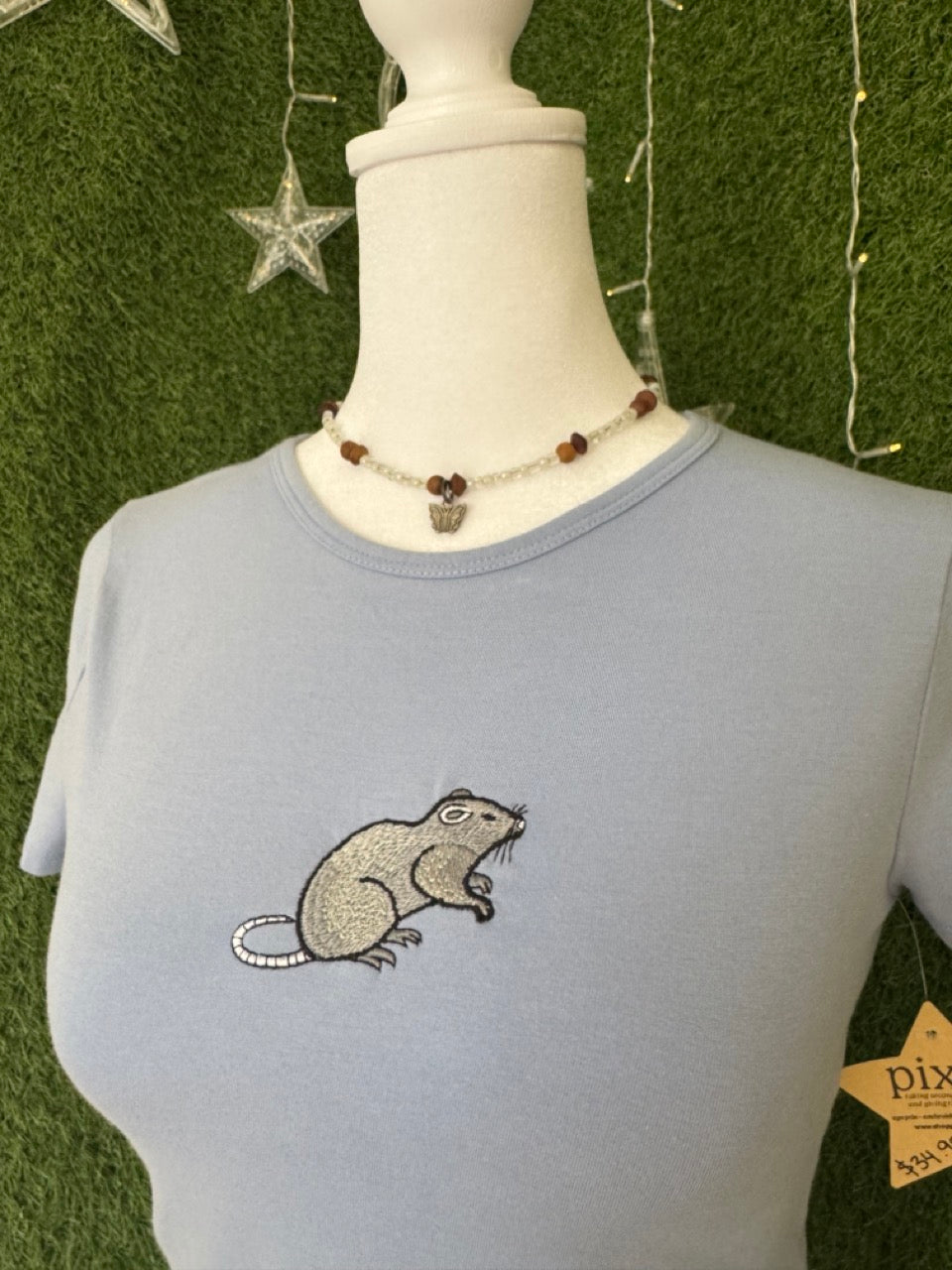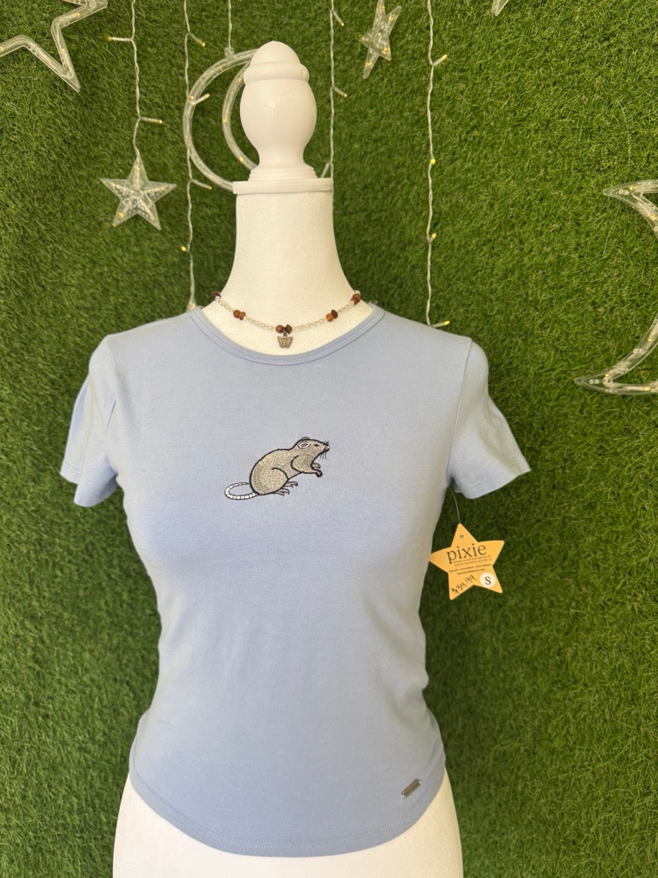 Add a dash of charm with our Little Rat Blue Baby Tee, lovingly upcycled on a secondhand garment. This tee features whimsical embroidered details, making a delightfully unique top. Embrace slow fashion with a playful touch, giving this baby tee a fresh life and a cozy story to tell. Perfect for adventurers who love comfy, conscious style!