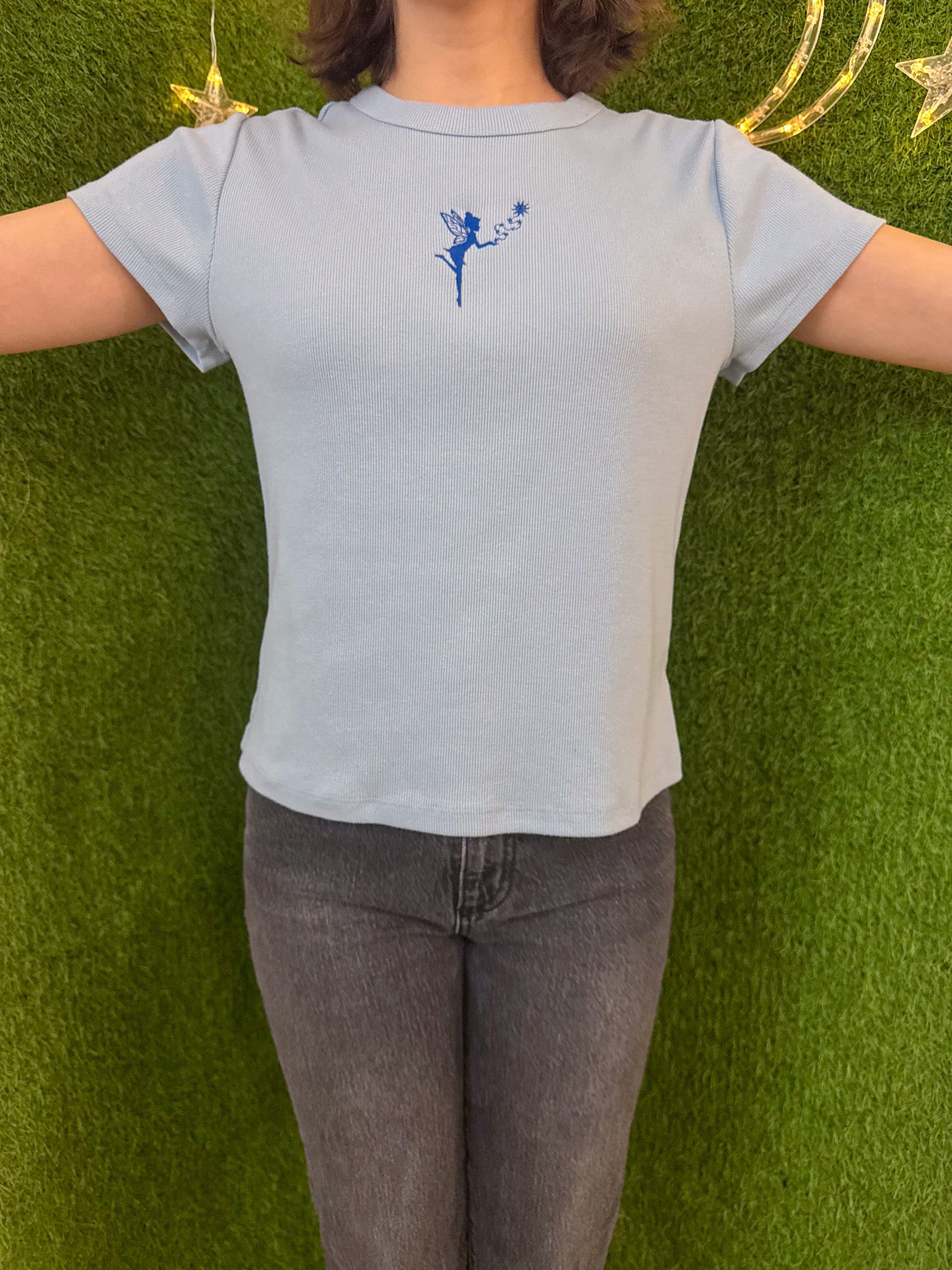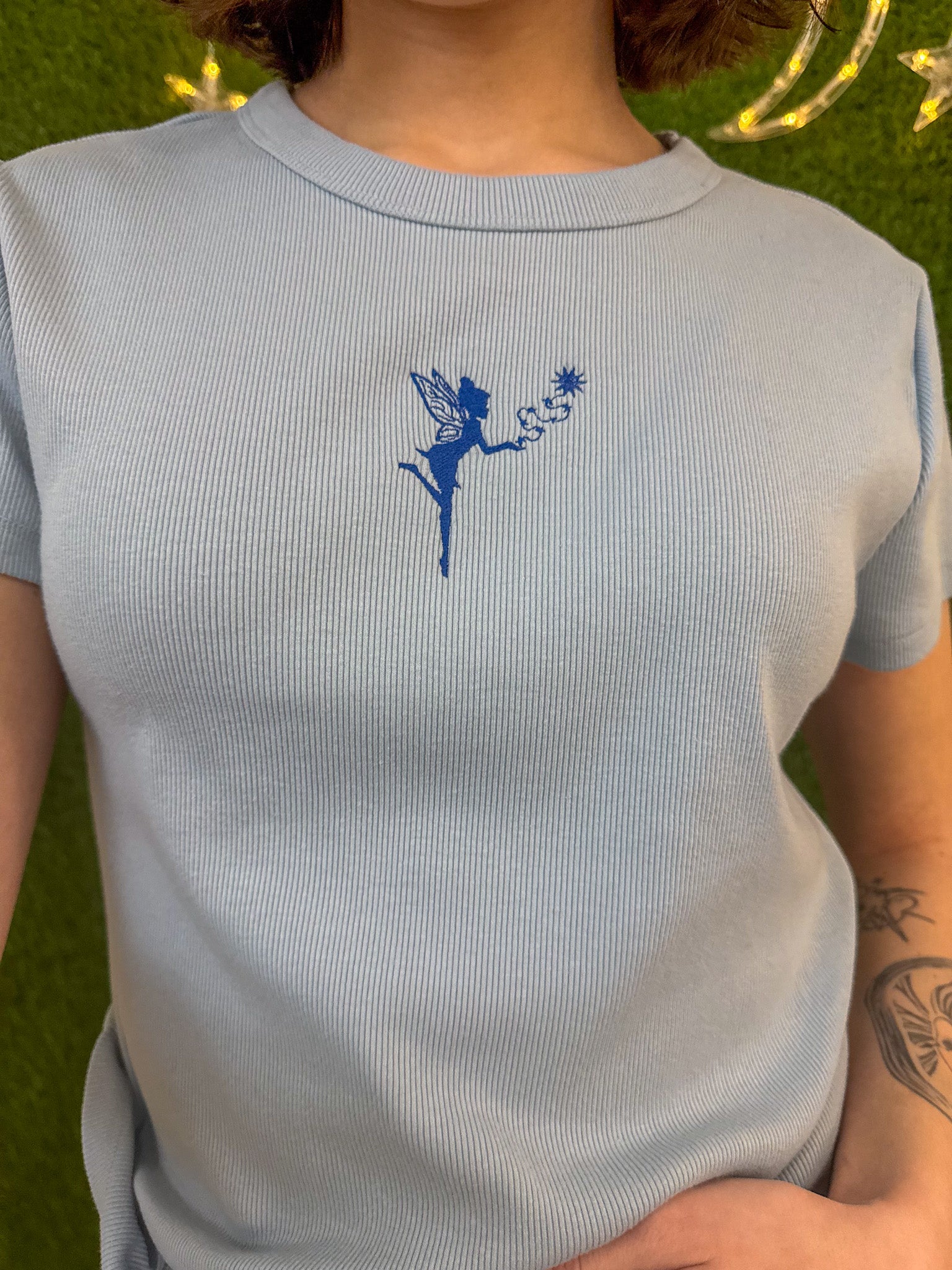 Upgrade your wardrobe with our Little Fairy Blue Ribbed Tee, featuring handcrafted embroidery. Support our small biz and the environment with this upcycled and sustainable slow fashion piece<3