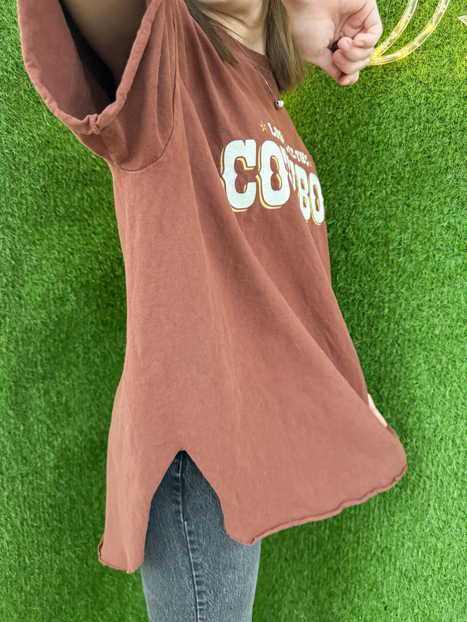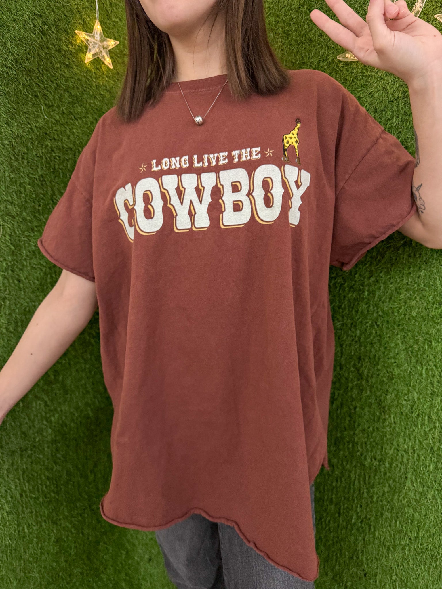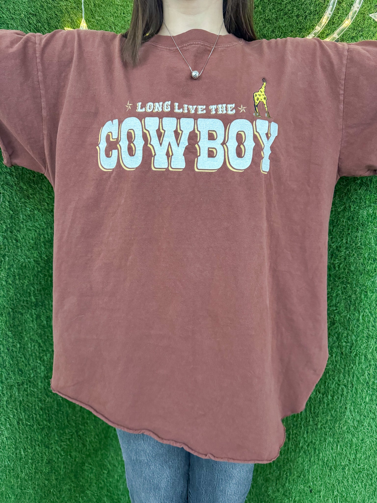 Support our small business and the environment with our Long Live the Cowboy Brown Tee. This sustainable, upcycled, and embroidered secondhand garment embodies slow fashion, making it a timeless addition to your wardrobe. Feel good about your purchase while looking great<3
