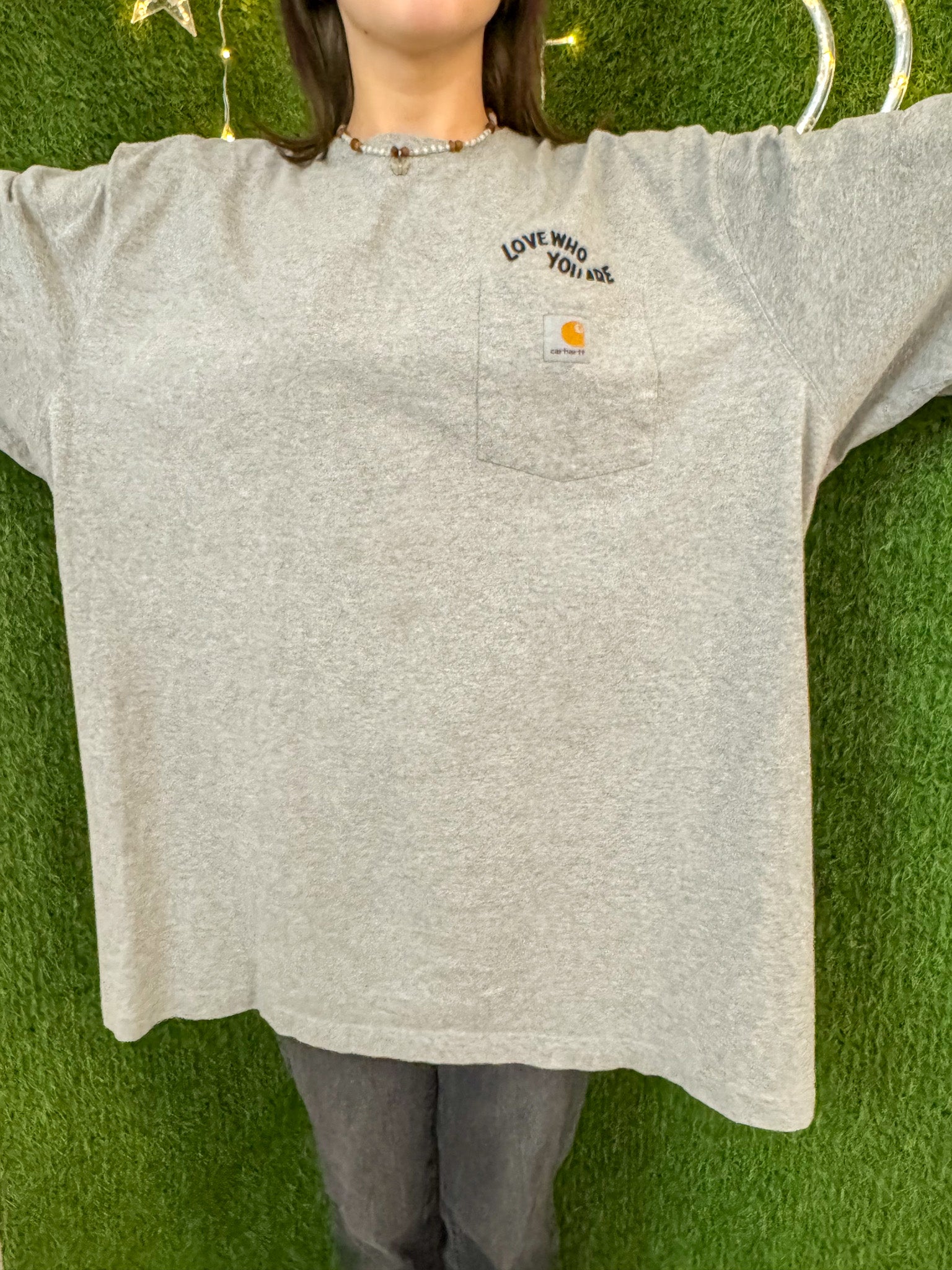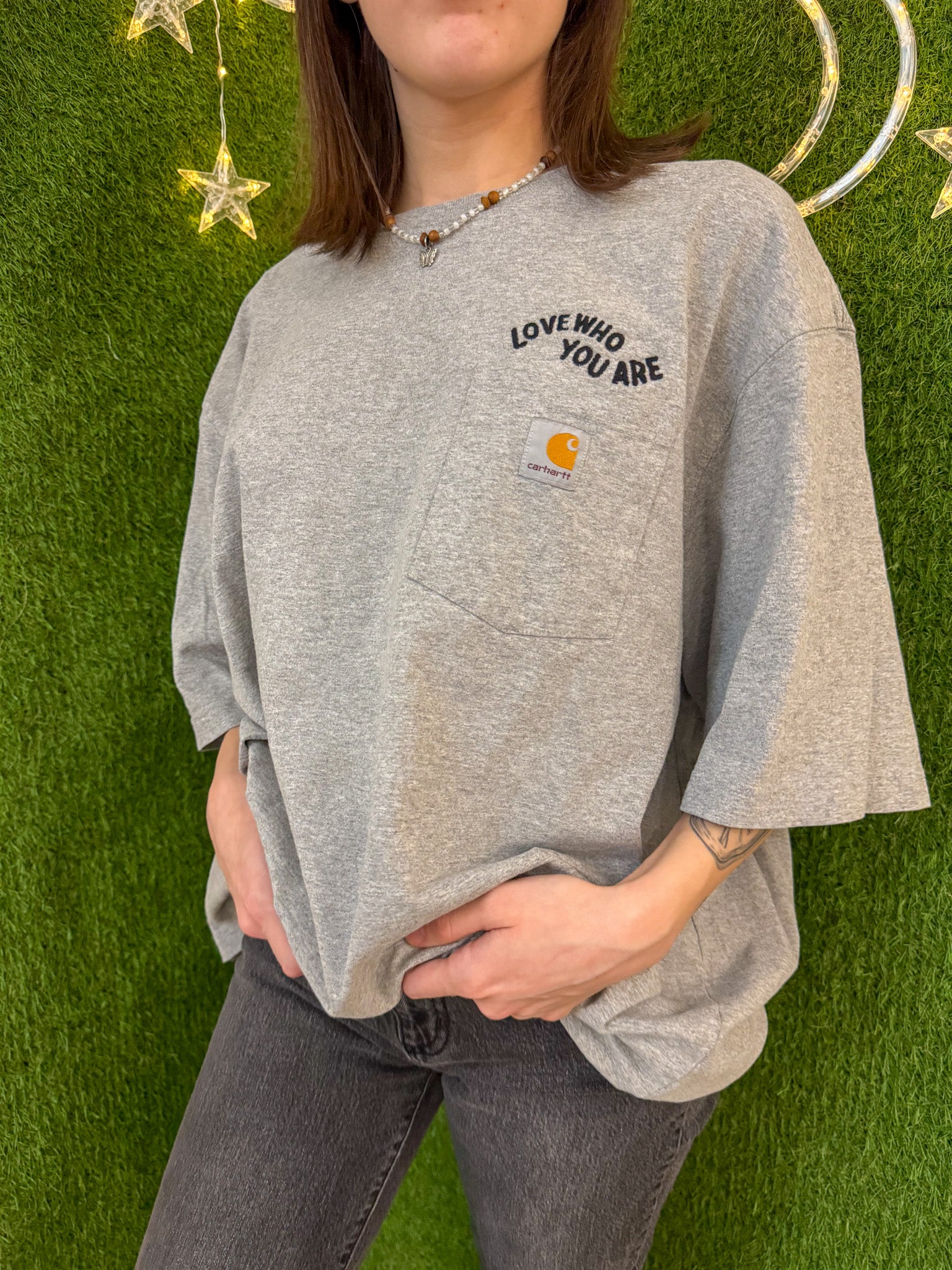 Embrace your unique style with our Love Who You Are Carhartt Pocket Tee. This embroidered shirt not only supports our small biz, but is also upcycled from a secondhand garment, making it a sustainable and slow fashion choice. Love yourself and the planet in this one-of-a-kind tee!