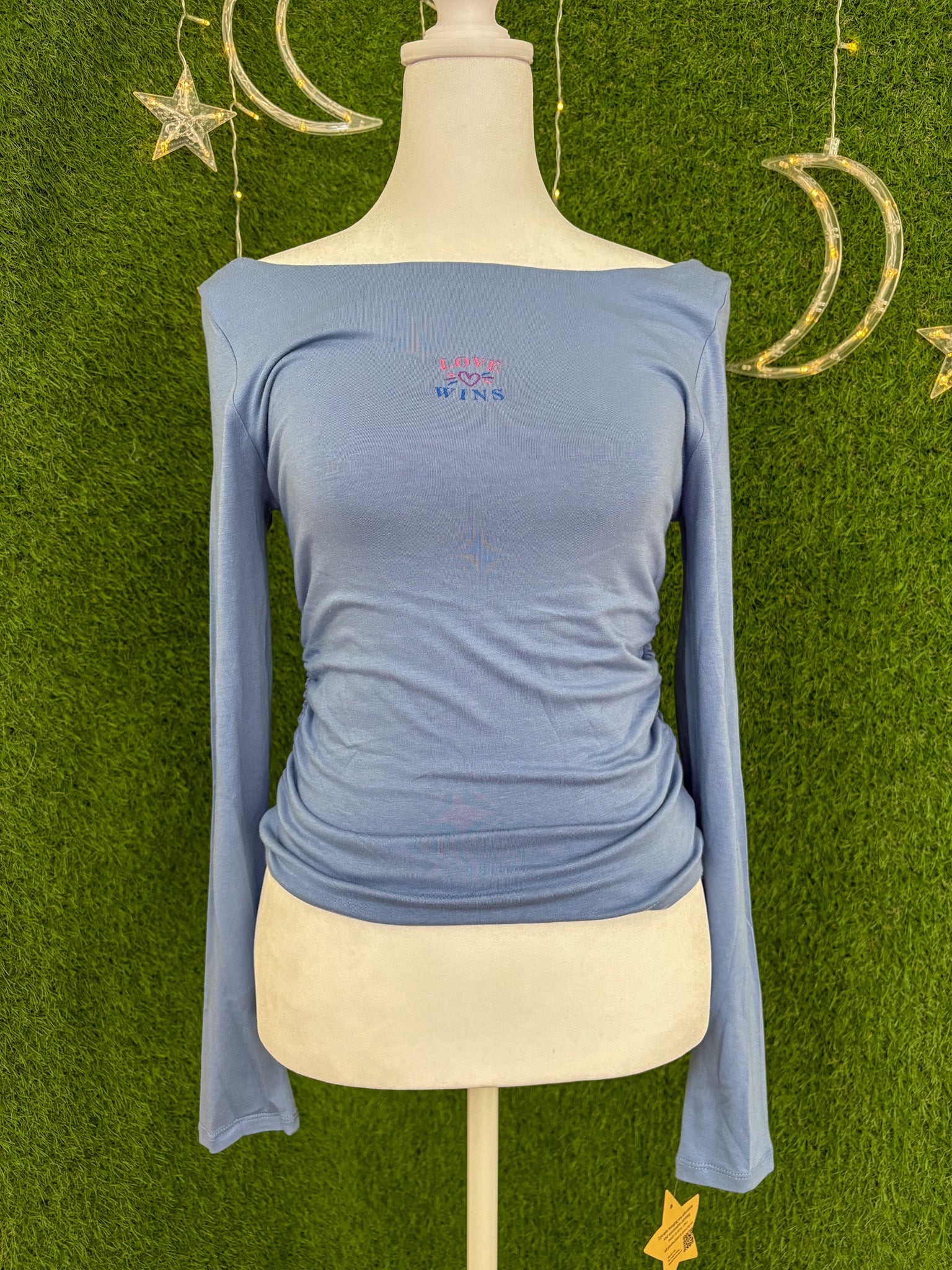 The Love Wins Ribbed Cinched Sides Longsleeve is an embroidered, upcycled piece made from secondhand fabric. Supporting small businesses, it embodies sustainable, slow fashion with a stylish, eco-friendly design!!