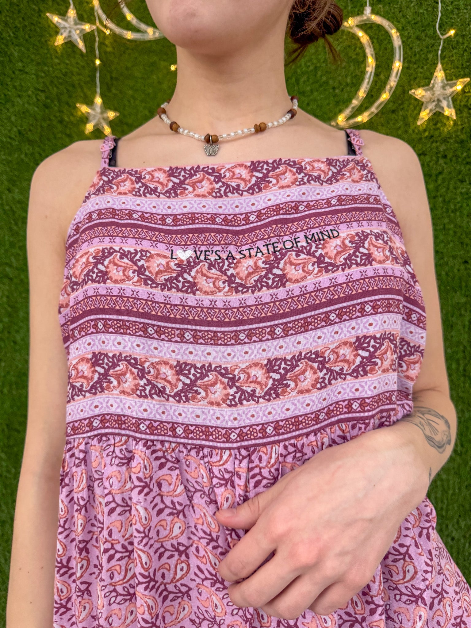 Embrace sustainable fashion with our Love's a State of Mind Pink Halter Dress. Featuring delicate embroidery and made from upcycled, secondhand materials, this dress not only supports our small business but also embodies the slow fashion movement. Look stylish while making a positive impact on the environment!
