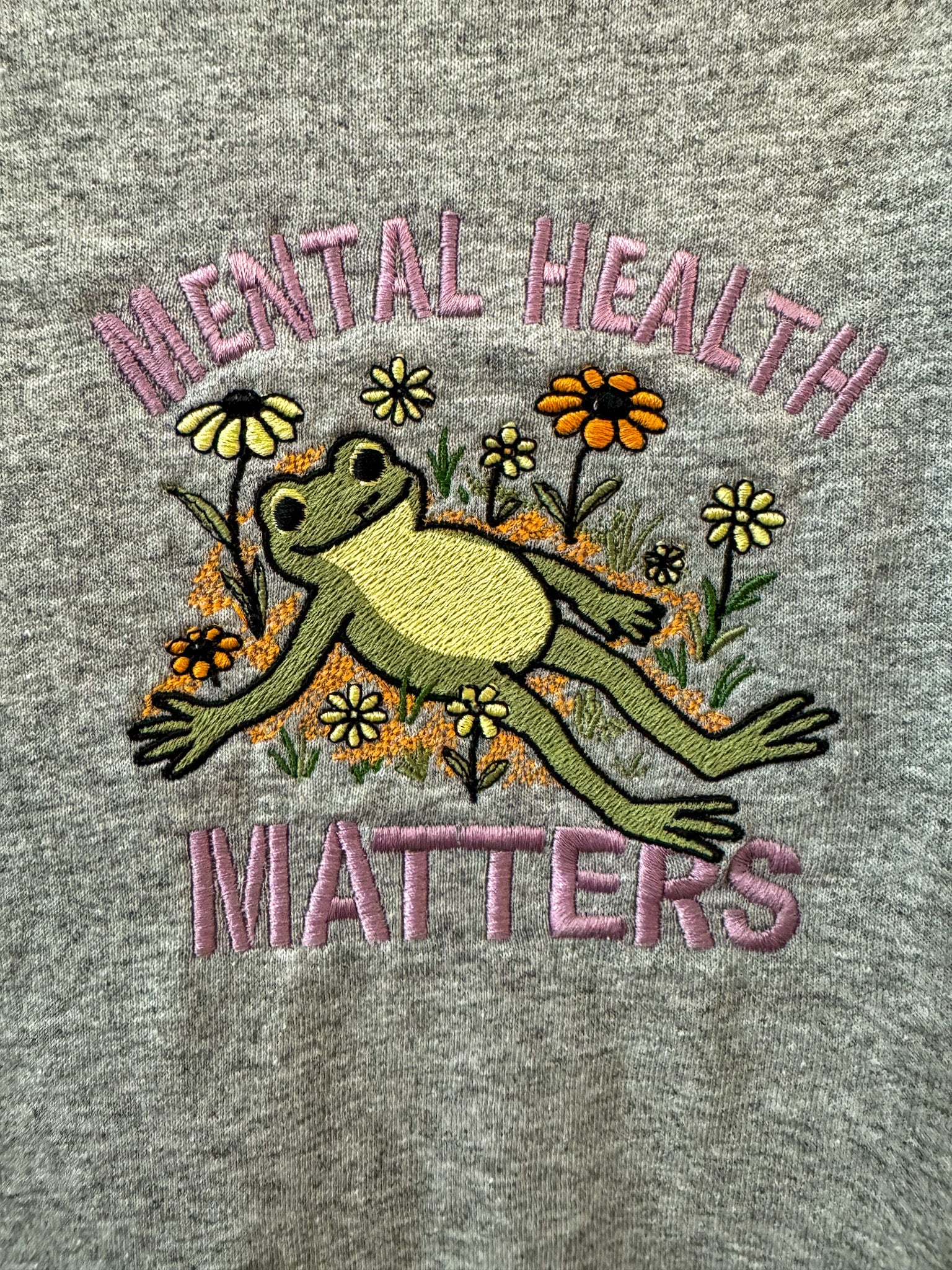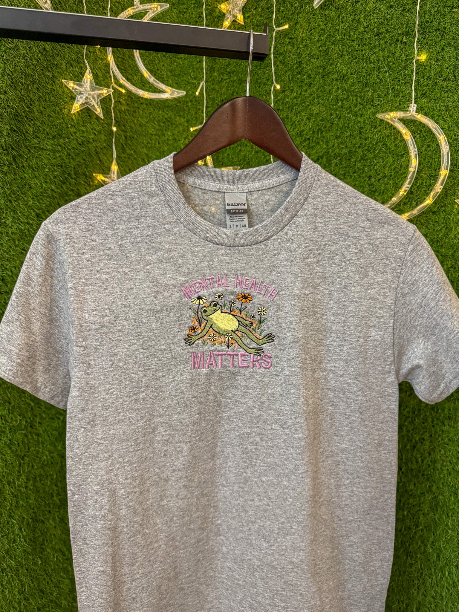 Our Mental Health Matters Frog Grey T-Shirt combines advocacy with sustainability. This charming embroidered tee features a thoughtful design on a carefully selected secondhand grey shirt, giving new life to existing textiles. This upcycled garment represents our commitment to slow fashion principles and environmental responsibility. By purchasing, you're supporting our small business while making a meaningful statement about mental health awareness. Embrace conscious consumption with this unique, earth-friendly piece!