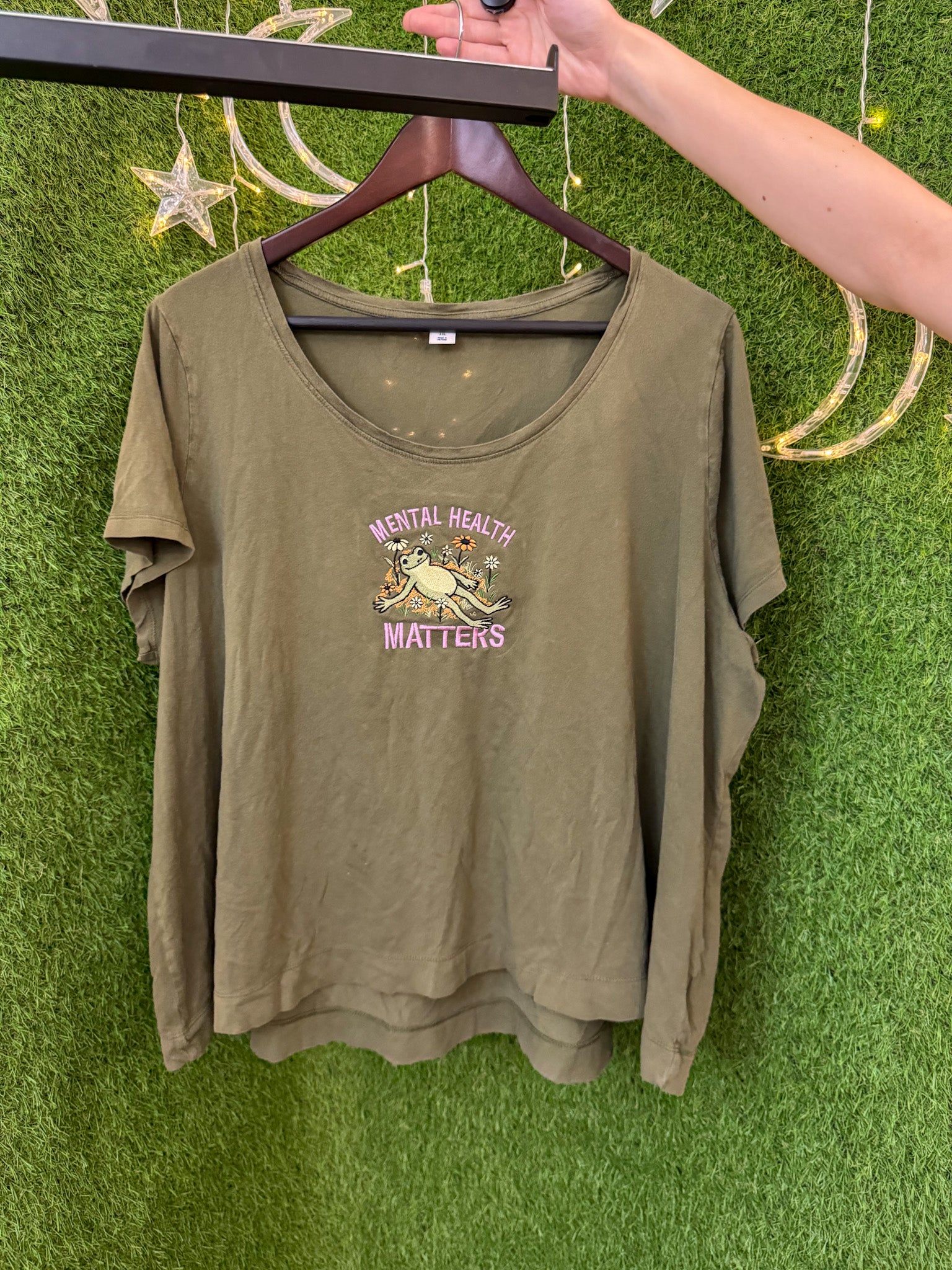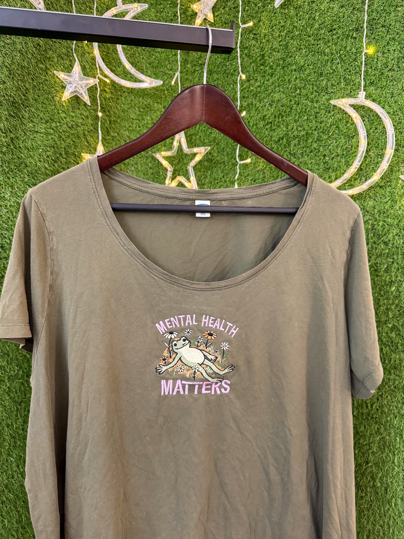 This upcycled scoop neck t-shirt features a charming embroidered frog alongside the message "Mental Health Matters." This piece is thoughtfully created from a secondhand garment, embracing slow fashion principles and sustainability. By choosing this mindful apparel, you're supporting our small business while reducing textile waste and making an important statement about mental health awareness!
