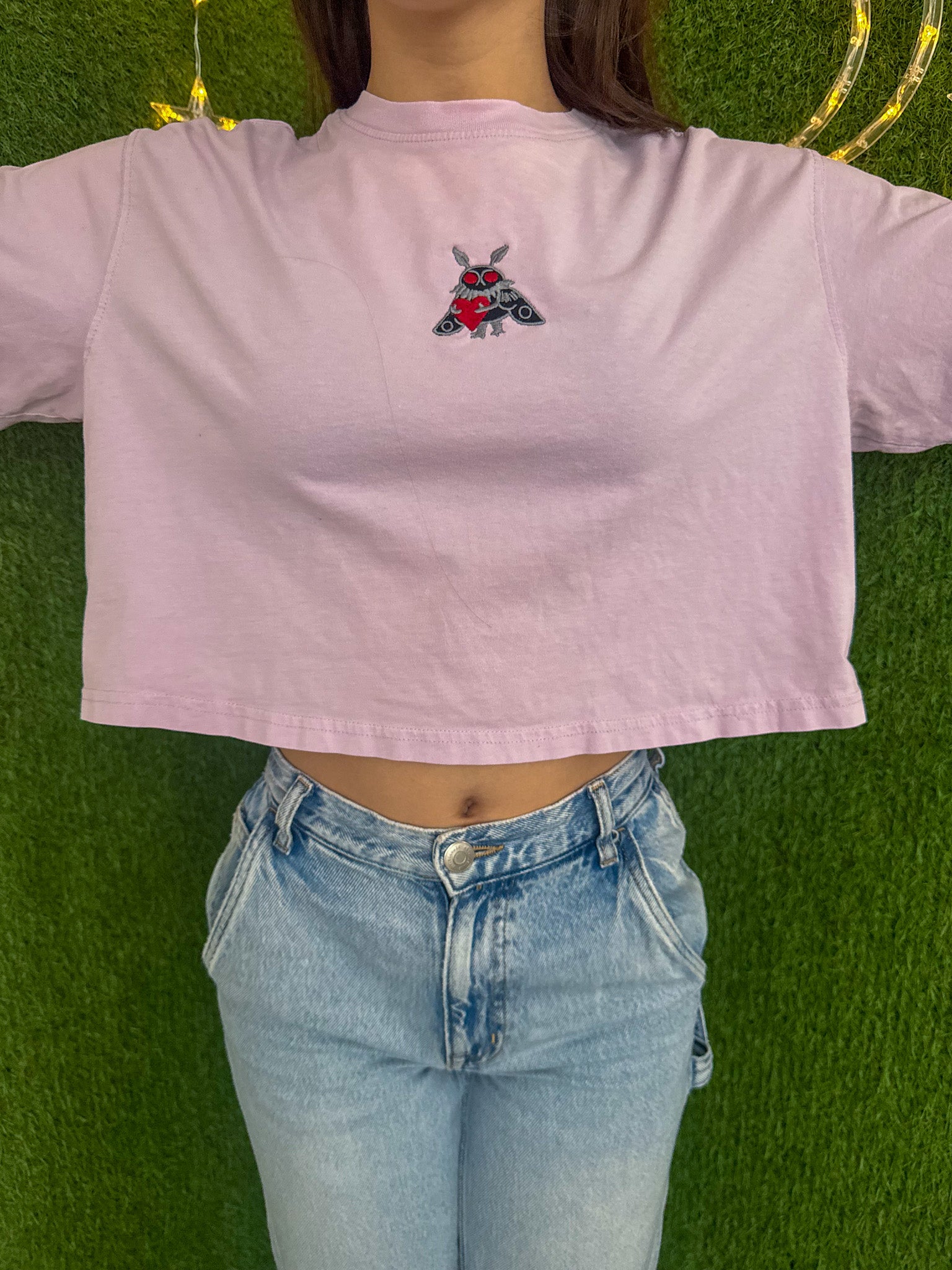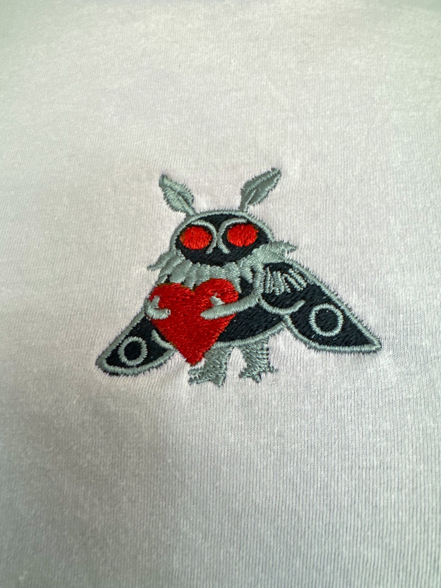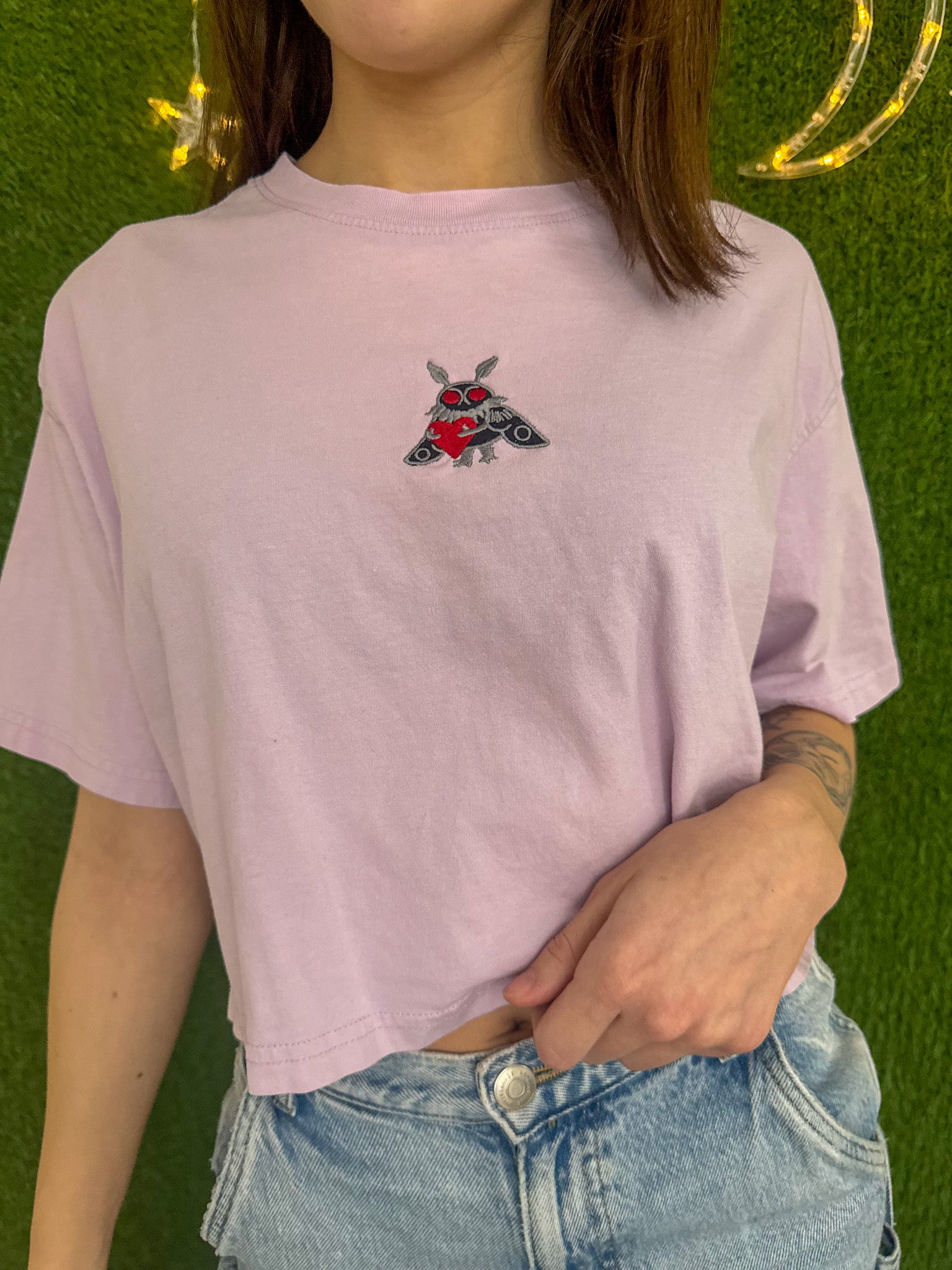 Support our small business while being eco-friendly with our Mothman Cropped Tee. This sustainably-made, upcycled and embroidered secondhand garment will elevate your wardrobe while supporting slow fashion<3