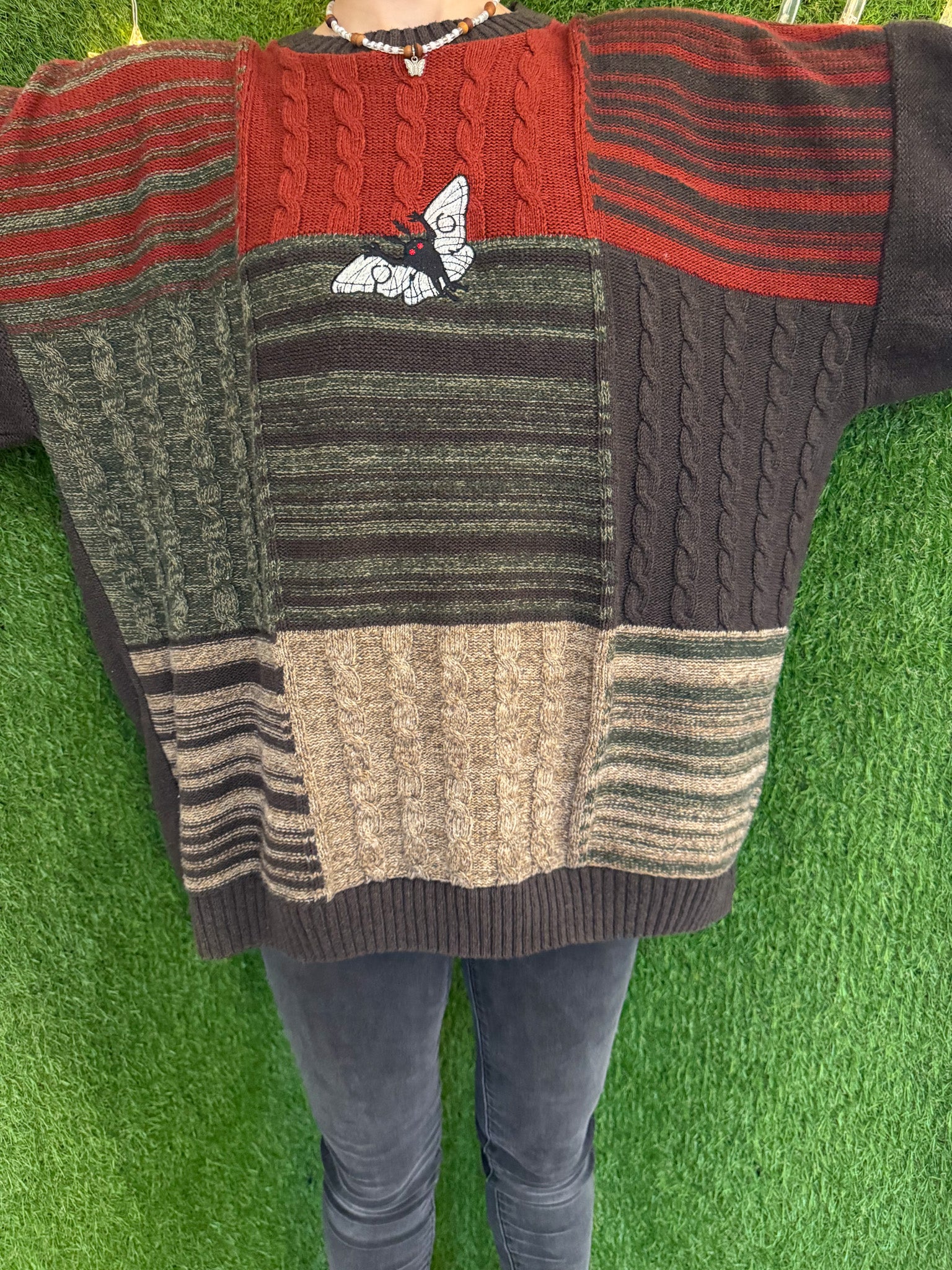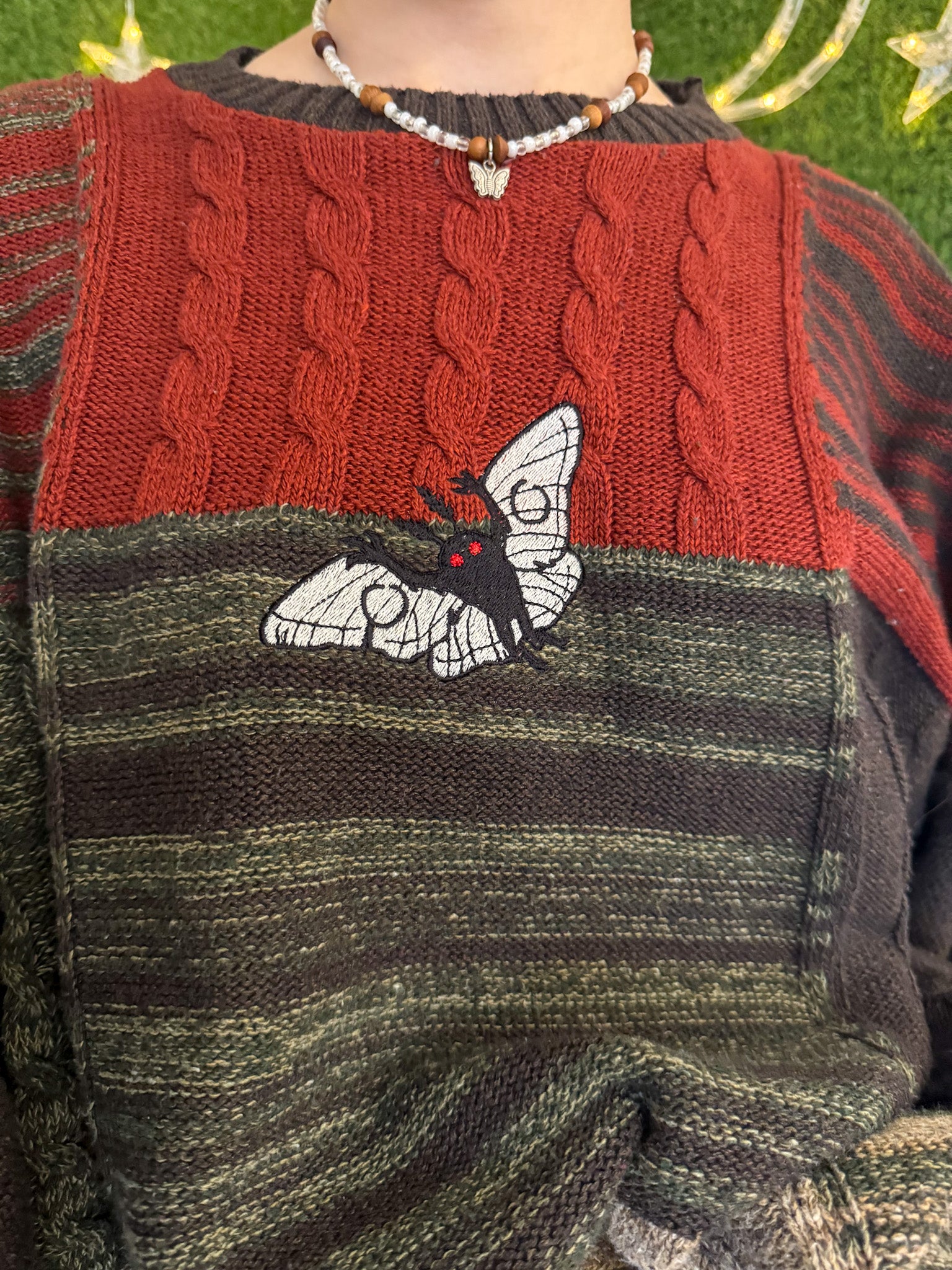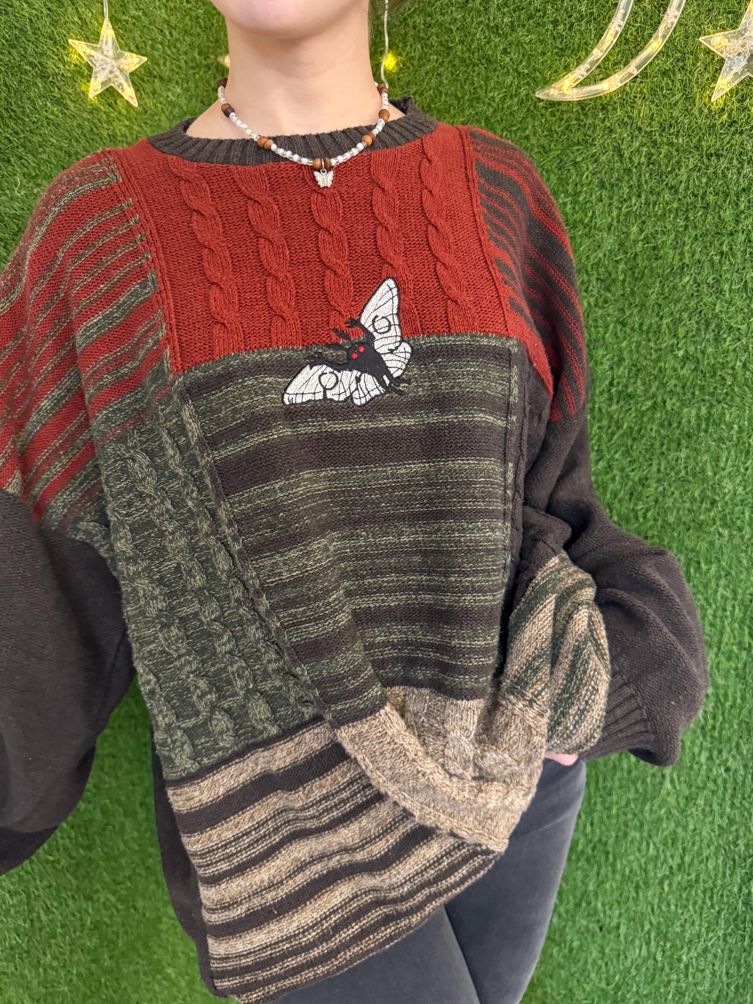 Get funky with our Mothman Sweater! This sustainable, upcycled and embroidered garment supports our small biz and slow fashion. Rock this unique secondhand piece and make a statement while being environmentally conscious. Add it to your wardrobe today!