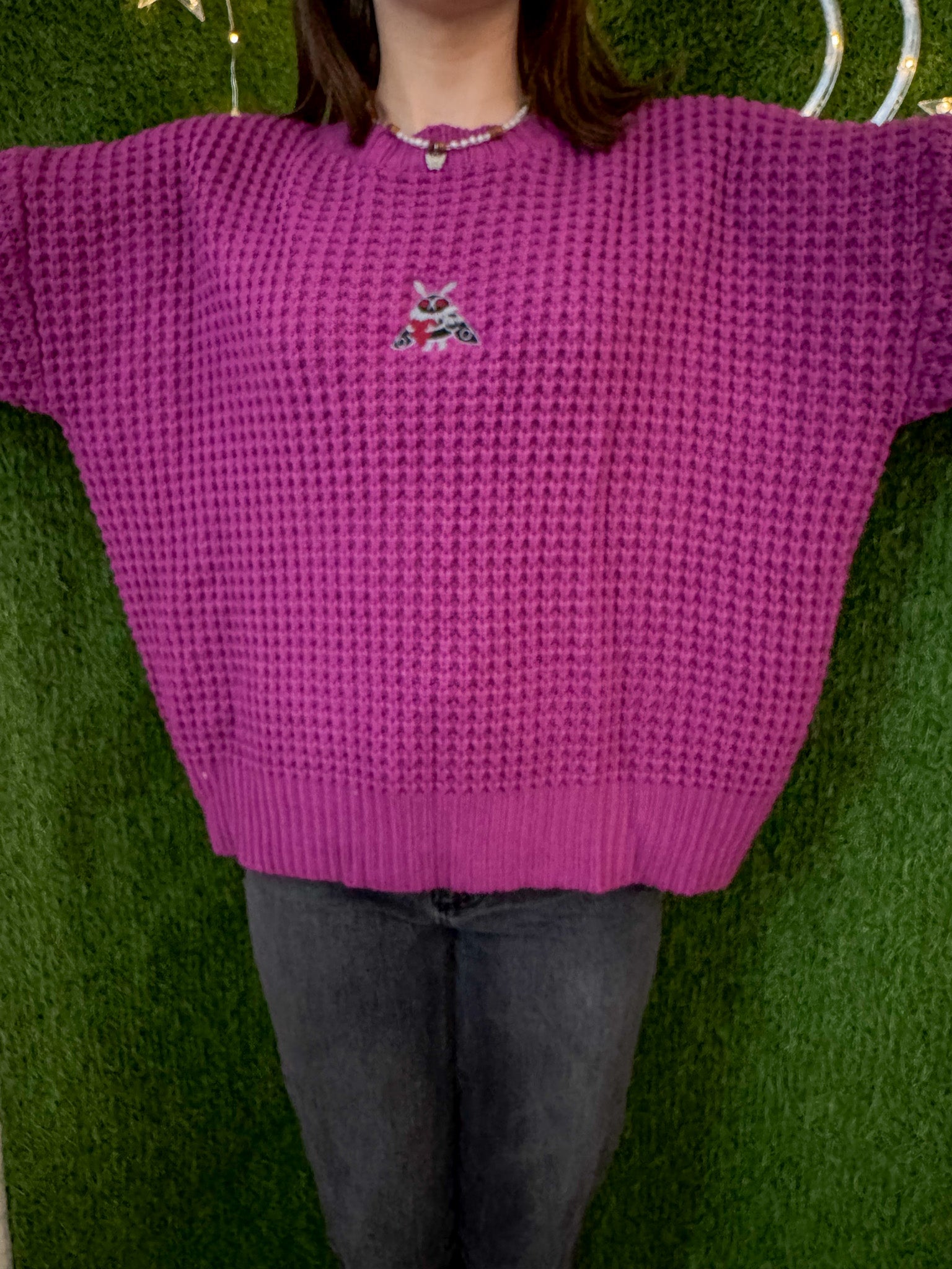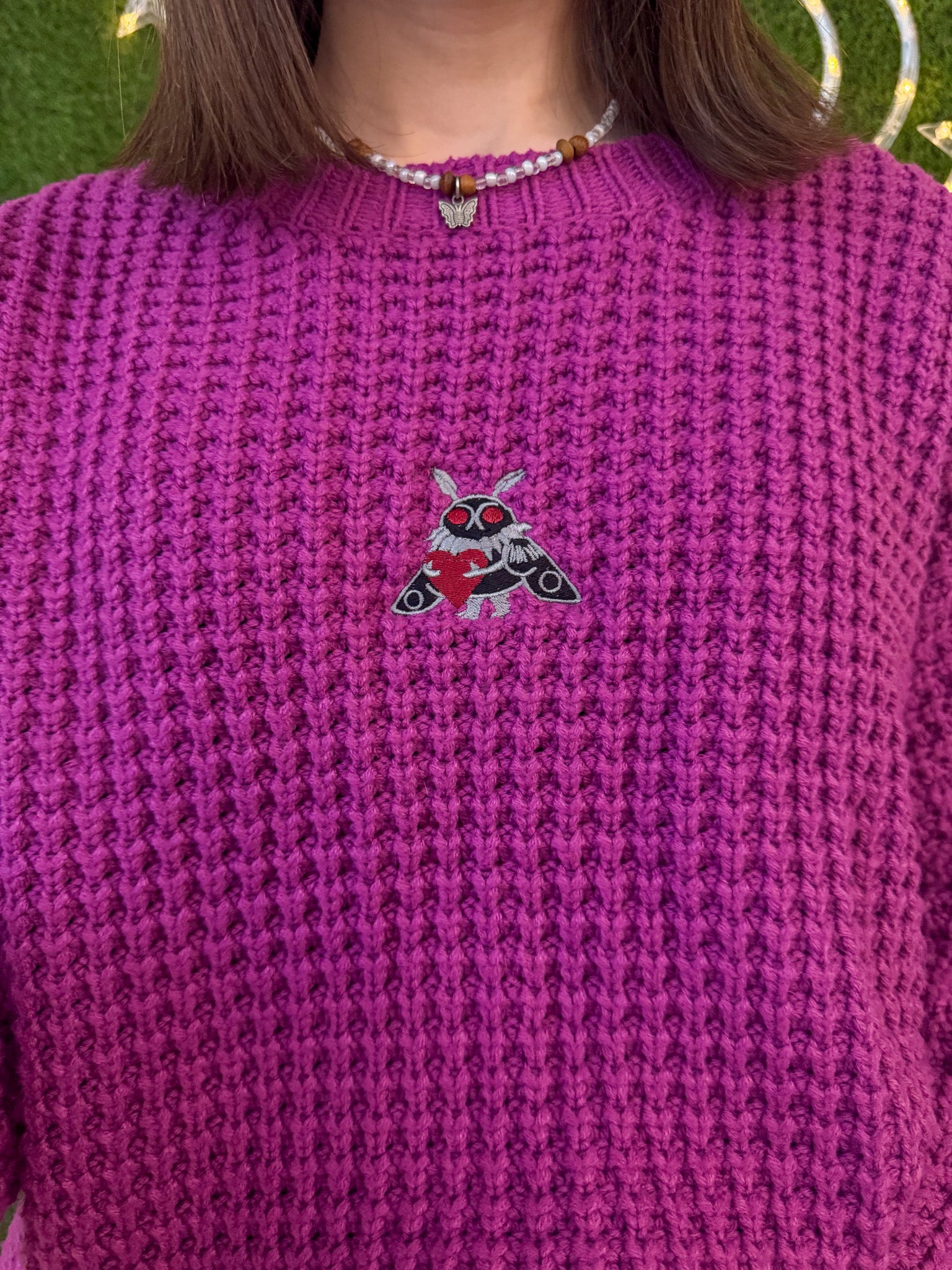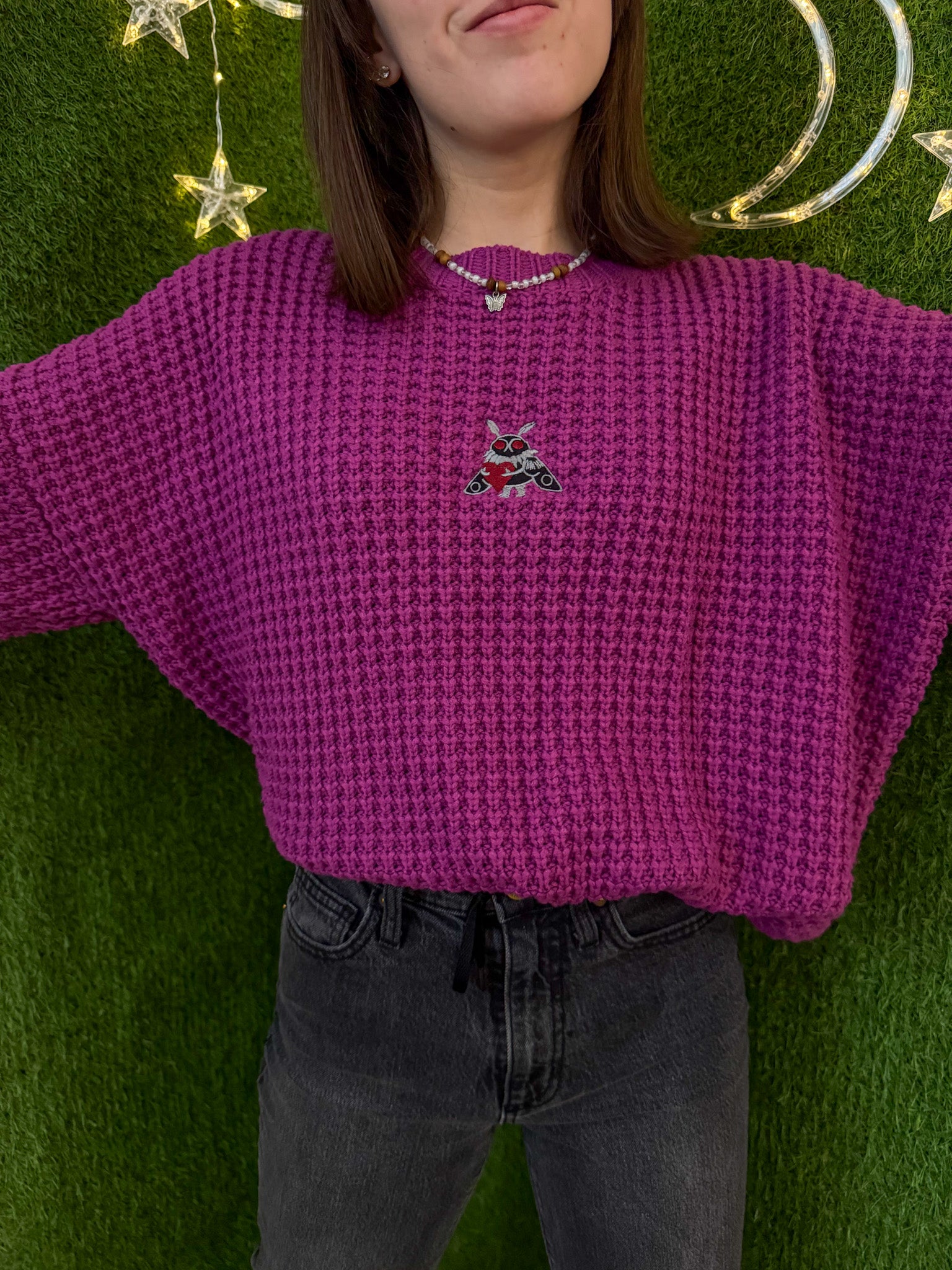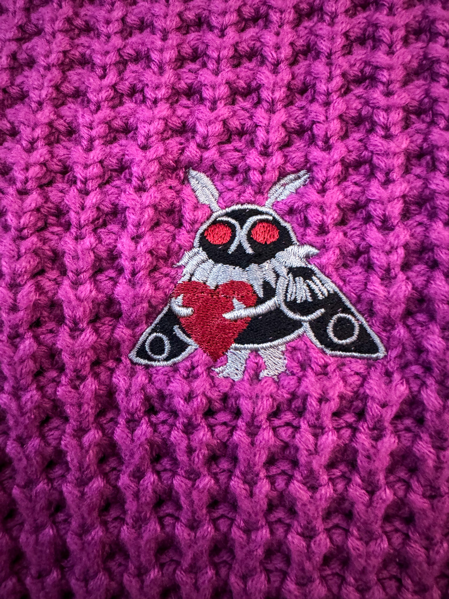Get cozy with the Mothman in this magenta sweater, embroidered with love. Made from upcycled and sustainable materials, this secondhand garment not only supports our small biz, but also promotes slow fashion. Embrace your unique and quirky style while making a positive impact!