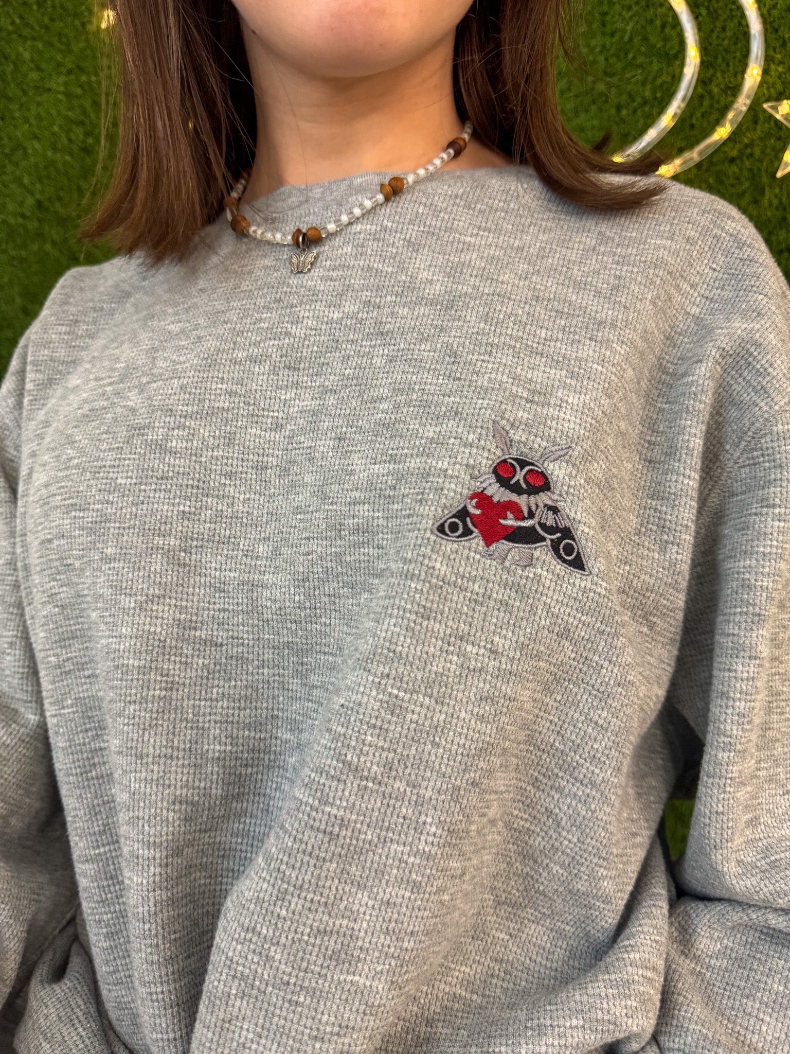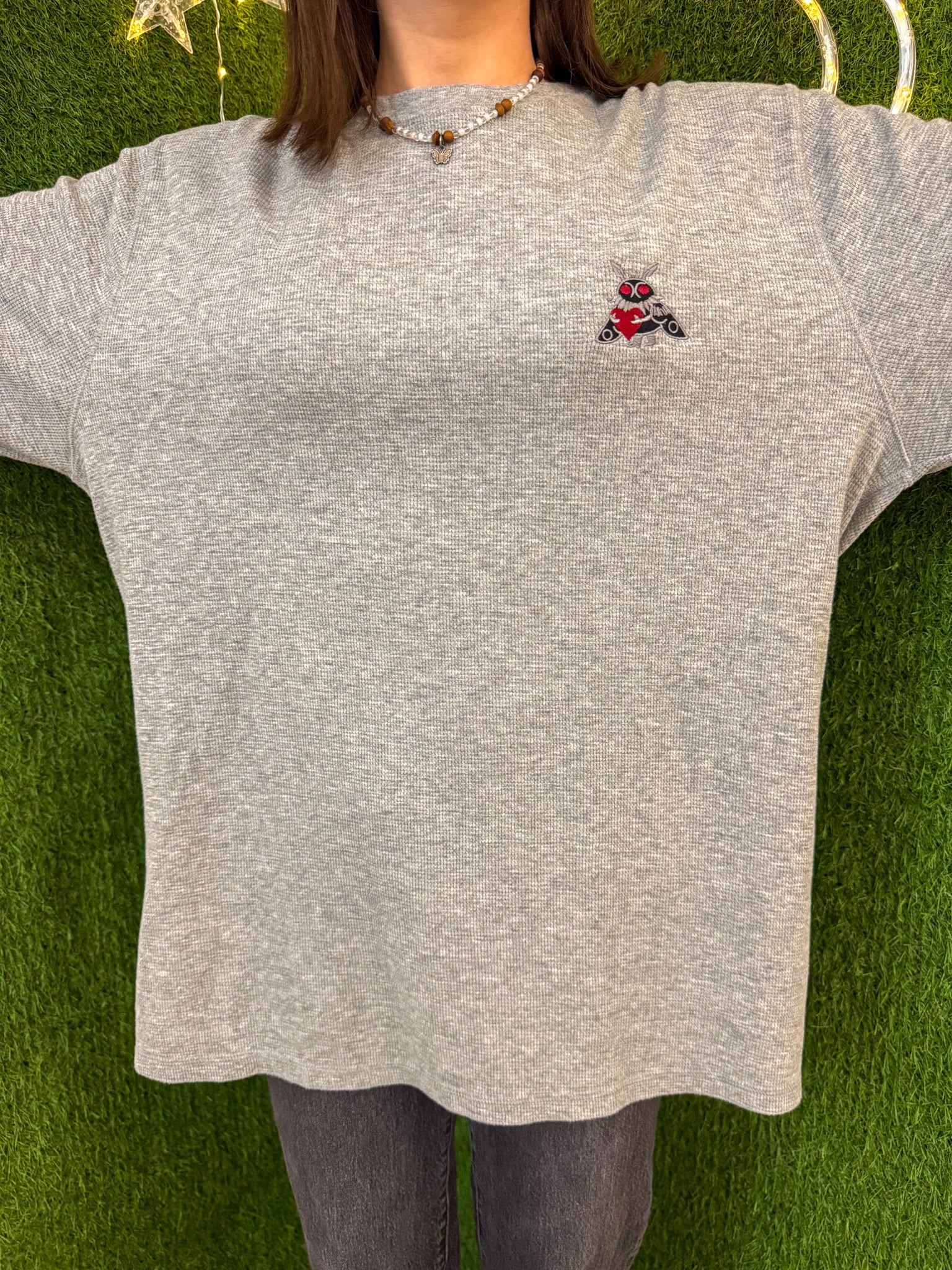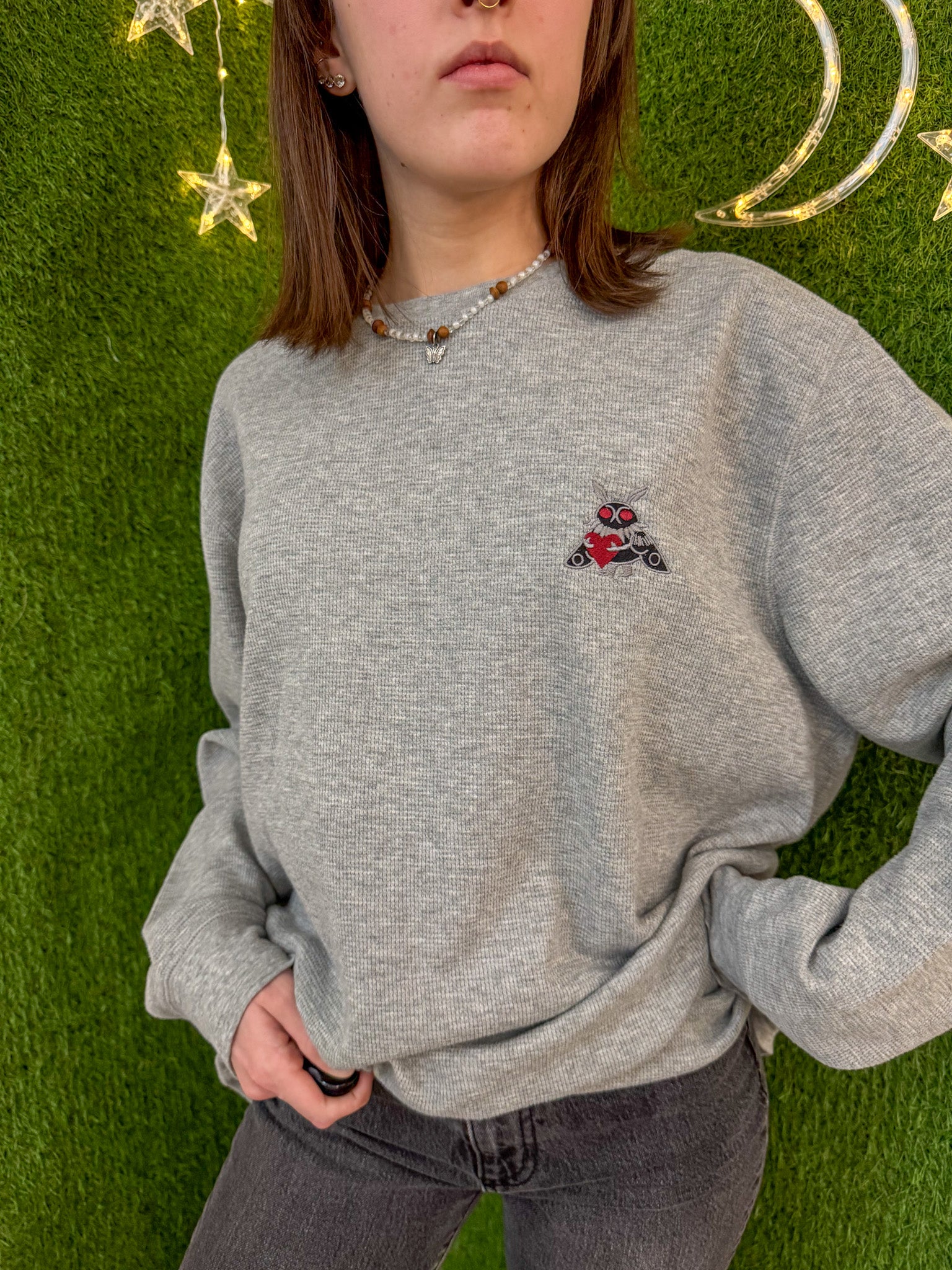 Get cozy with our Mothman Hugging a Heart Thermal! This embroidered long sleeve is more than just a cute design. Support our small biz while wearing a sustainable, upcycled garment. Slow fashion never looked so good!