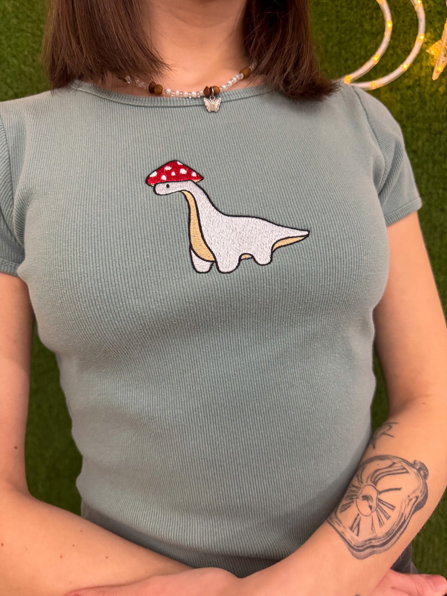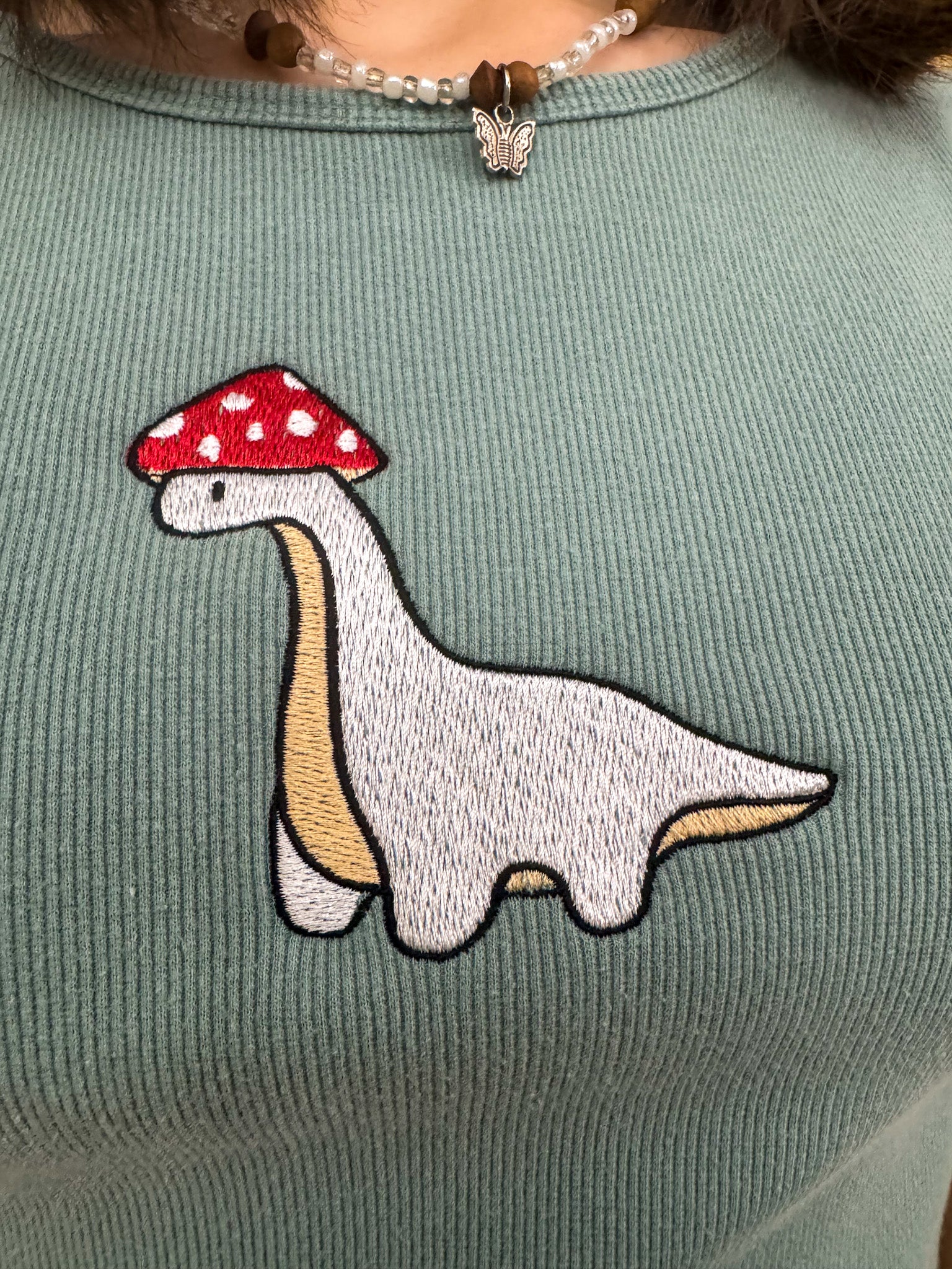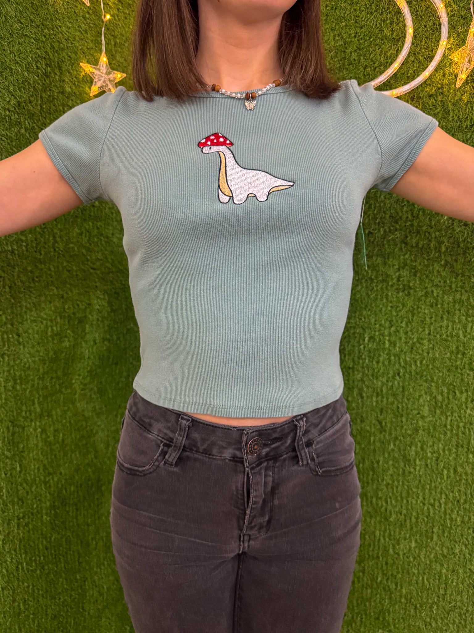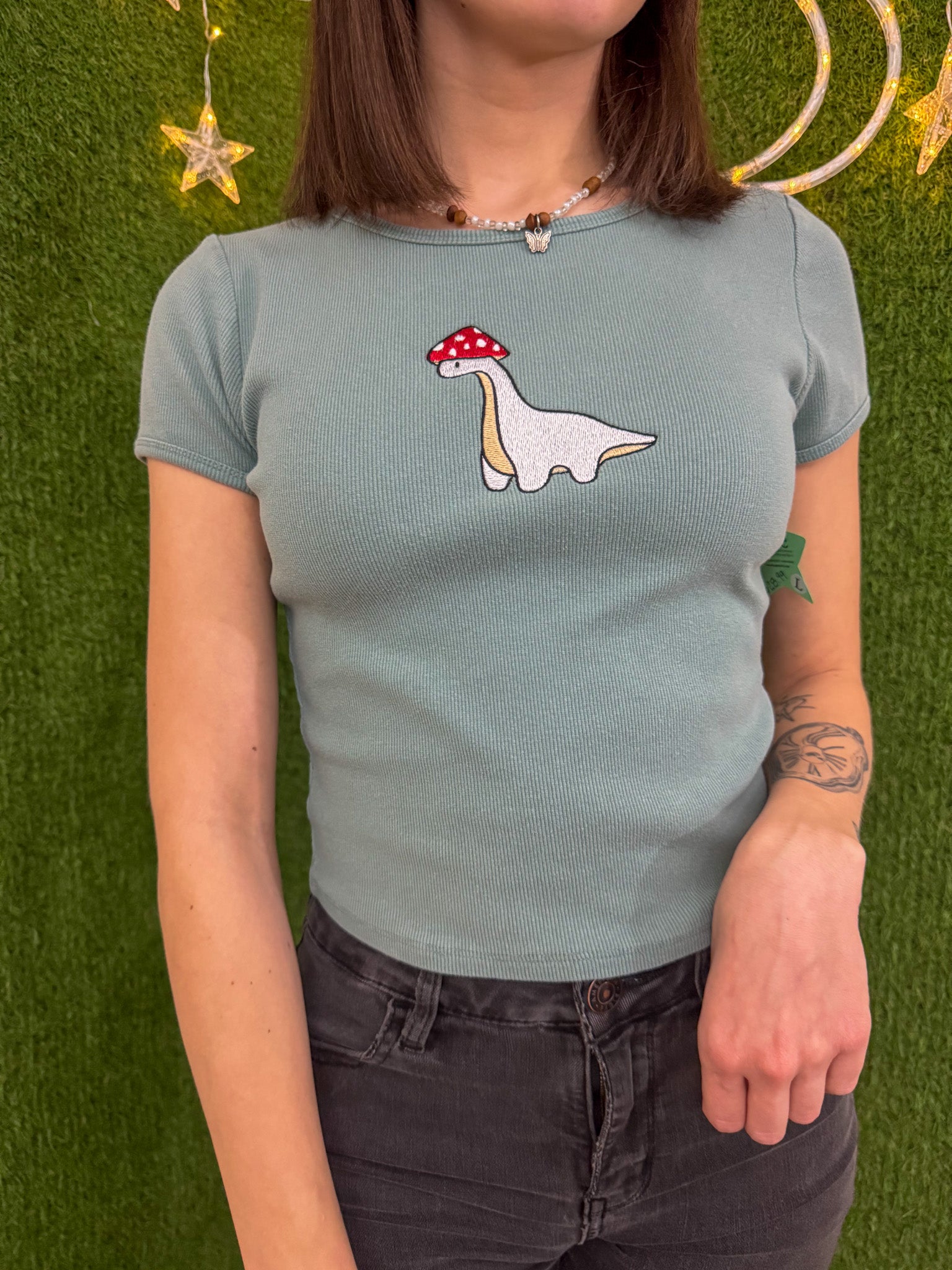 Looking for a unique, sustainable and stylish addition to your wardrobe? Look no further than our Mushroom Dino Baby Tee! Made from upcycled materials and embroidered with care, this secondhand garment supports our small biz and promotes slow fashion. Join the fun and rock this playful tee now!